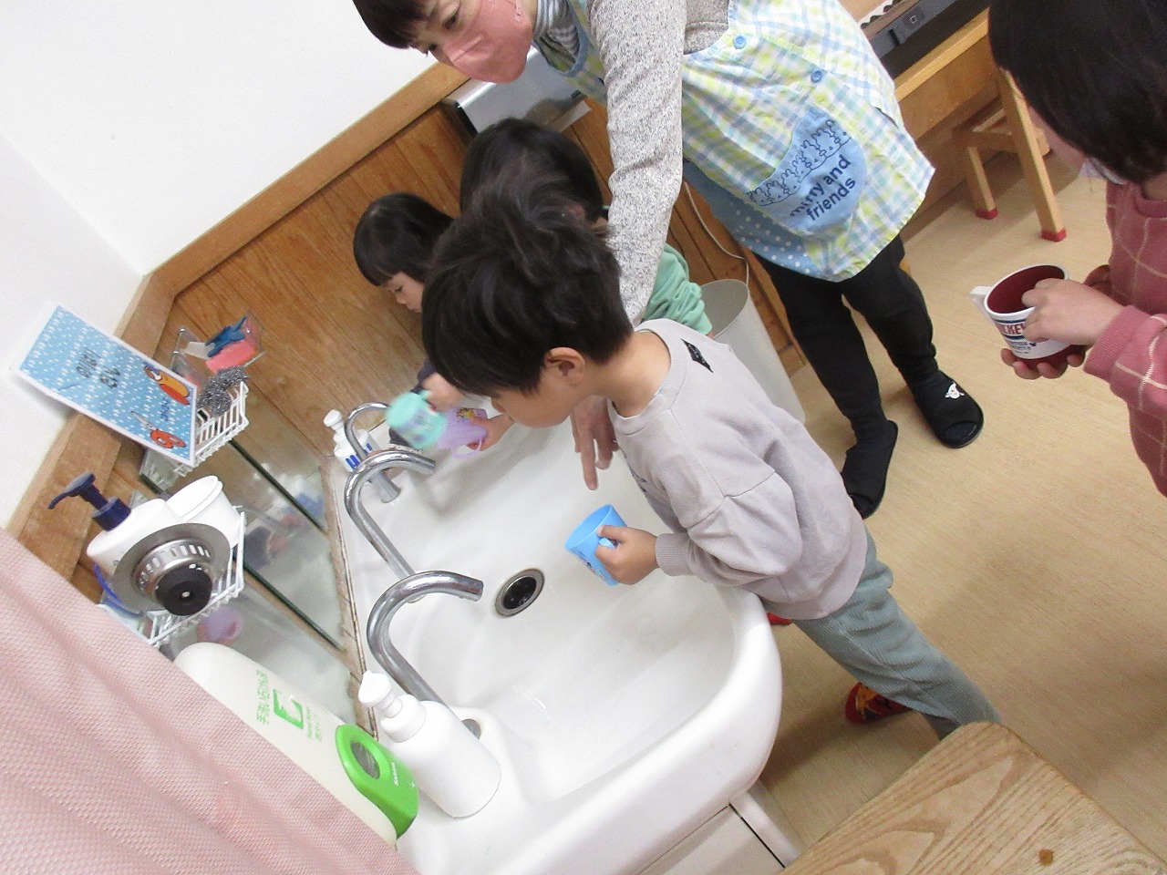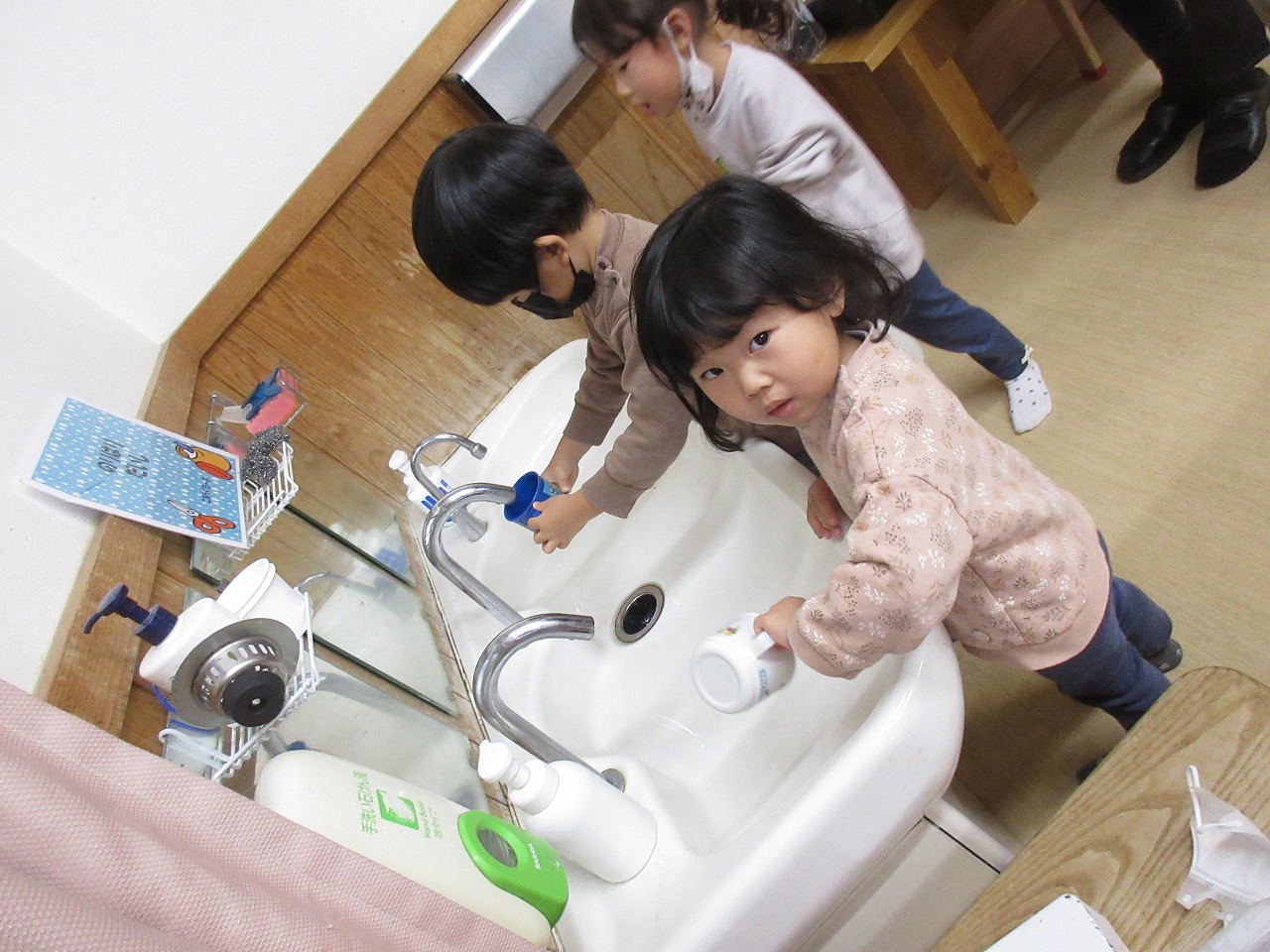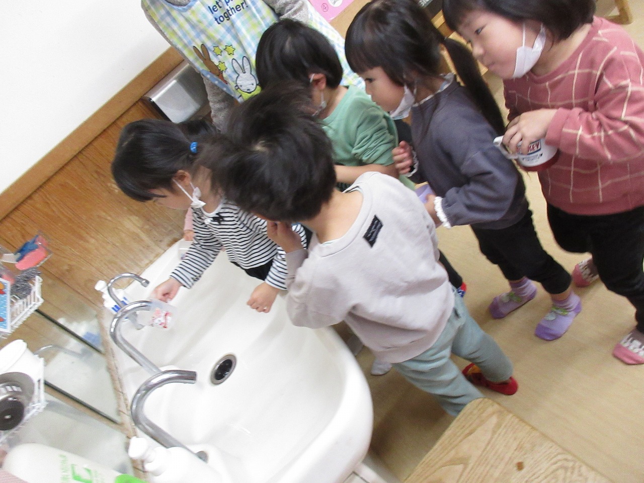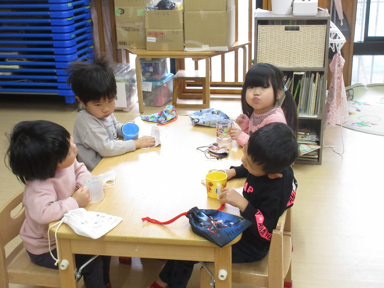 今日からうめ組のフッ化物洗口法(以下、フッ素洗口と略します)が始まりました。以前はさくら組やもも組のしている様子をみて覚えていましたが、今年は感染予防の為、歯磨きやフッ素洗口を控えていたこともあり久しぶりに聞くフッ素洗口の音楽ややり方を興味深く聞いていました。当園は平成22年度よりフッ素洗口を実施しており10年表彰も受けています。嘱託医の桑野先生の指導のもと、おやつの後1回、週5日実施しています。フッ素は無味無臭で無害の洗口液です。歯を丈夫にするだけでなく歯の表面をツルツルにして汚れをつきにくく落としやすくしています。アレルギーのある子や障がいのある子にもできる最も簡単な虫歯予防です。実際にフッ素洗口を始めてから虫歯の子どもが減りました。今回うめ組21名全員の同意書を得て実施しています。コップの準備から洗口液の含み方、リュックに巾着袋を入れるまで練習してみましたがとても上手にできました。乳歯から永久歯に生え変わる大切な幼児期だからこそこの機会に歯磨きとフッ素洗口を習慣づけてほしいと思います。