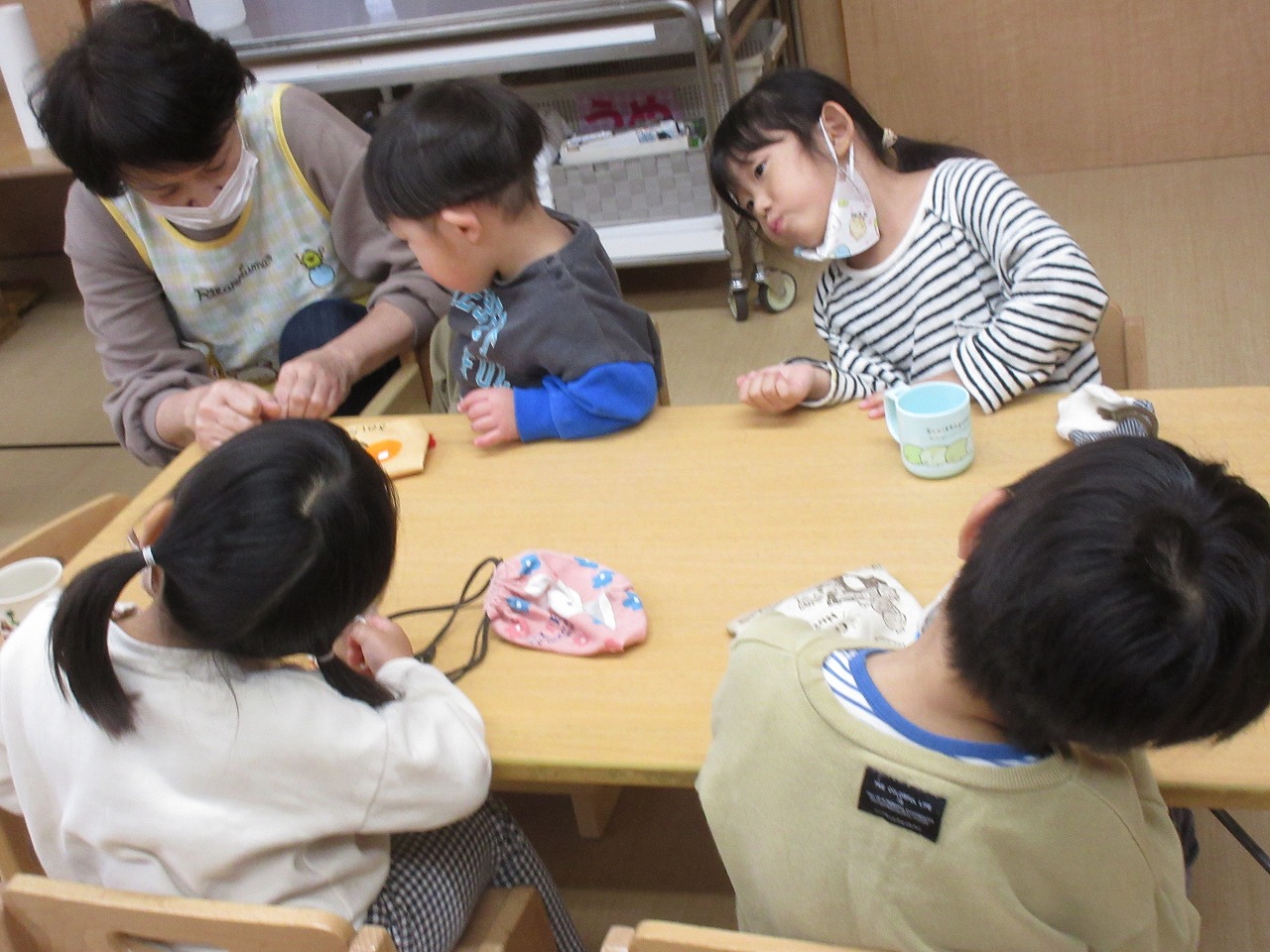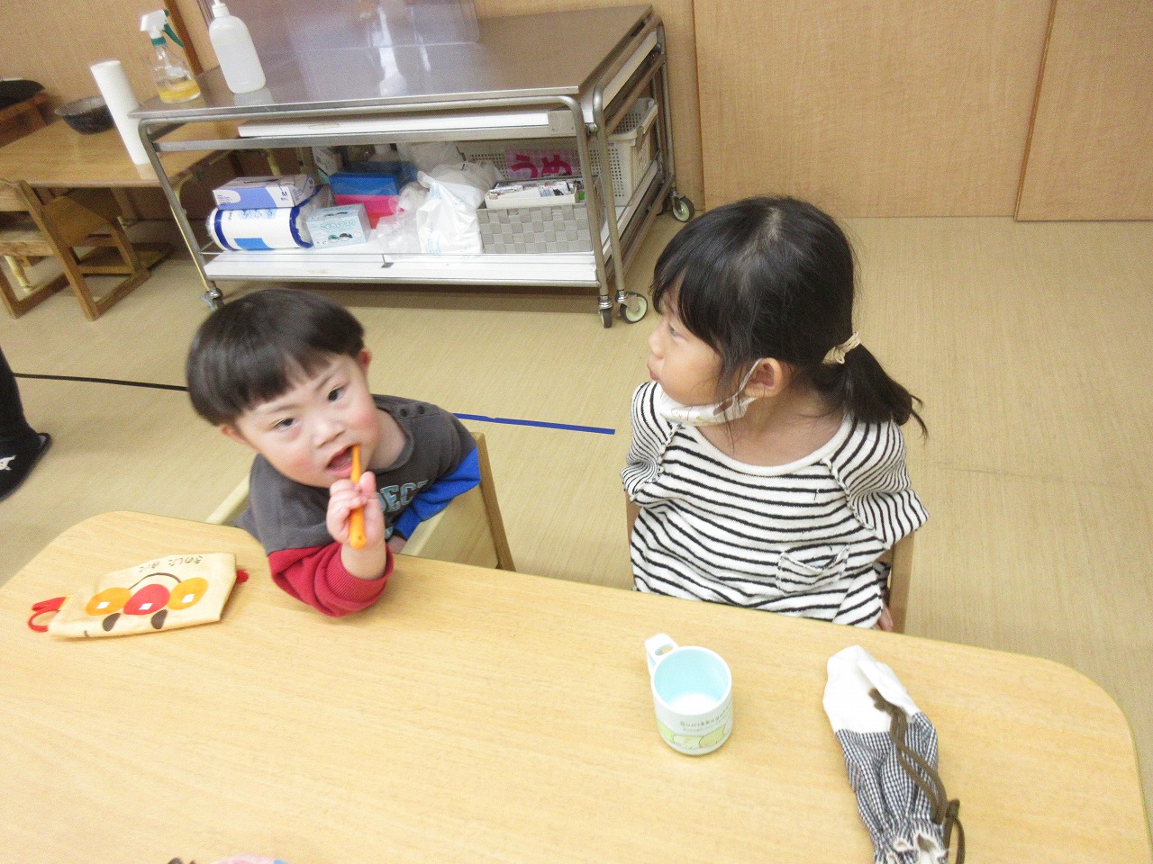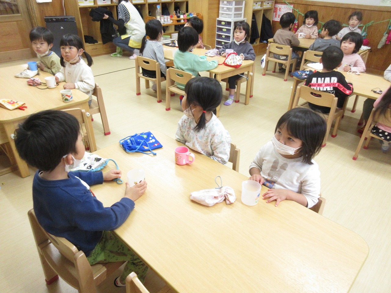 今日からうめ組のフッ化物洗口法(以下、フッ素洗口と略します)が始まりました。以前はさくら組やもも組のしている様子をみて覚えていましたが、今年は感染予防の為、歯磨きやフッ素洗口を控えていたこともあり久しぶりに聞くフッ素洗口の音楽ややり方を興味深く聞いていました。当園は平成22年度よりフッ素洗口を実施しており10年表彰も受けています。嘱託医の桑野先生の指導のもと、おやつの後1回、週5日実施しています。フッ素は無味無臭で無害の洗口液です。歯を丈夫にするだけでなく歯の表面をツルツルにして汚れをつきにくく落としやすくしています。アレルギーのある子や障がいのある子にもできる最も簡単な虫歯予防です。実際にフッ素洗口を始めてから虫歯の子どもが減りました。今回うめ組21名全員の同意書を得て実施しています。コップの準備から洗口液の含み方、リュックに巾着袋を入れるまで練習してみましたがとても上手にできました。乳歯から永久歯に生え変わる大切な幼児期だからこそこの機会に歯磨きとフッ素洗口を習慣づけてほしいと思います。
