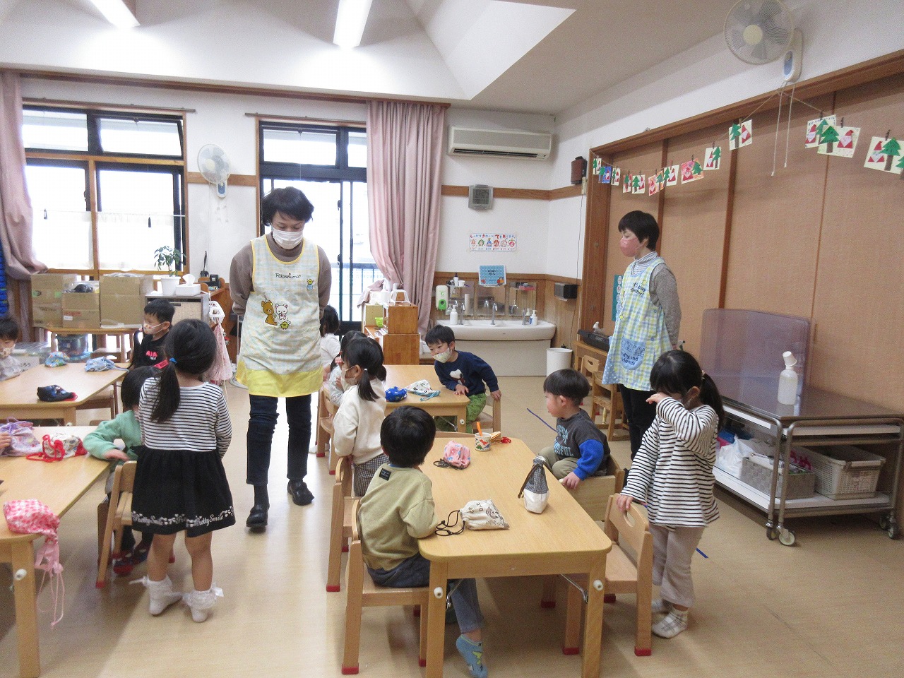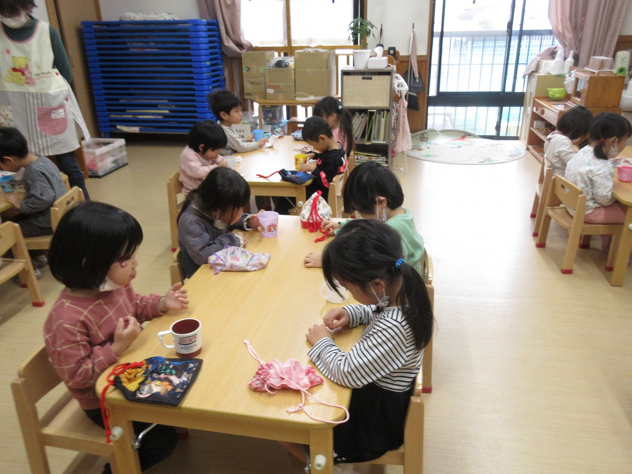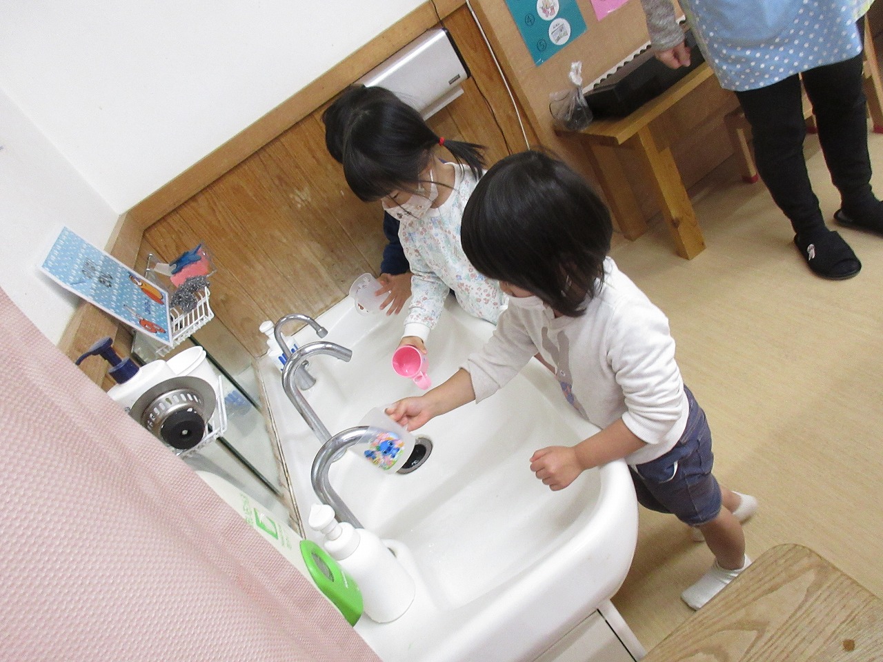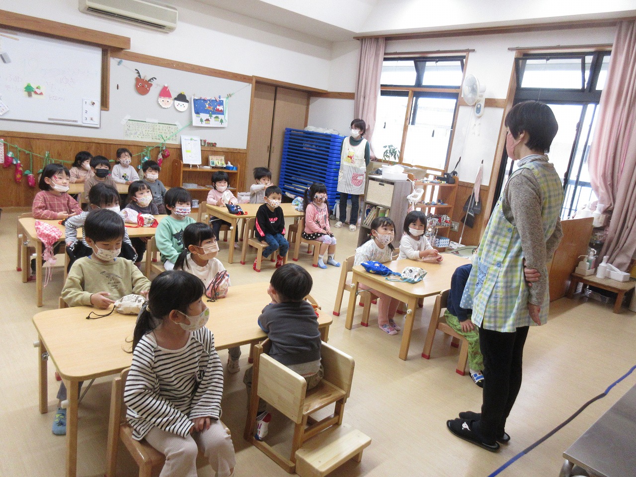 今日からうめ組のフッ化物洗口法(以下、フッ素洗口と略します)が始まりました。以前はさくら組やもも組のしている様子をみて覚えていましたが、今年は感染予防の為、歯磨きやフッ素洗口を控えていたこともあり久しぶりに聞くフッ素洗口の音楽ややり方を興味深く聞いていました。当園は平成22年度よりフッ素洗口を実施しており10年表彰も受けています。嘱託医の桑野先生の指導のもと、おやつの後1回、週5日実施しています。フッ素は無味無臭で無害の洗口液です。歯を丈夫にするだけでなく歯の表面をツルツルにして汚れをつきにくく落としやすくしています。アレルギーのある子や障がいのある子にもできる最も簡単な虫歯予防です。実際にフッ素洗口を始めてから虫歯の子どもが減りました。今回うめ組21名全員の同意書を得て実施しています。コップの準備から洗口液の含み方、リュックに巾着袋を入れるまで練習してみましたがとても上手にできました。乳歯から永久歯に生え変わる大切な幼児期だからこそこの機会に歯磨きとフッ素洗口を習慣づけてほしいと思います。