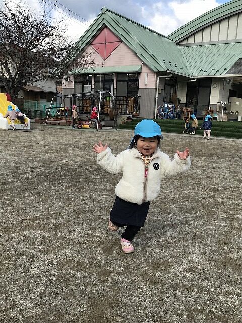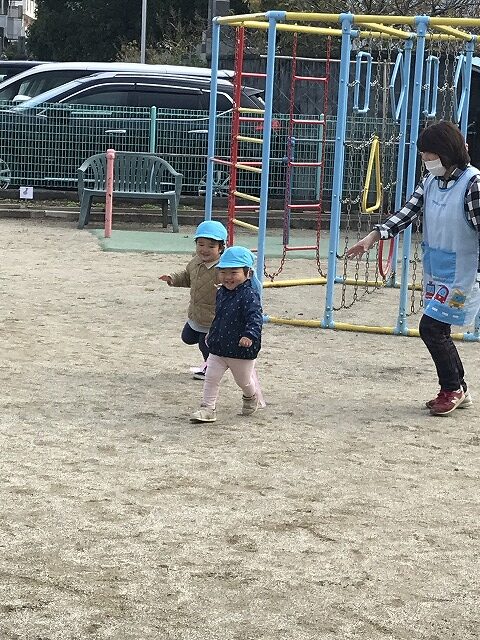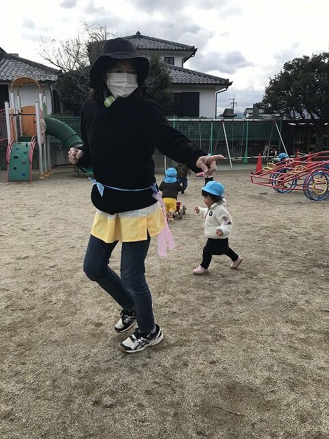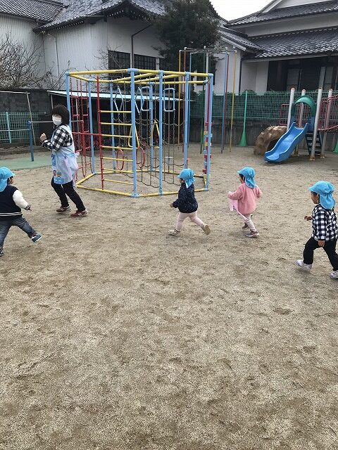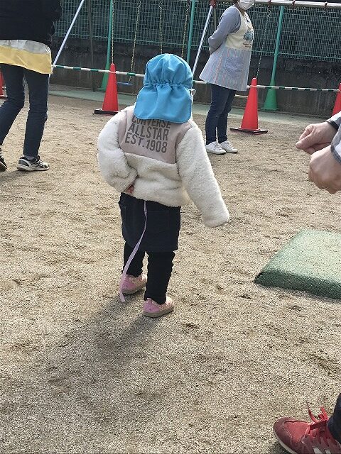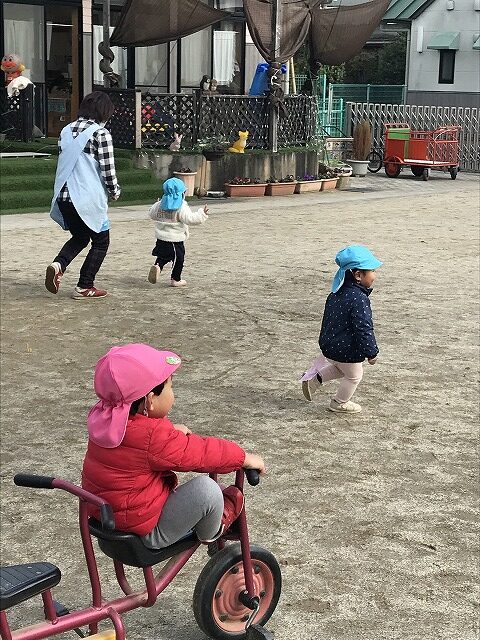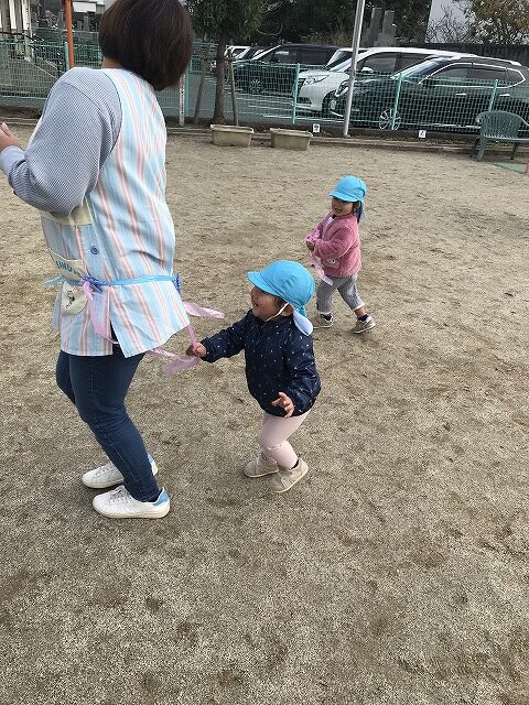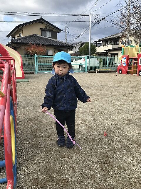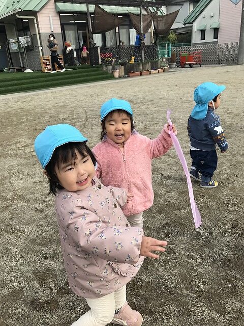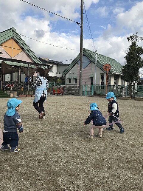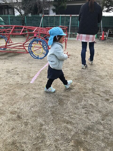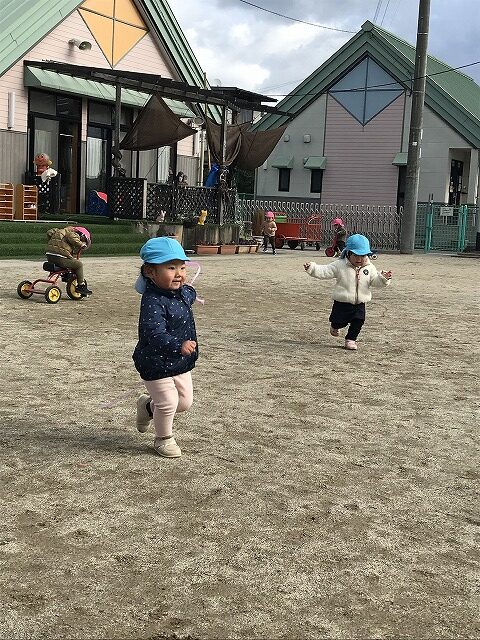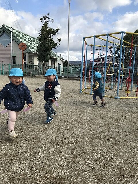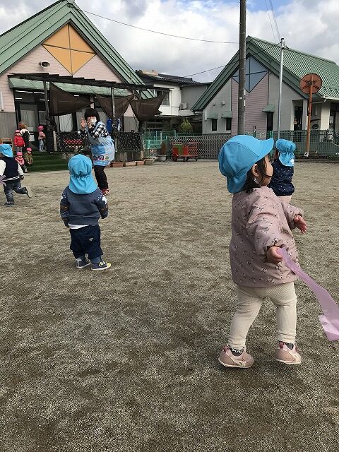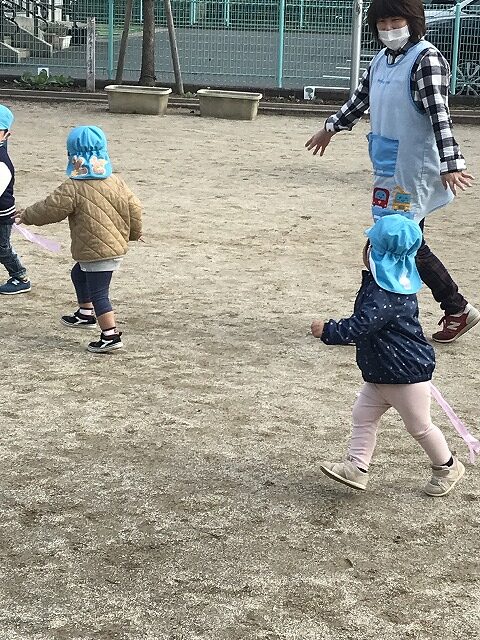 今日、1歳児(すみれ組)は、園庭で初めての「しっぽとりゲーム」をしました。まず最初に3人の保育士等の腰に洗濯ばさみのついた紐をまき、その洗濯ばさみにスズランテープをしっぽに見立て、数本挟んで準備完了。「先生に、しっぽがはえてきたよ!みんなで取ってみよう!」と「よーいドン!」の合図で「しっぽとりゲーム」の開始!元気よくかけ出しました。しっぽを取ろうと一生懸命追いかける子や、すぐに諦めて他の遊具にいく子など、いろんな姿が見られました。「しっぽとったー!」と嬉しそうにしている子もいて、とても楽しめたようです。遊びが発展していき、子ども達自身がしっぽを挟んで「まてまてー」っと追いかけられて楽しむ姿もありました。友達みんなで同じ遊び、同じルール中で遊べるということは、大切な経験だと思います。これからも簡単なルールのある遊びを、たくさん取り入れ楽しんでいきたいです。