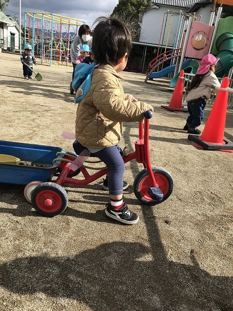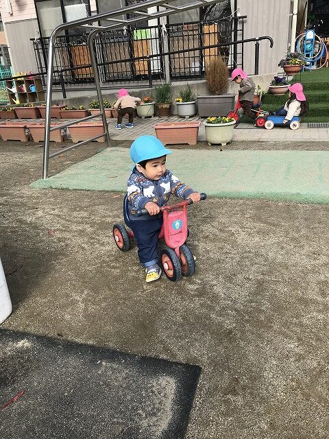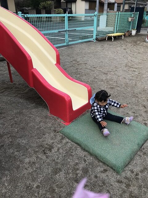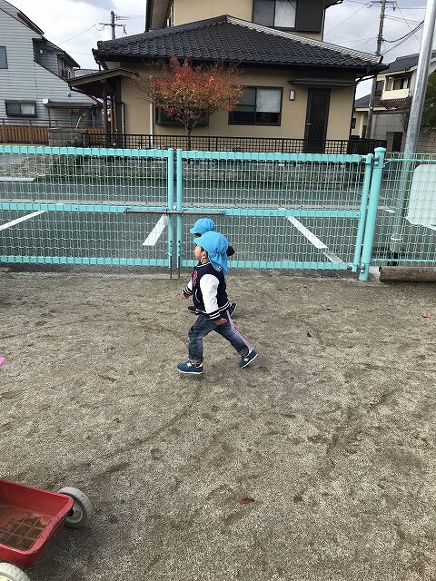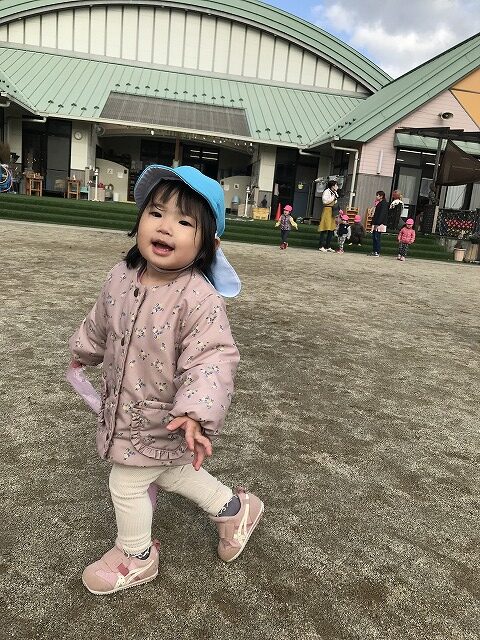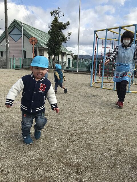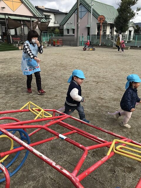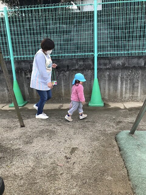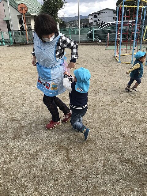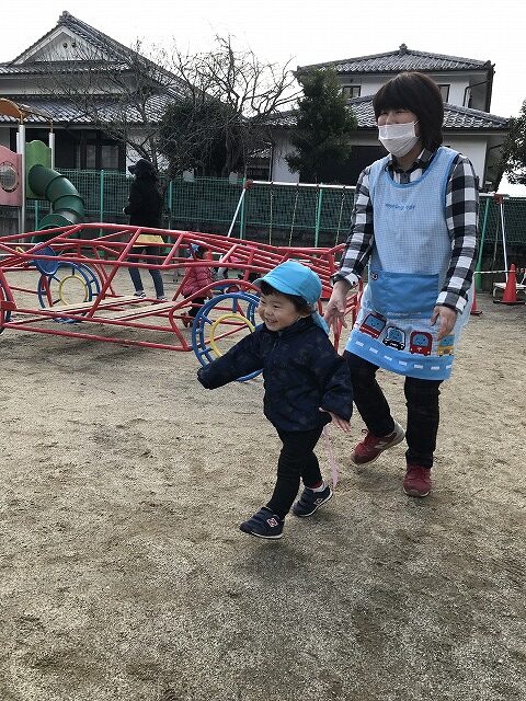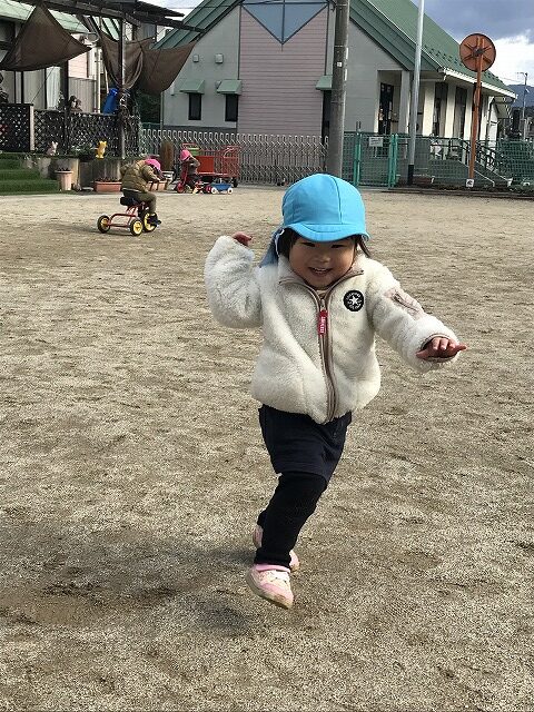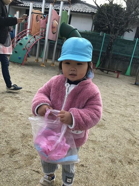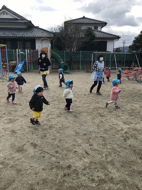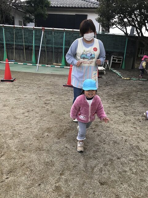 今日、1歳児(すみれ組)は、園庭で初めての「しっぽとりゲーム」をしました。まず最初に3人の保育士等の腰に洗濯ばさみのついた紐をまき、その洗濯ばさみにスズランテープをしっぽに見立て、数本挟んで準備完了。「先生に、しっぽがはえてきたよ!みんなで取ってみよう!」と「よーいドン!」の合図で「しっぽとりゲーム」の開始!元気よくかけ出しました。しっぽを取ろうと一生懸命追いかける子や、すぐに諦めて他の遊具にいく子など、いろんな姿が見られました。「しっぽとったー!」と嬉しそうにしている子もいて、とても楽しめたようです。遊びが発展していき、子ども達自身がしっぽを挟んで「まてまてー」っと追いかけられて楽しむ姿もありました。友達みんなで同じ遊び、同じルール中で遊べるということは、大切な経験だと思います。これからも簡単なルールのある遊びを、たくさん取り入れ楽しんでいきたいです。