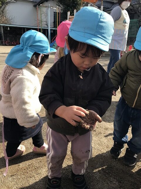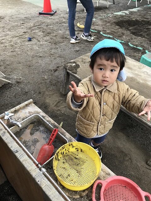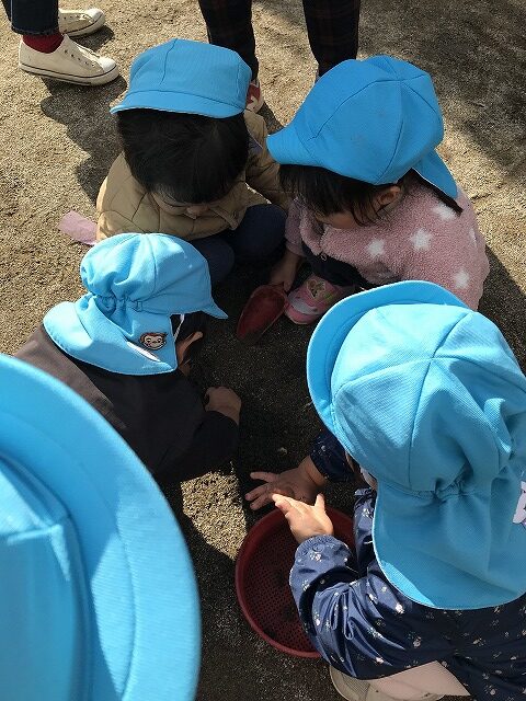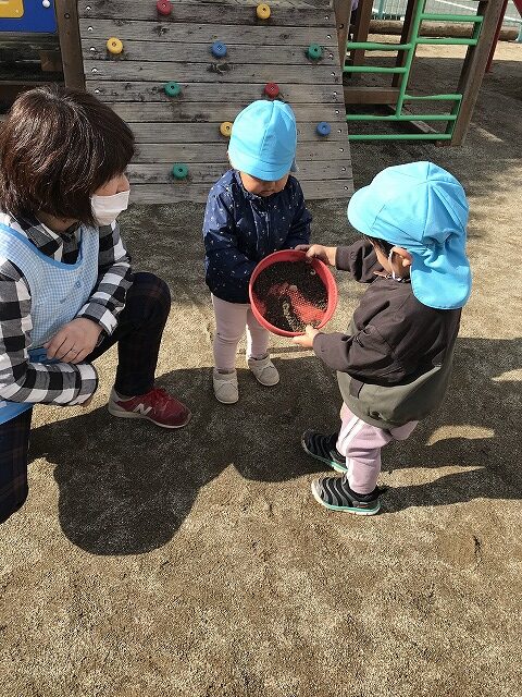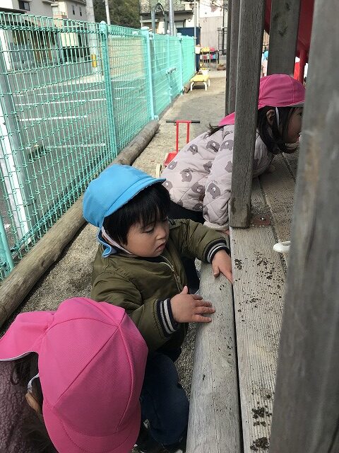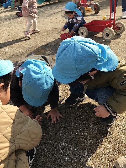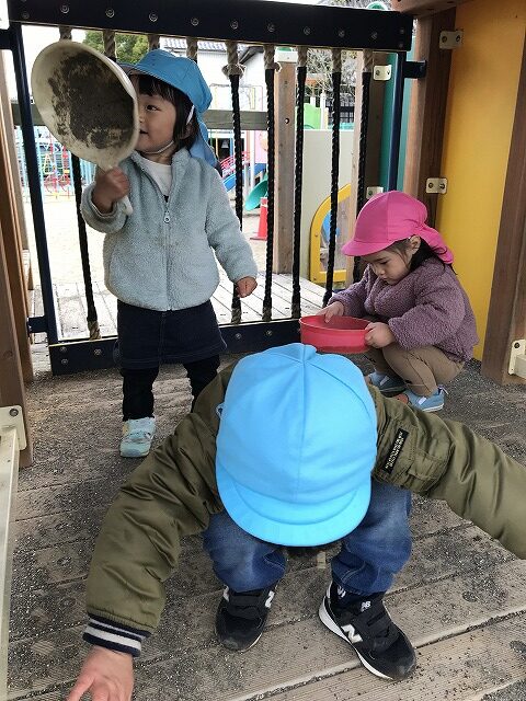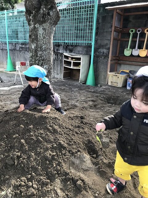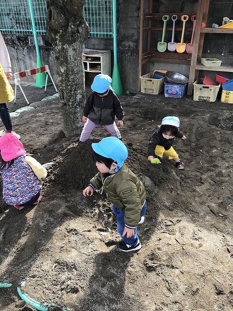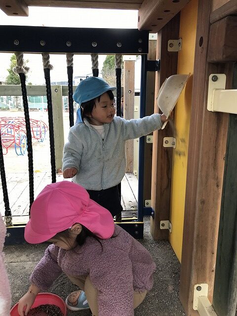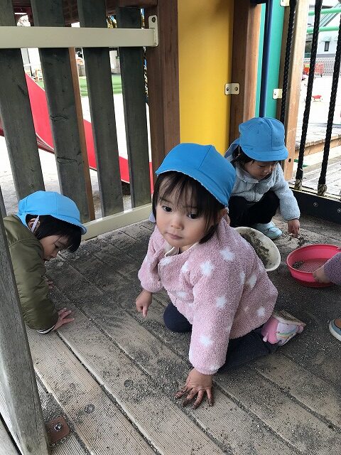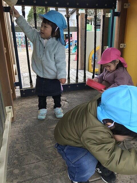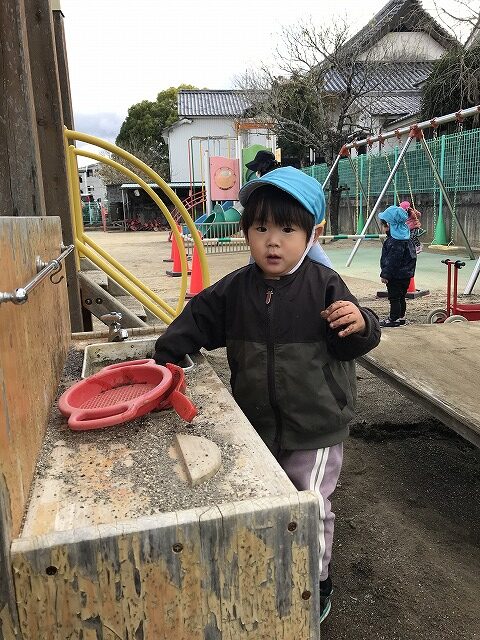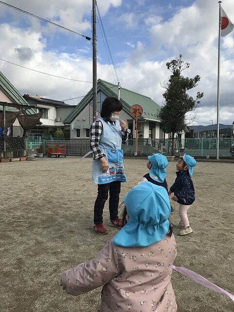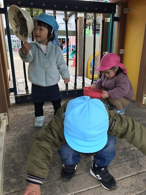 今日、1歳児(すみれ組)は、園庭で初めての「しっぽとりゲーム」をしました。まず最初に3人の保育士等の腰に洗濯ばさみのついた紐をまき、その洗濯ばさみにスズランテープをしっぽに見立て、数本挟んで準備完了。「先生に、しっぽがはえてきたよ!みんなで取ってみよう!」と「よーいドン!」の合図で「しっぽとりゲーム」の開始!元気よくかけ出しました。しっぽを取ろうと一生懸命追いかける子や、すぐに諦めて他の遊具にいく子など、いろんな姿が見られました。「しっぽとったー!」と嬉しそうにしている子もいて、とても楽しめたようです。遊びが発展していき、子ども達自身がしっぽを挟んで「まてまてー」っと追いかけられて楽しむ姿もありました。友達みんなで同じ遊び、同じルール中で遊べるということは、大切な経験だと思います。これからも簡単なルールのある遊びを、たくさん取り入れ楽しんでいきたいです。