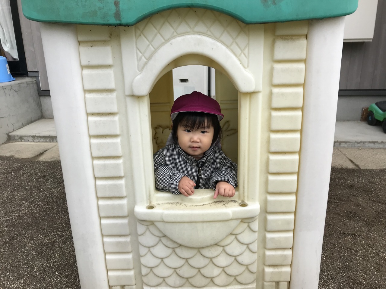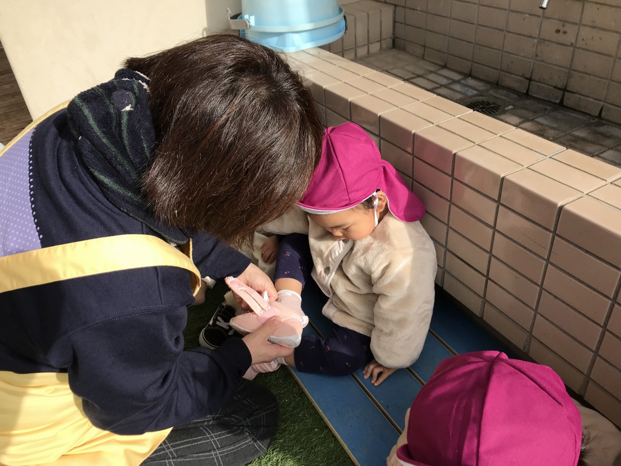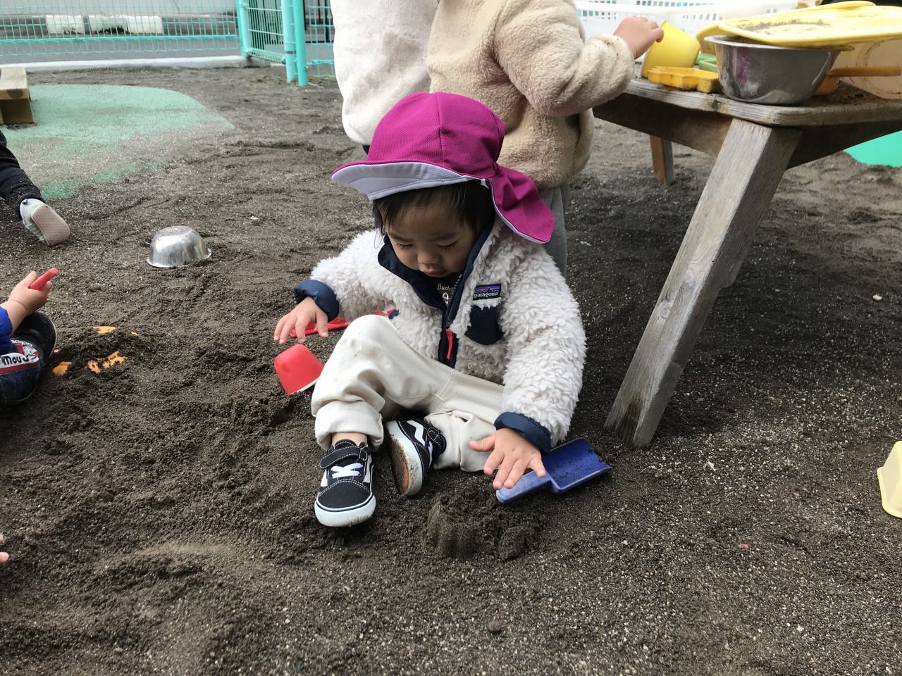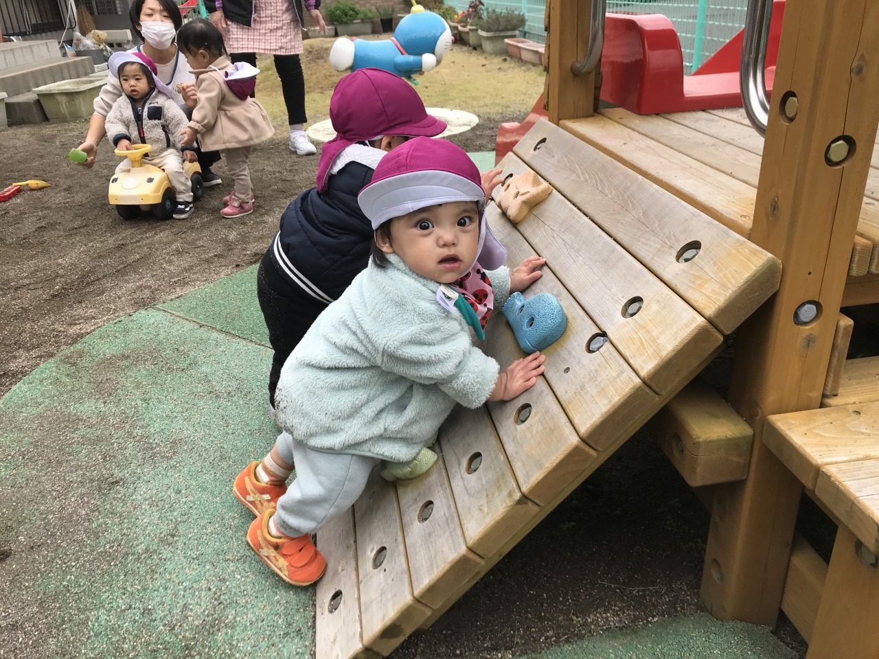 ひよこ組(0歳児)は裏庭で遊びました。月齢が高くなってきて保育士等が「自分の靴を持ってきてね」と声を掛けると自分のマークの靴箱から靴を持ってくる姿が見られるようになりました。靴を履くときには「靴のビリビリ(マジックテープ)できるかな」と声を掛けて靴の履き方も少しずつ伝えていっています。靴を履いて裏庭に行くと、砂でおままごとをして見立て遊びをしたり、滑り台やボルダリングで全身を動かして遊んだりする姿が見られました。砂遊びをしているときは遊びが発展できるように一緒に遊んだり、遊具に挑戦している時は側で”やってみたい”という気持ちを大切にして側で見守るようにしたりしています。