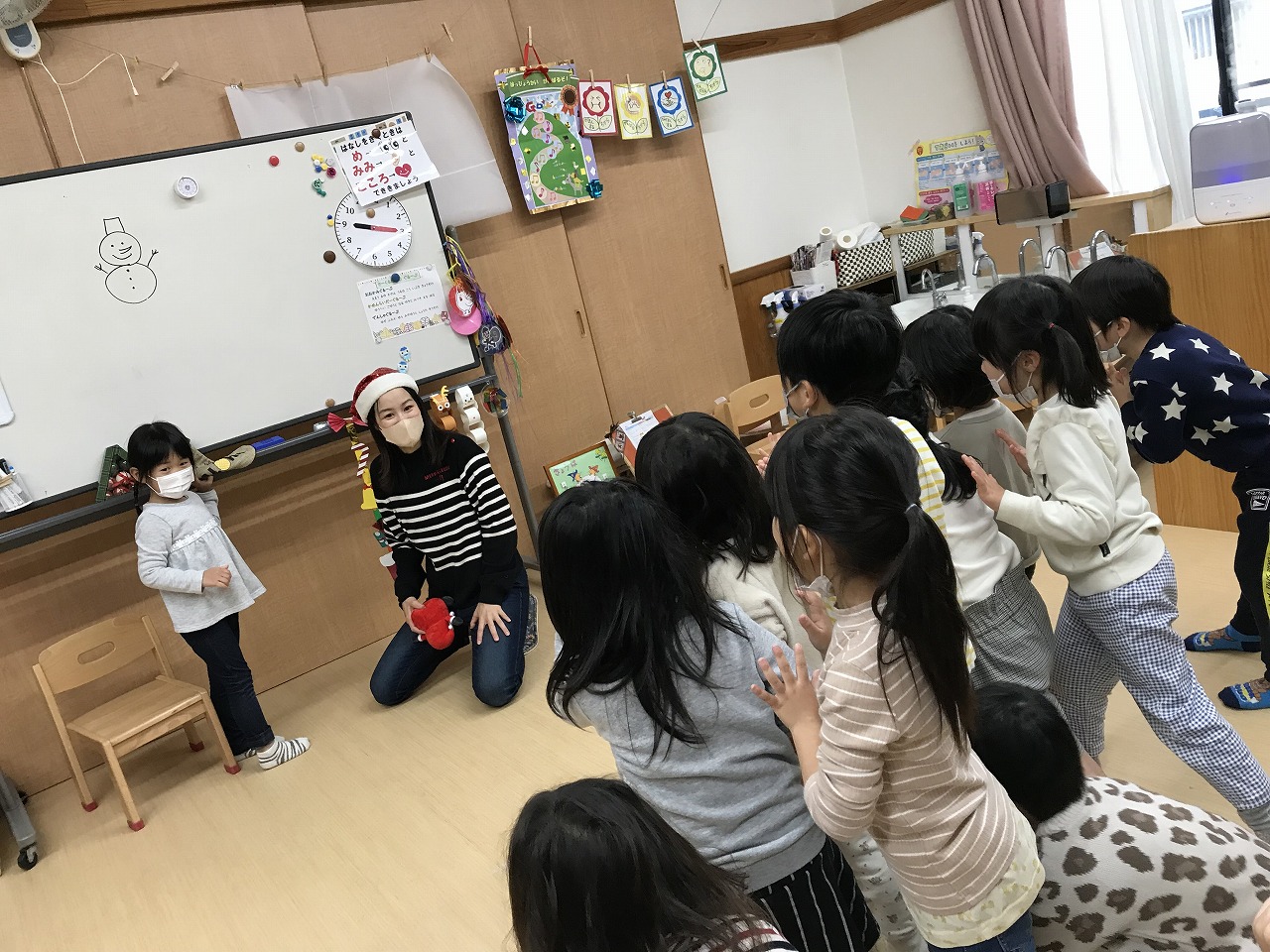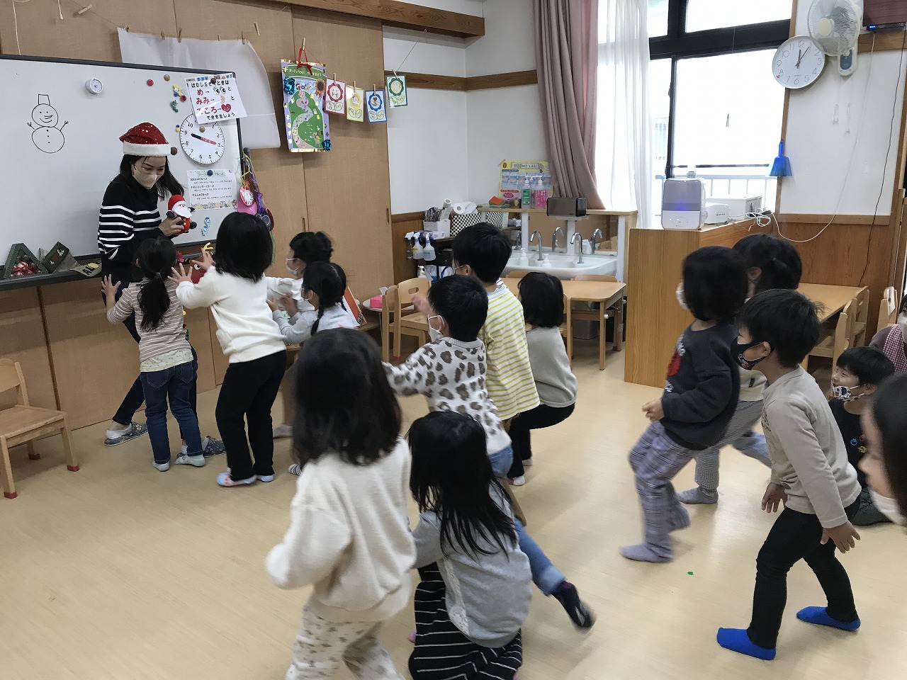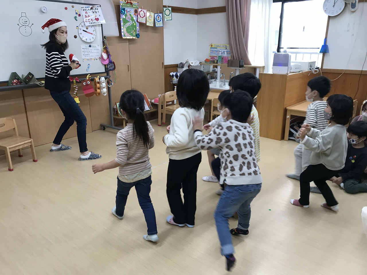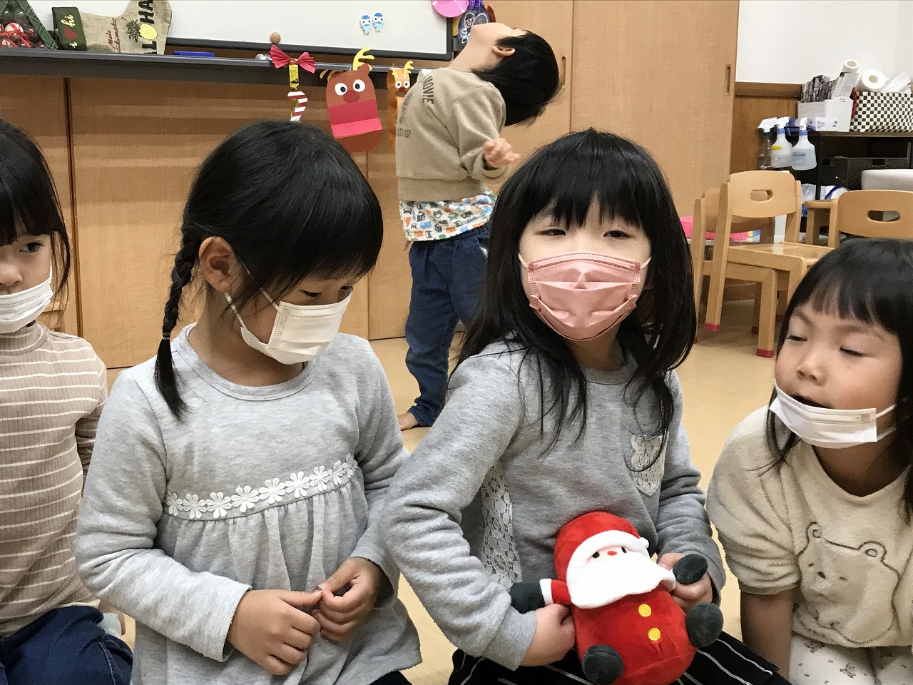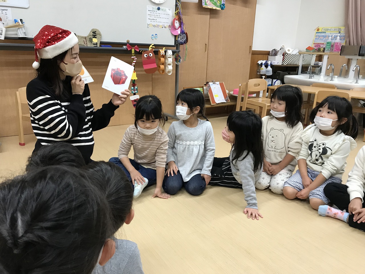 今日は英会話教室がありました。久しぶりの英会話教室だったのでさくら組(4歳児)の子ども達もとっても楽しみにしていました。今月は12月ということでテーマは“クリスマス”。クリスマスにちなんだゲームやダンスをしていく中で、クリスマスにまつわる単語を覚えていくことができました。最後はみんなで円になってサンタクロースのぬいぐるみを回していきながら、「I want to ○○!(わたしが欲しい物は〇〇です)」とサンタさんにお願いするプレゼントを発表していきました。みんな上手に発表してくれ、内容もサンタさんへのお願い事がいっぱい!楽しみにクリスマスを待っている様子が伝わりました★サンタさんが素敵なプレゼントを持ってきてくれるといいね!