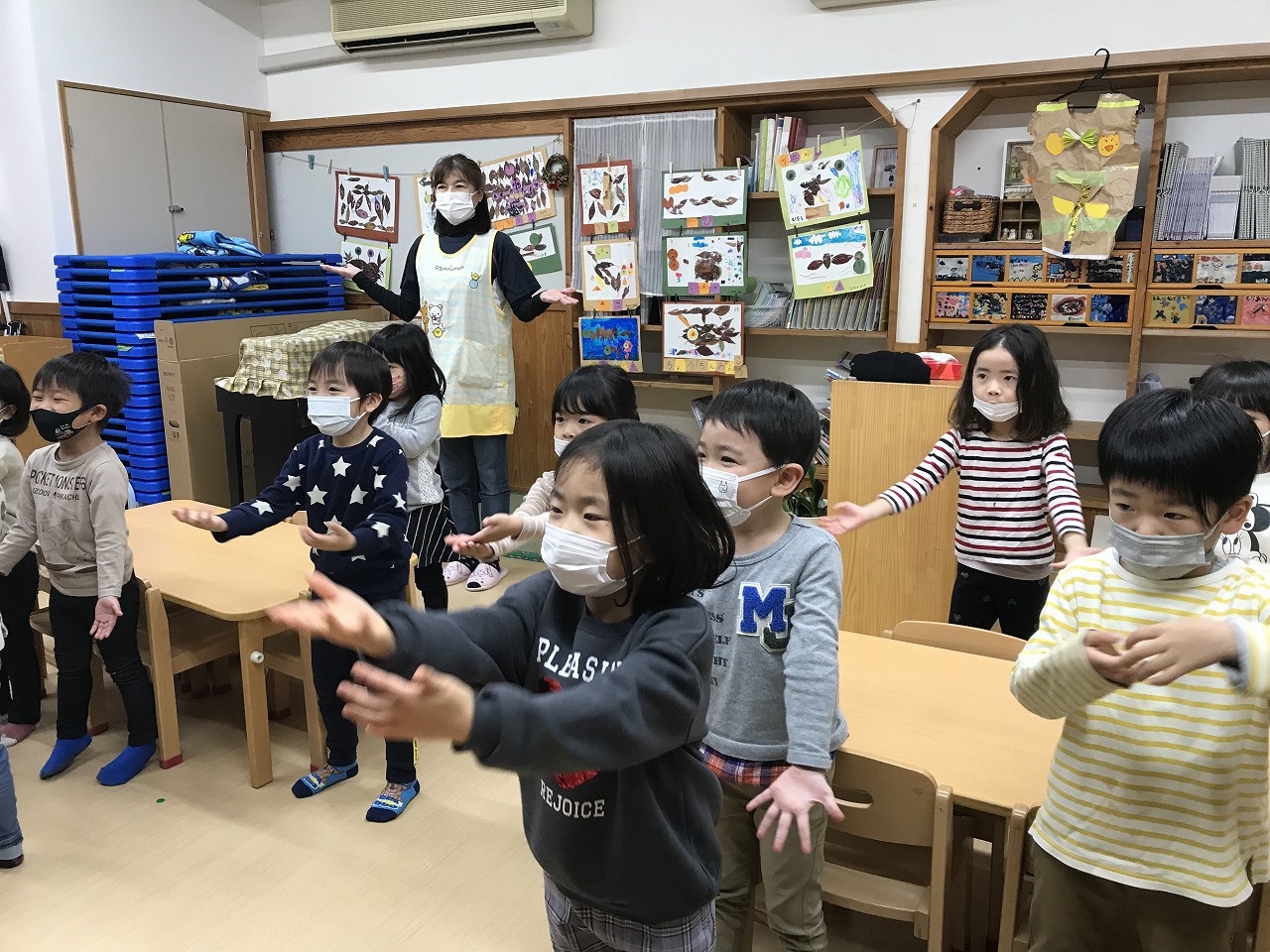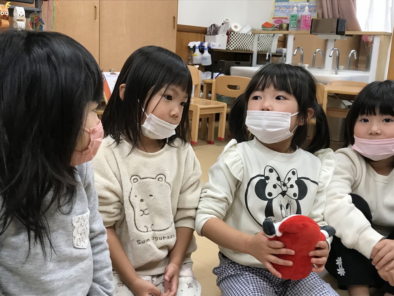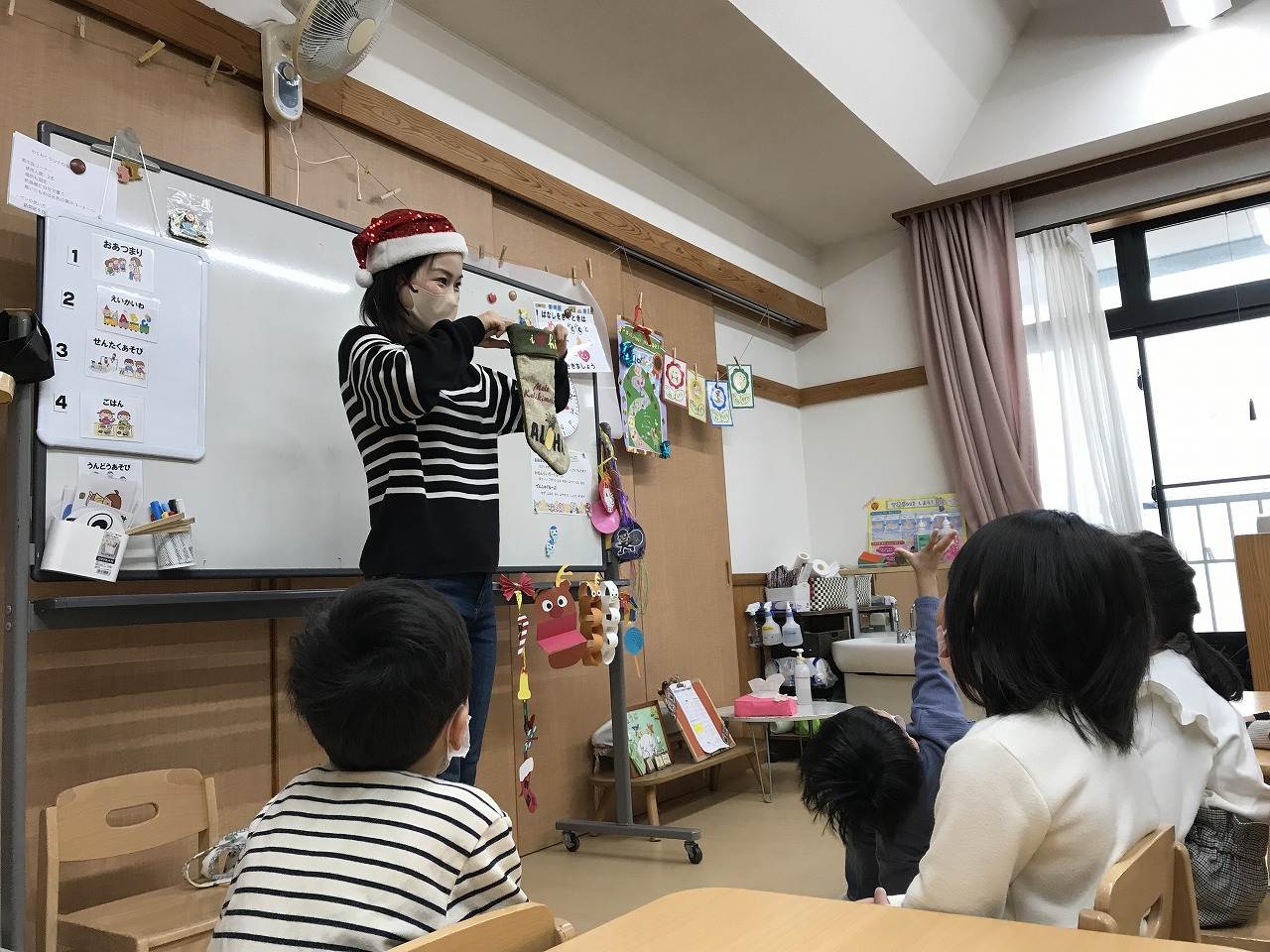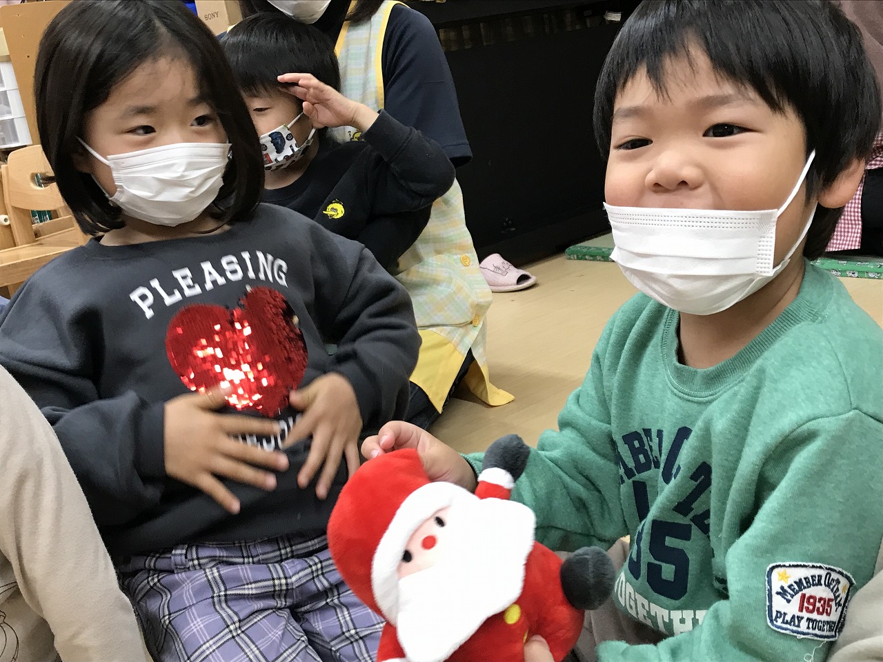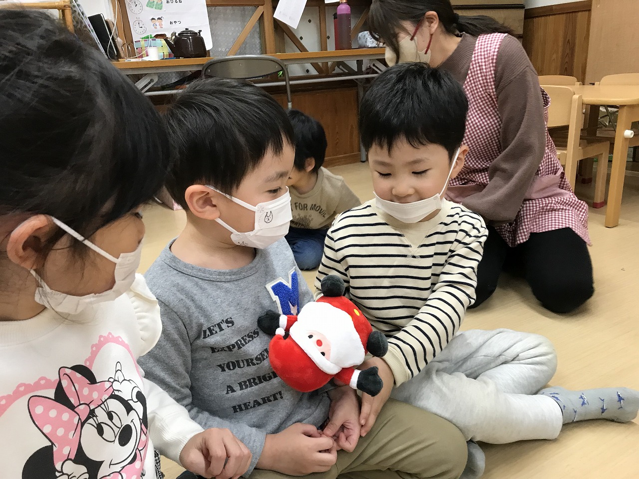 今日は英会話教室がありました。久しぶりの英会話教室だったのでさくら組(4歳児)の子ども達もとっても楽しみにしていました。今月は12月ということでテーマは“クリスマス”。クリスマスにちなんだゲームやダンスをしていく中で、クリスマスにまつわる単語を覚えていくことができました。最後はみんなで円になってサンタクロースのぬいぐるみを回していきながら、「I want to ○○!(わたしが欲しい物は〇〇です)」とサンタさんにお願いするプレゼントを発表していきました。みんな上手に発表してくれ、内容もサンタさんへのお願い事がいっぱい!楽しみにクリスマスを待っている様子が伝わりました★サンタさんが素敵なプレゼントを持ってきてくれるといいね!