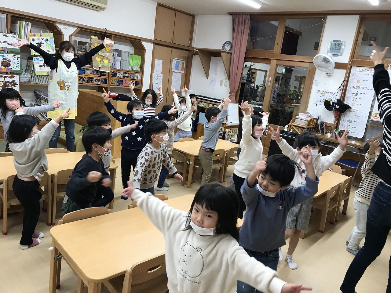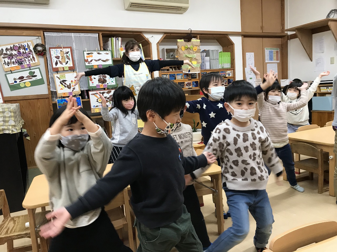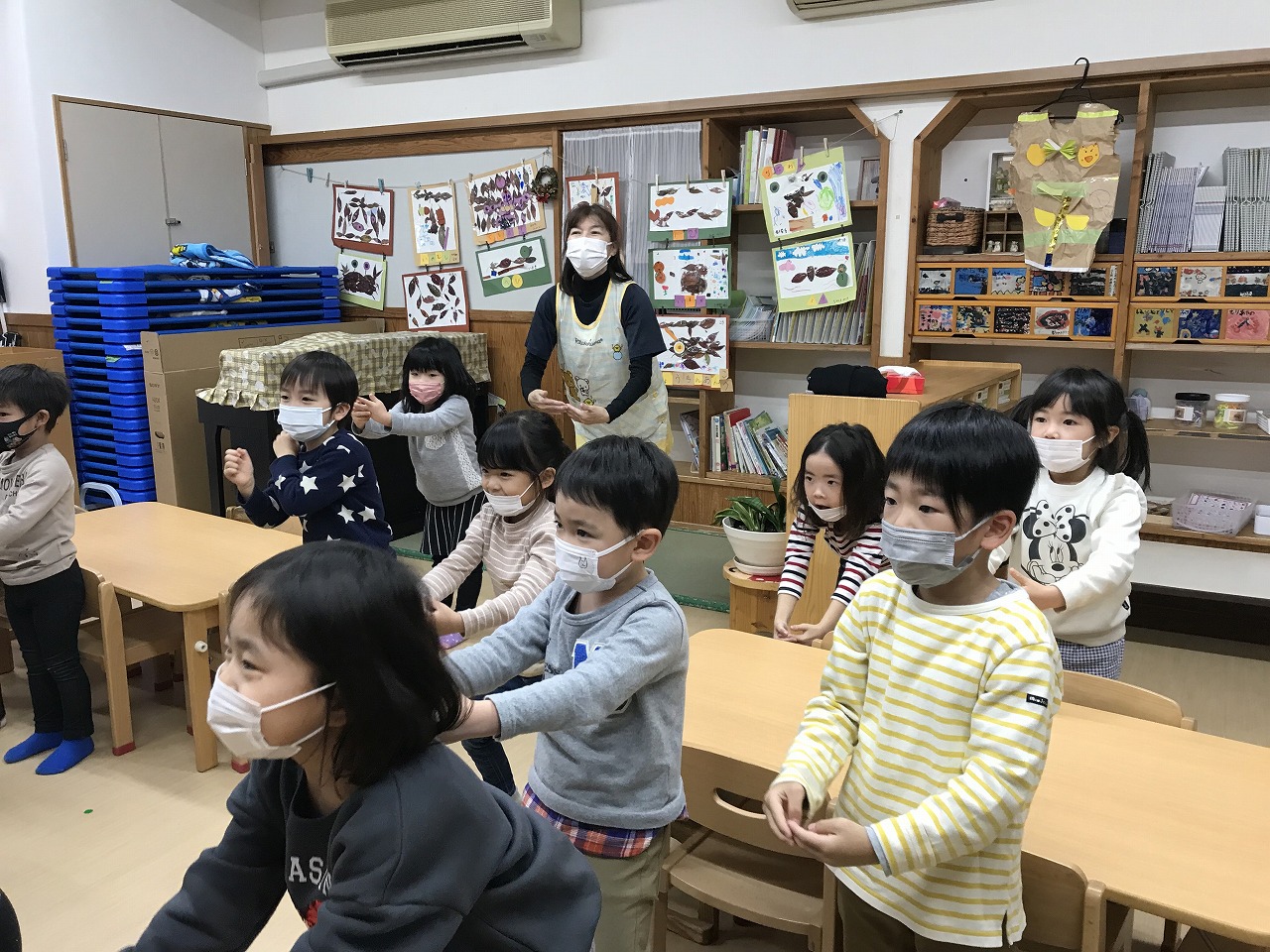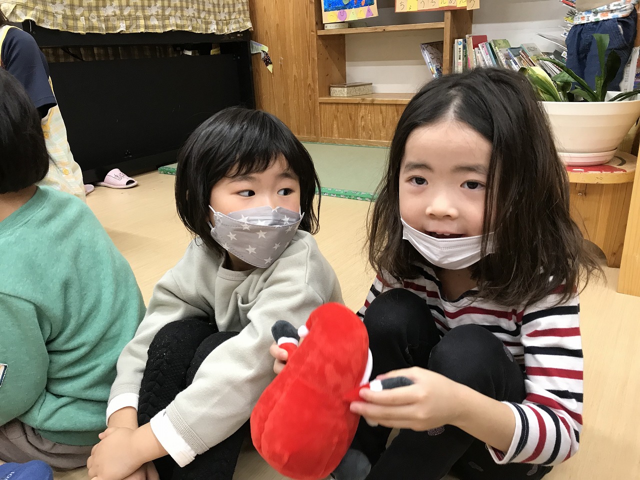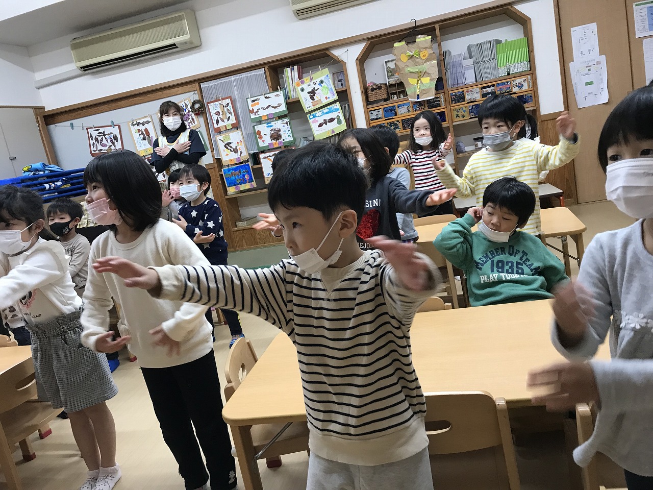今日は英会話教室がありました。久しぶりの英会話教室だったのでさくら組(4歳児)の子ども達もとっても楽しみにしていました。今月は12月ということでテーマは“クリスマス”。クリスマスにちなんだゲームやダンスをしていく中で、クリスマスにまつわる単語を覚えていくことができました。最後はみんなで円になってサンタクロースのぬいぐるみを回していきながら、「I want to ○○!(わたしが欲しい物は〇〇です)」とサンタさんにお願いするプレゼントを発表していきました。みんな上手に発表してくれ、内容もサンタさんへのお願い事がいっぱい!楽しみにクリスマスを待っている様子が伝わりました★サンタさんが素敵なプレゼントを持ってきてくれるといいね!