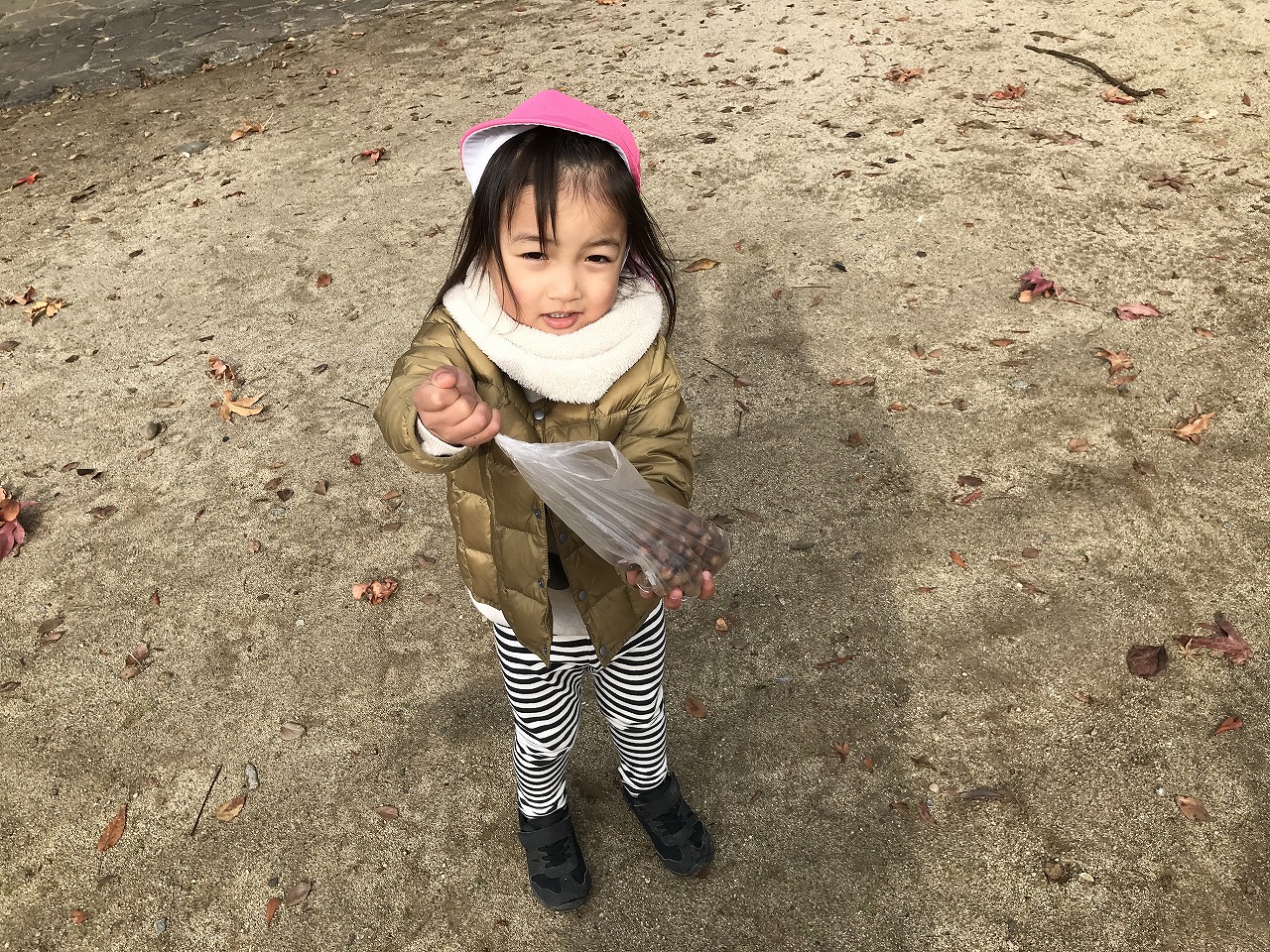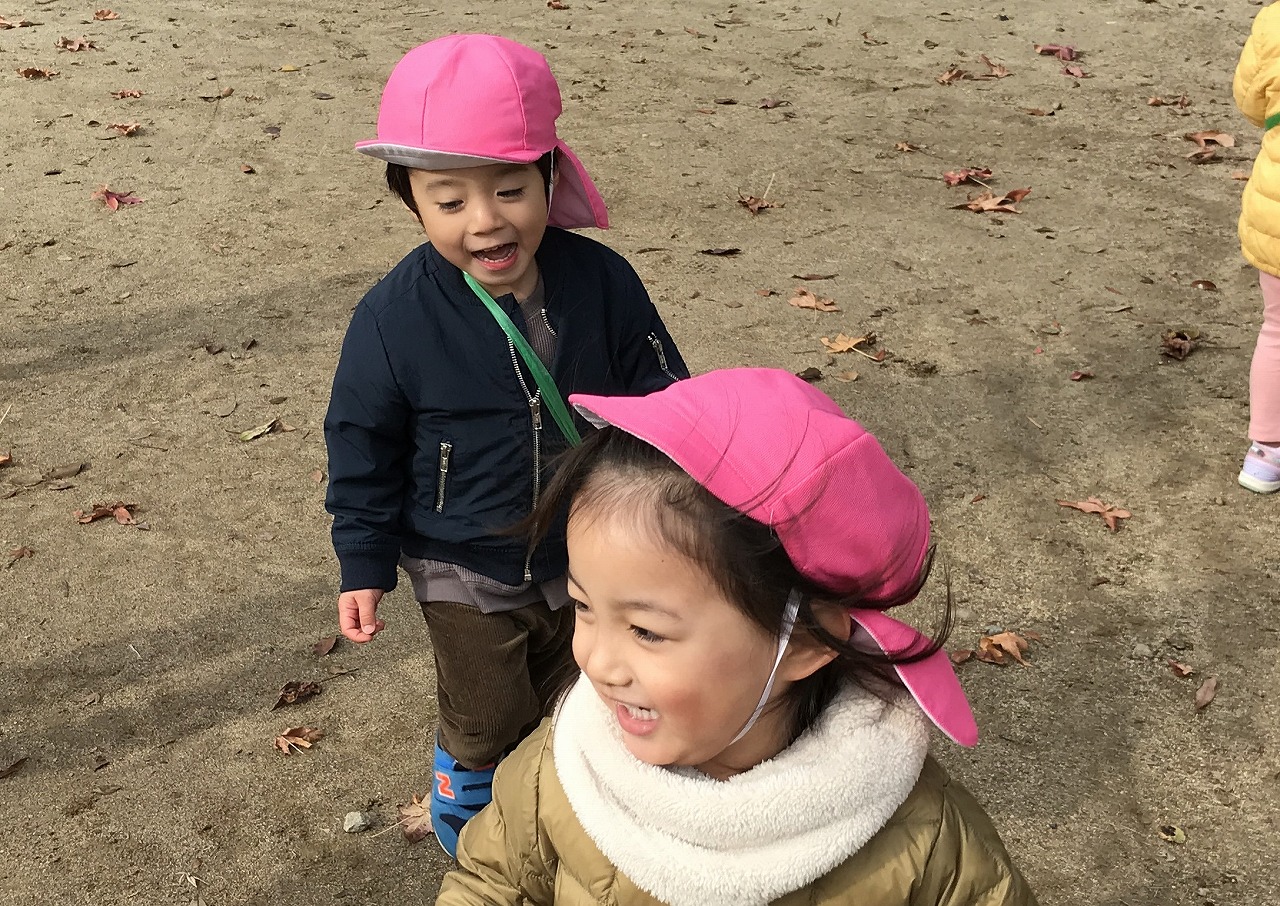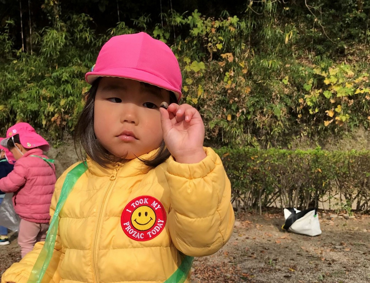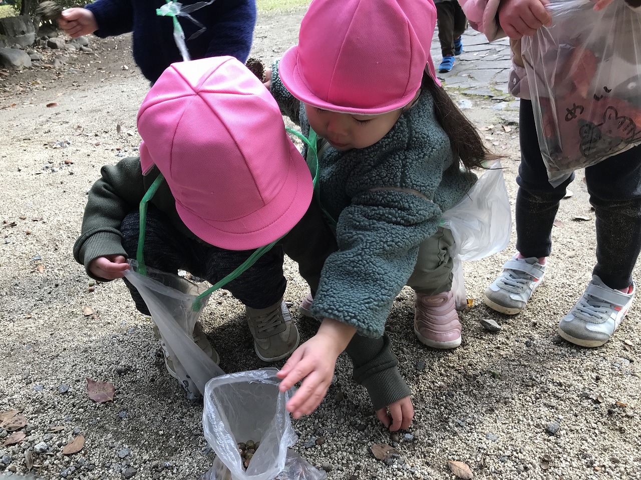 公園に着くと、ドングリや赤く色づいた葉っぱを発見!!「大きい葉っぱがあったよ」「このドングリ、小さいね」など公園でもたくさんの発見がありました。公園までの行き帰り、長い距離でしたが子どもたちは元気いっぱいで会話が途切れることなく楽しく歩きました!拾ったドングリや葉っぱは袋にいれて持ち帰っていますので、ぜひお家でも話を聞いてみてください。
