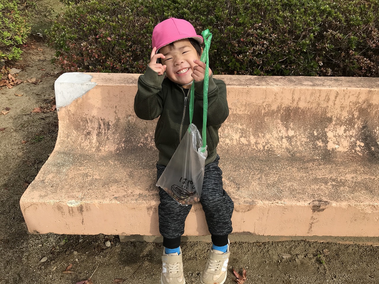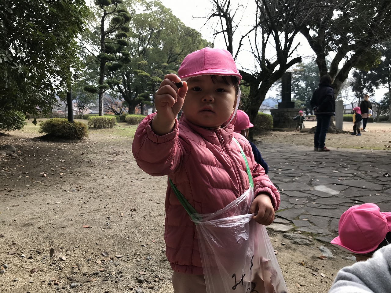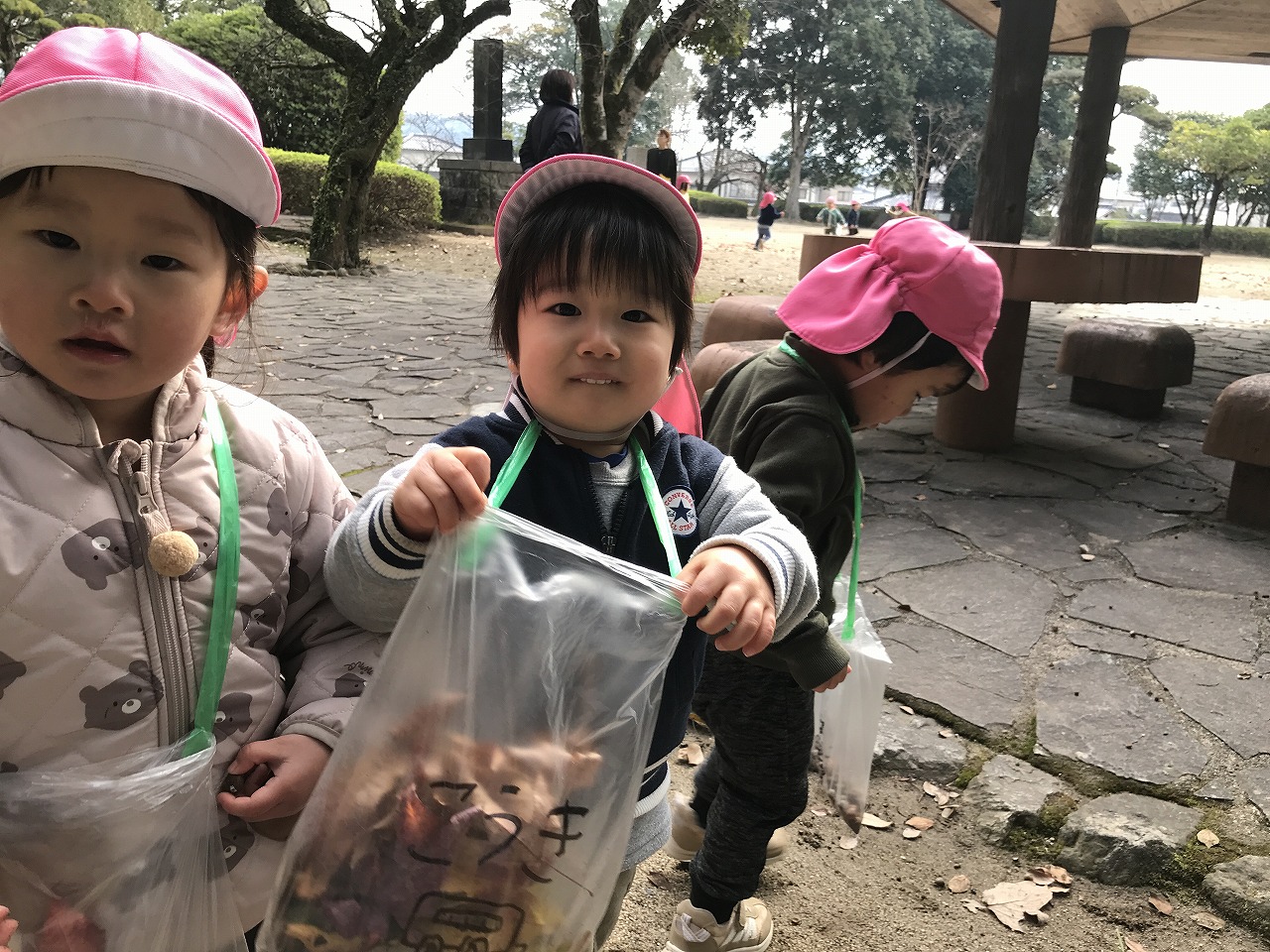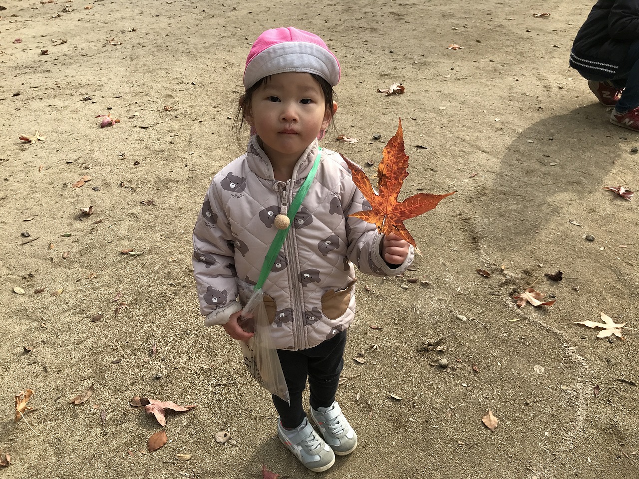 公園に着くと、ドングリや赤く色づいた葉っぱを発見!!「大きい葉っぱがあったよ」「このドングリ、小さいね」など公園でもたくさんの発見がありました。公園までの行き帰り、長い距離でしたが子どもたちは元気いっぱいで会話が途切れることなく楽しく歩きました!拾ったドングリや葉っぱは袋にいれて持ち帰っていますので、ぜひお家でも話を聞いてみてください。