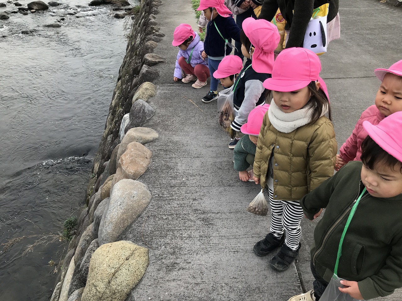 どんどん体力もついてきて長い距離も歩くことが出来るようになってきたたんぽぽ組の子どもたち。そこで、今日は月隈公園まで遊びに行きました。公園に行くまでの途中、土手沿いを歩いていると「カモさんがいる」「大きな鳥もいるよ」「ショベルカーがいる」など、いろんな発見をしました。言葉数が増え表現力も豊かになってきたので会話をするのがとても楽しいです。