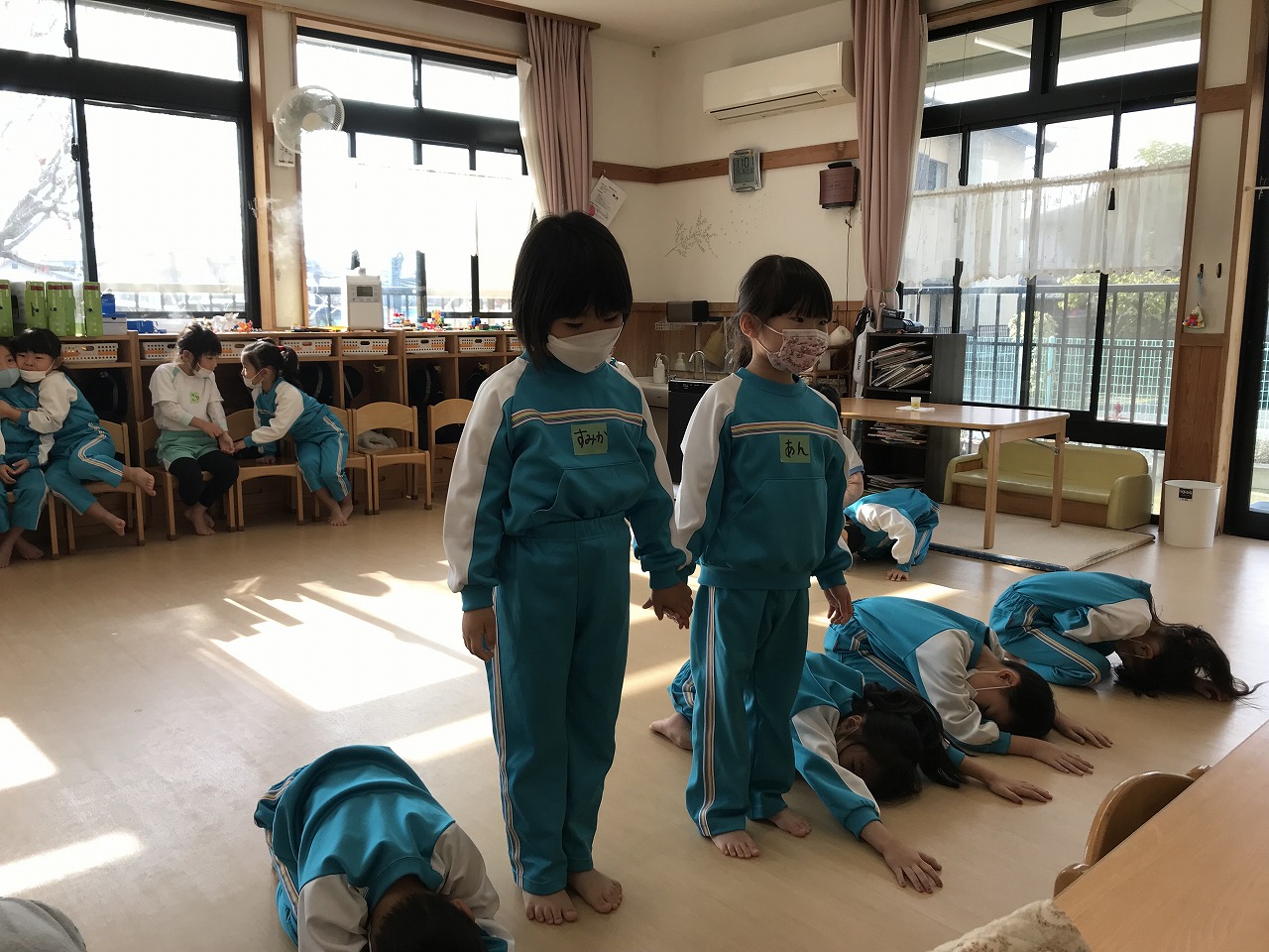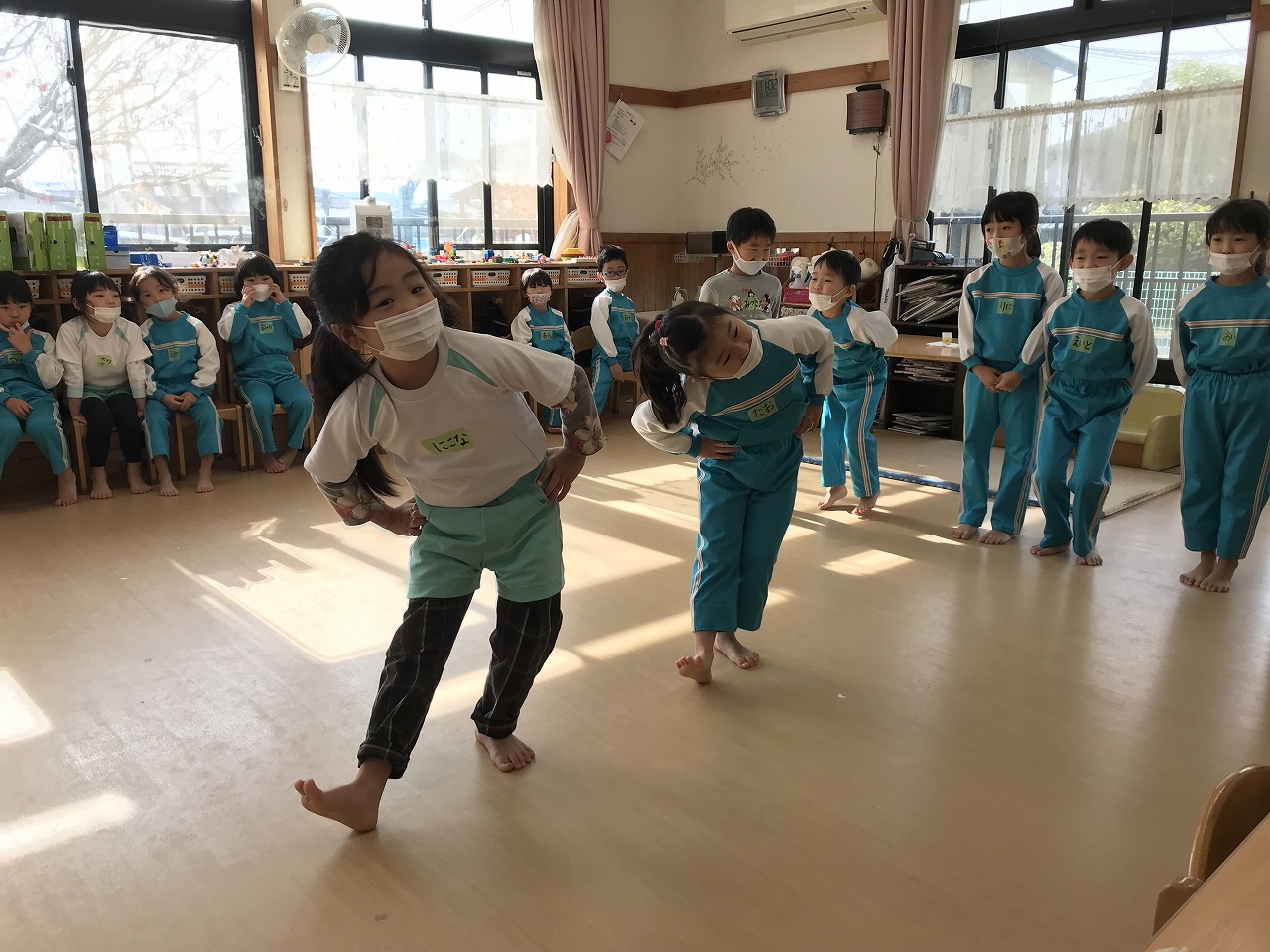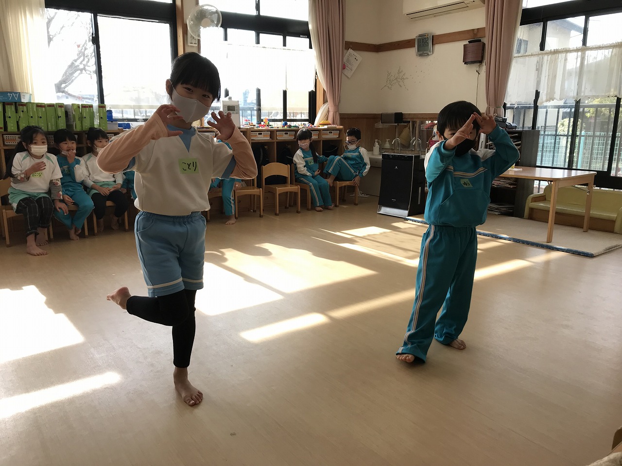 発表会の話で盛り上がっていたもも組(5歳児)、音楽を流すとまだばっちり覚えていて、自分の踊りでなくても、笑顔で踊ることができていました。今日は久しぶりに子ども達のリクエストで、踊りと劇遊びを行いました。大道具や立ち位置などがなくても、自分たちで考えながらとても楽しそうでした。英語劇も覚えていて、役になりきって楽しく劇遊びをしました!子ども達の記憶力に驚きです。