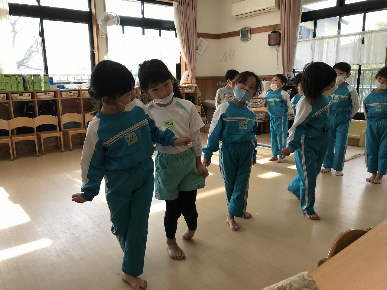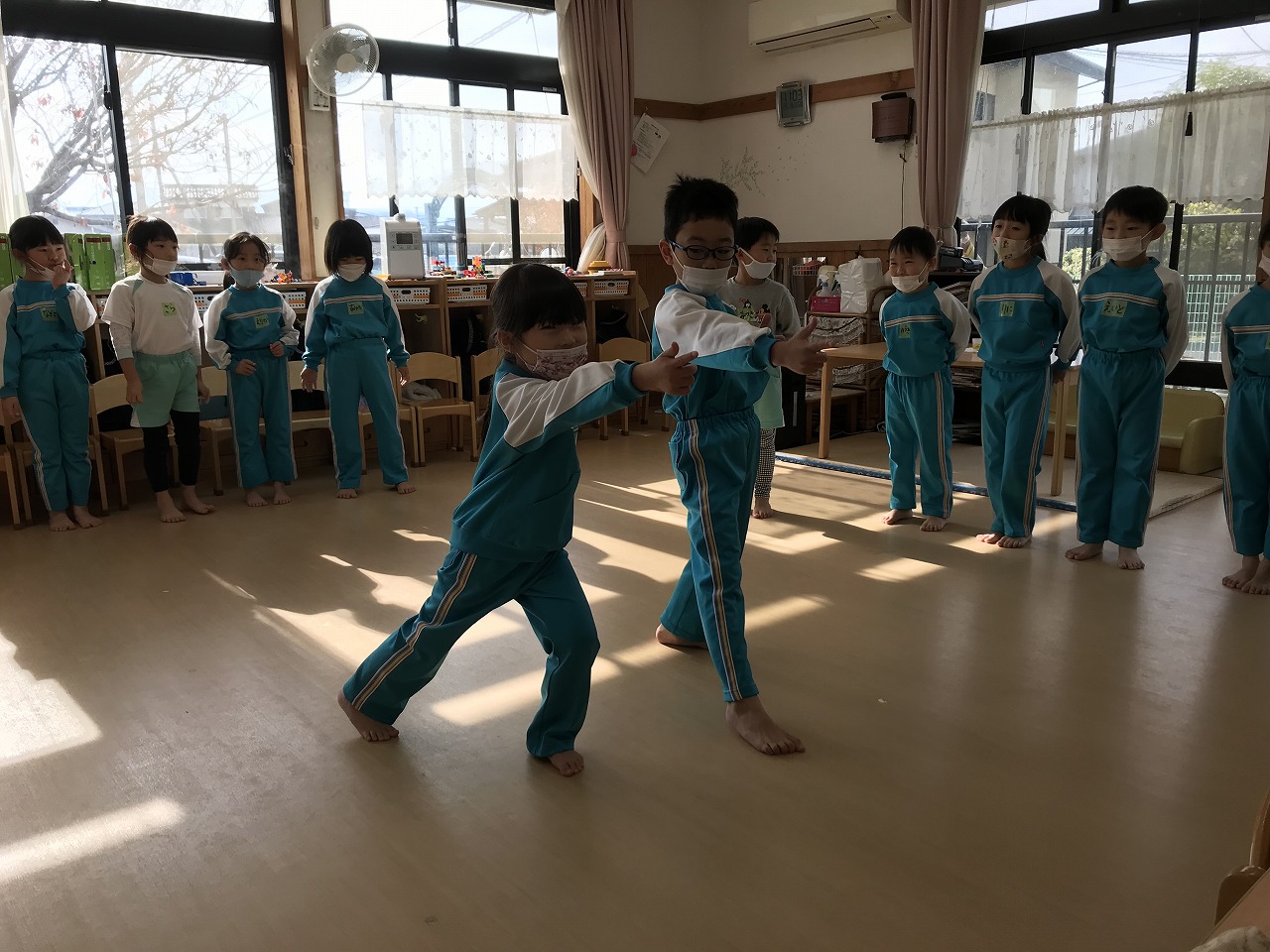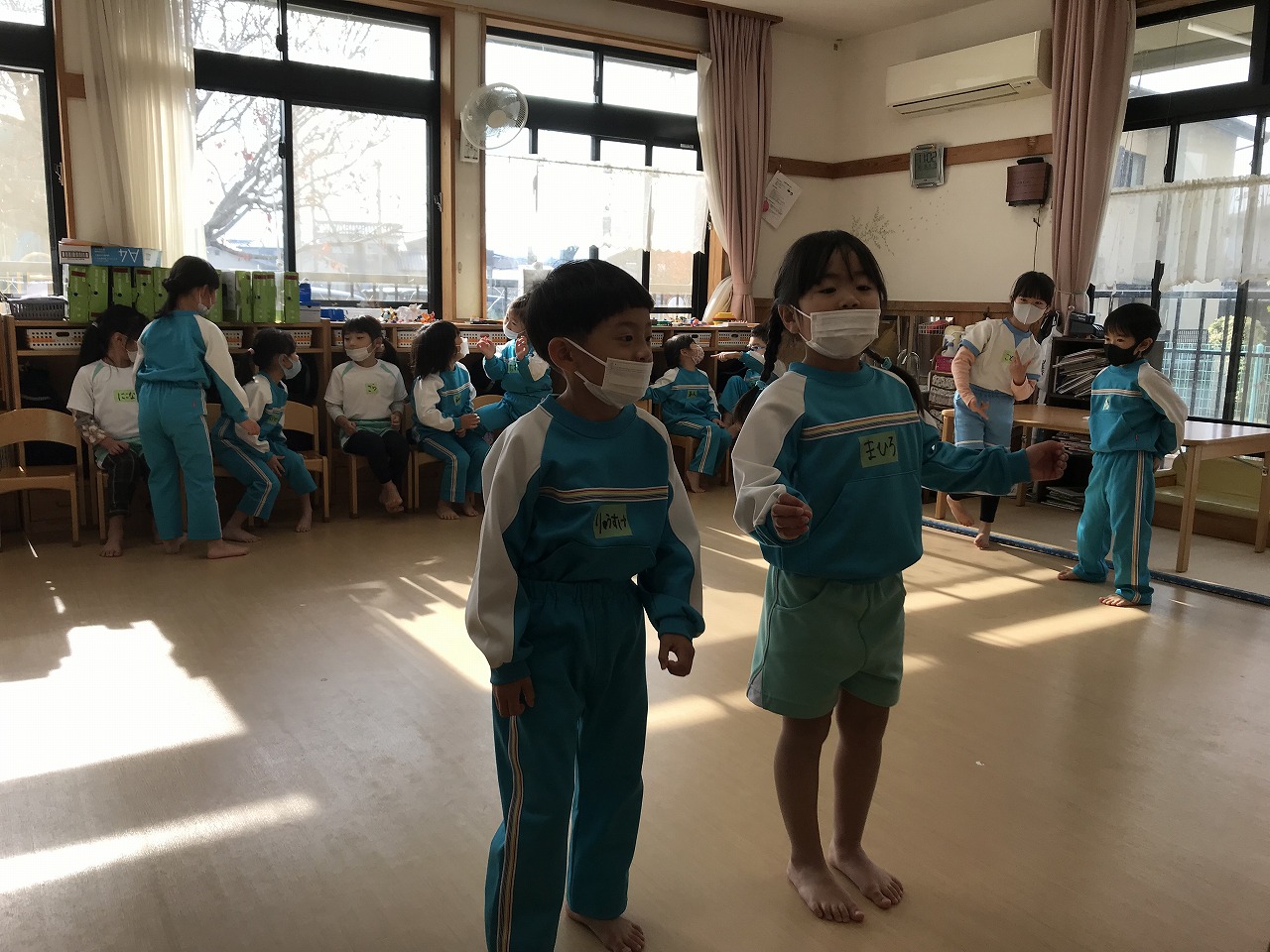 発表会の話で盛り上がっていたもも組(5歳児)、音楽を流すとまだばっちり覚えていて、自分の踊りでなくても、笑顔で踊ることができていました。今日は久しぶりに子ども達のリクエストで、踊りと劇遊びを行いました。大道具や立ち位置などがなくても、自分たちで考えながらとても楽しそうでした。英語劇も覚えていて、役になりきって楽しく劇遊びをしました!子ども達の記憶力に驚きです。