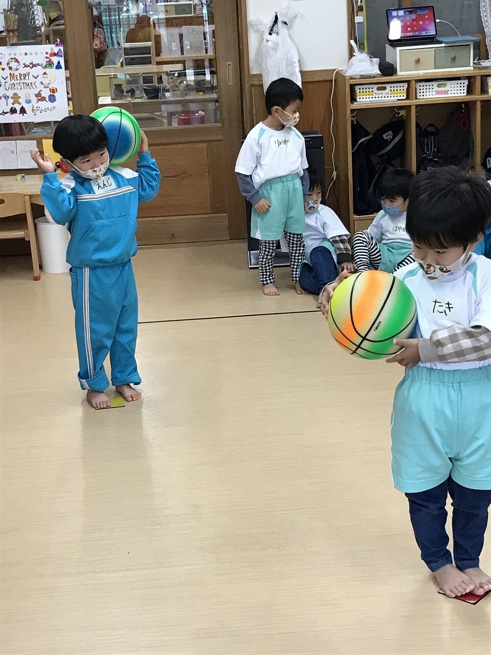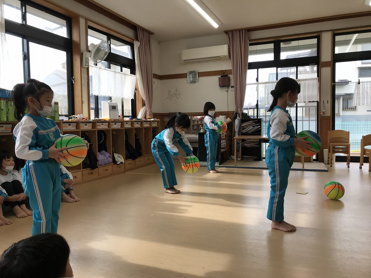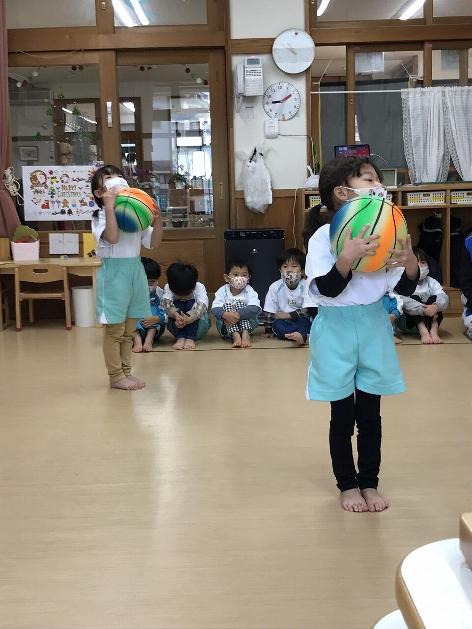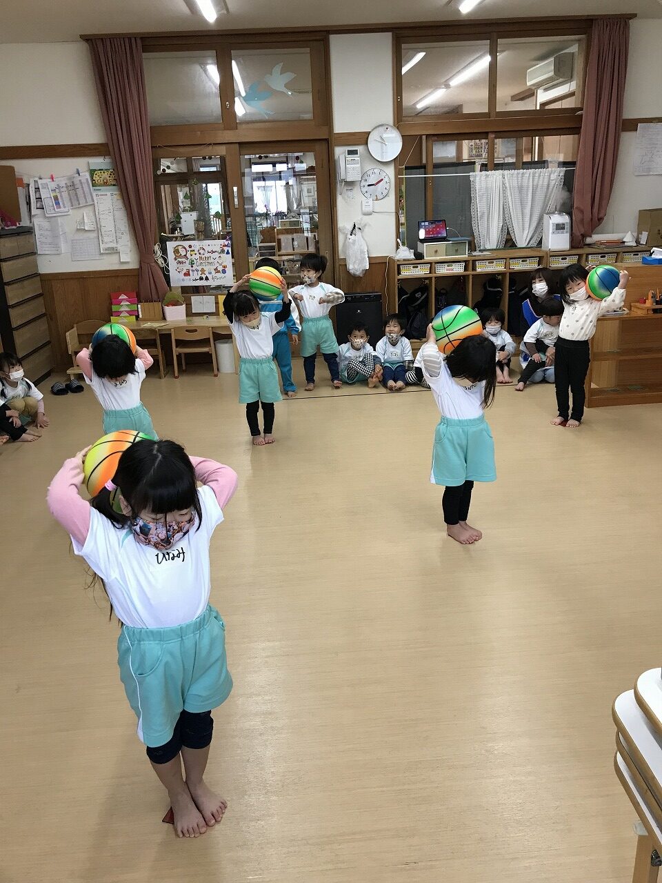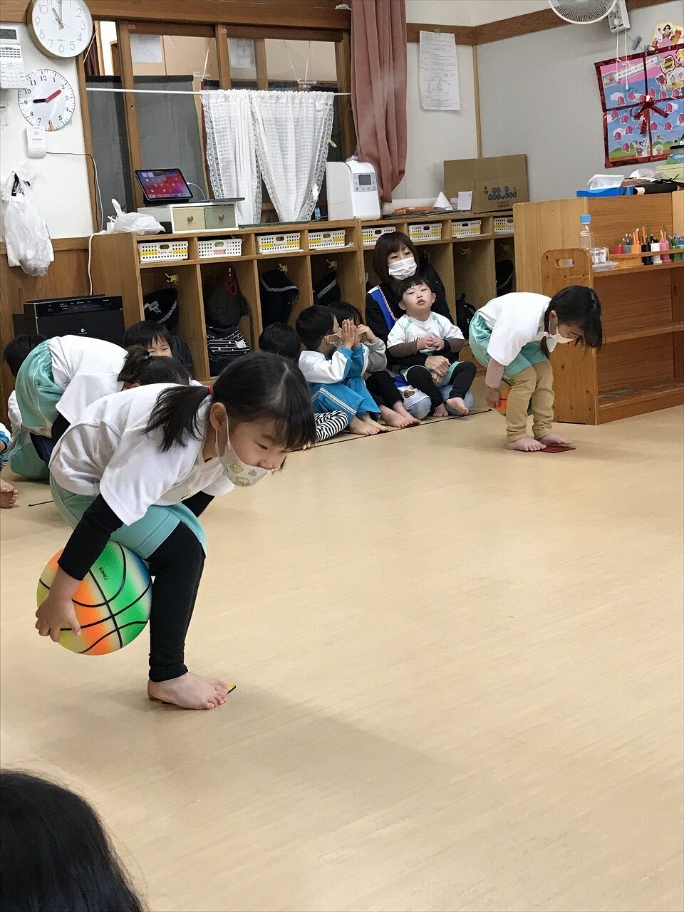 体操教室もありました。ボールを使って、体の周りを回したり、ボール突きをしたり、しっかりとお話を聞きながらがんばっていました。うめ組ともも組の様子をごらんください。