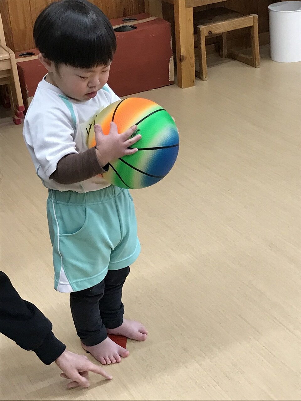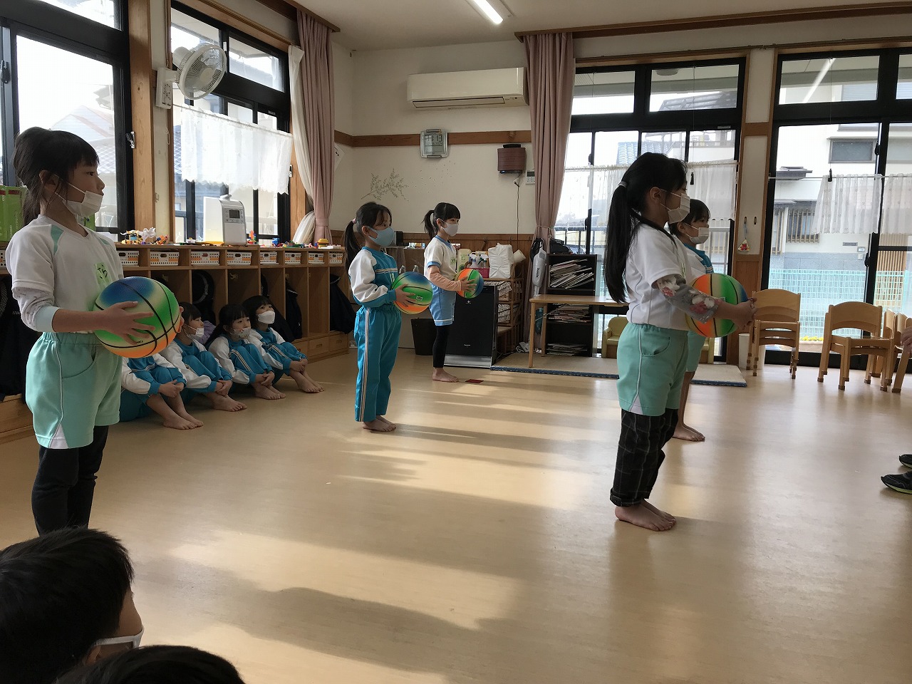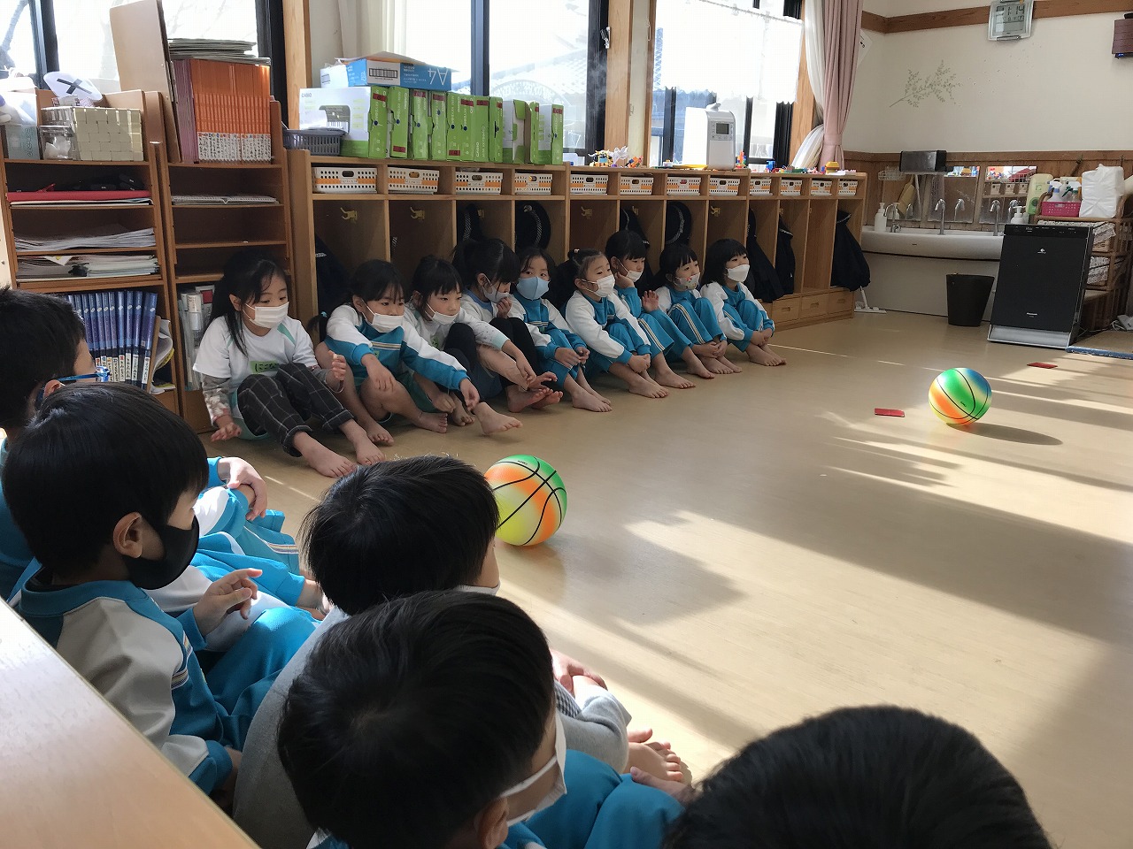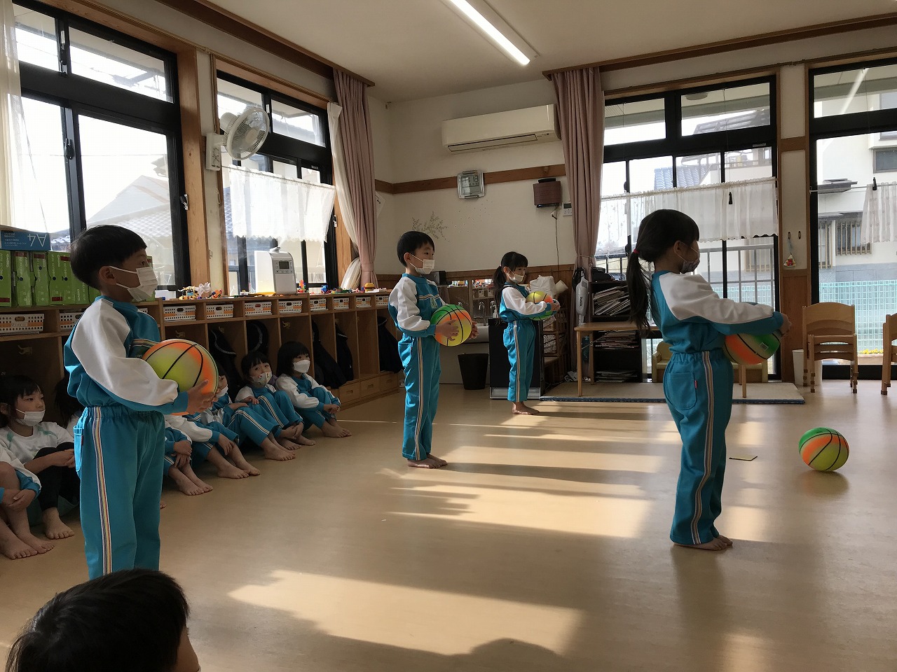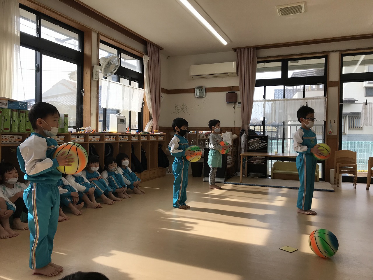 体操教室もありました。ボールを使って、体の周りを回したり、ボール突きをしたり、しっかりとお話を聞きながらがんばっていました。うめ組ともも組の様子をごらんください。