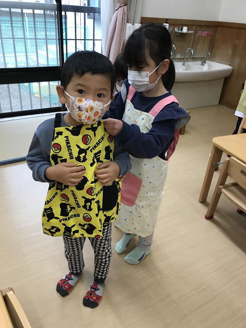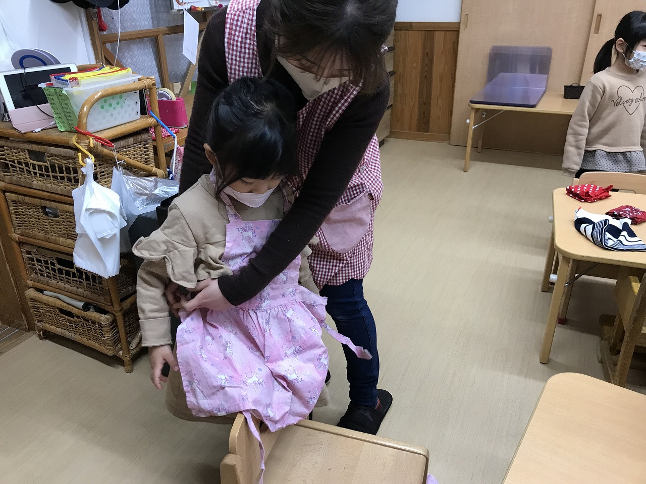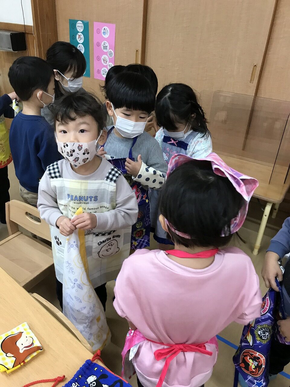 エプロンを結ぶのが難しい子は保育者や友だちに手伝ってもらいながら準備していました。