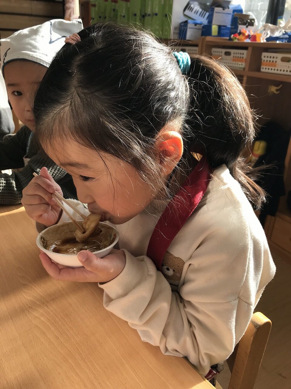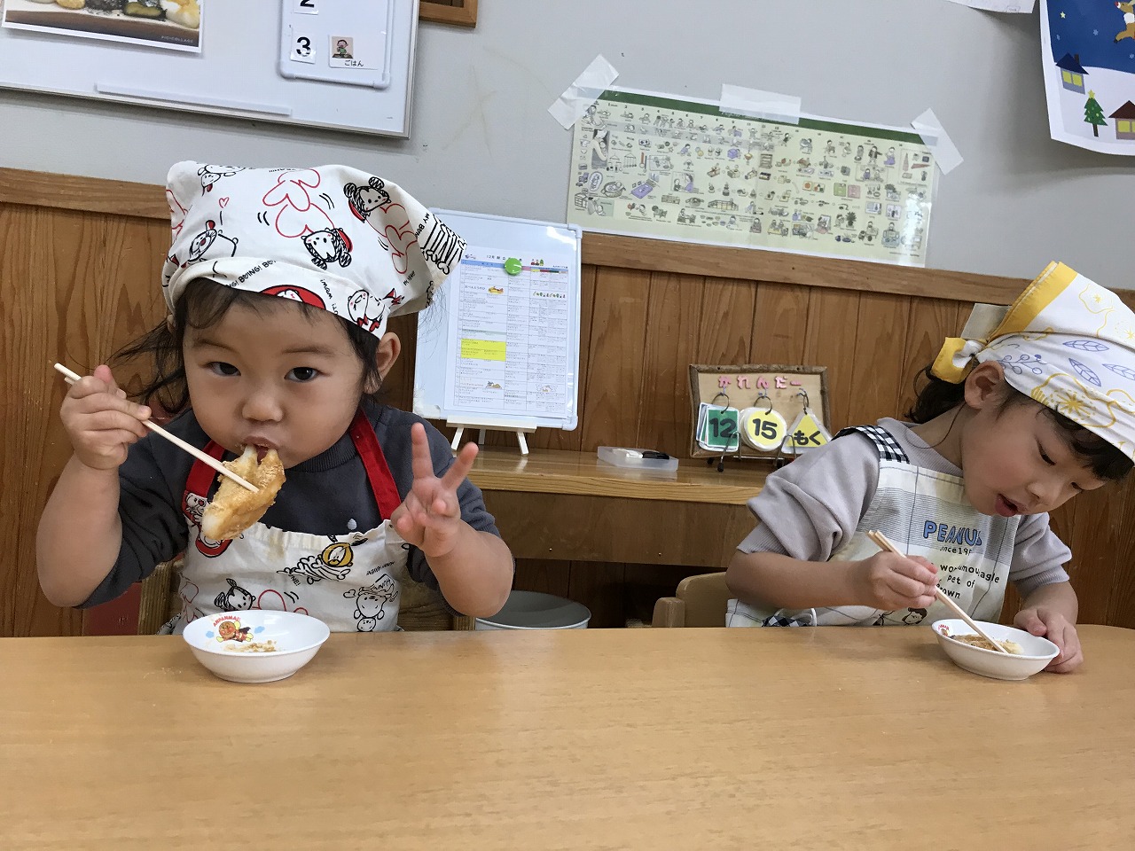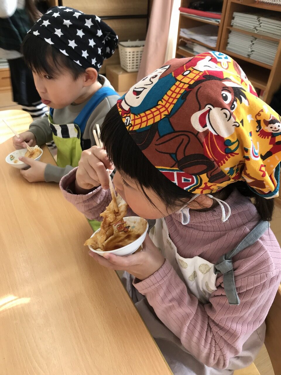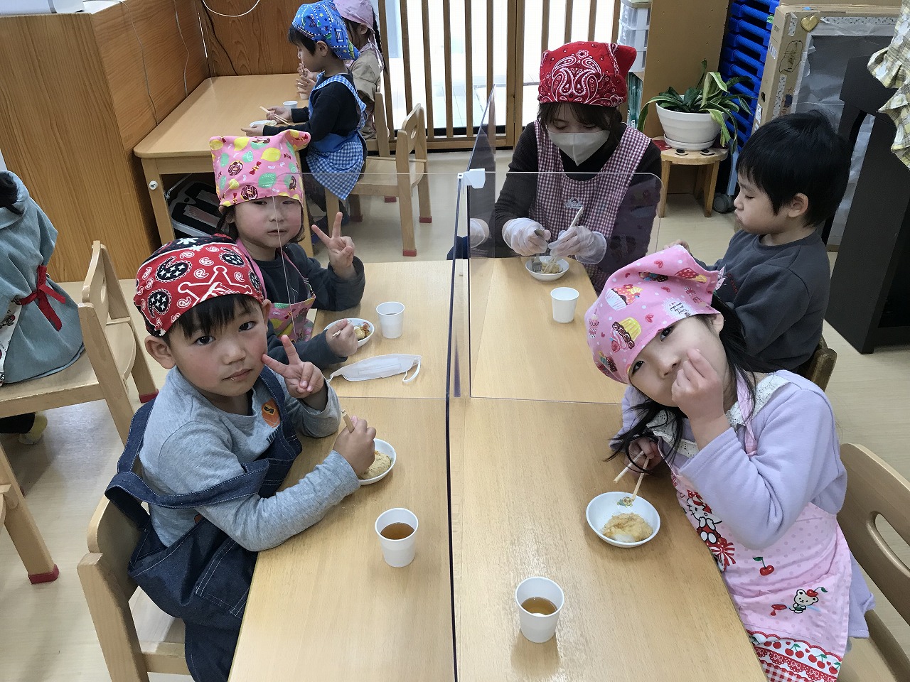 エプロンを結ぶのが難しい子は保育者や友だちに手伝ってもらいながら準備していました。