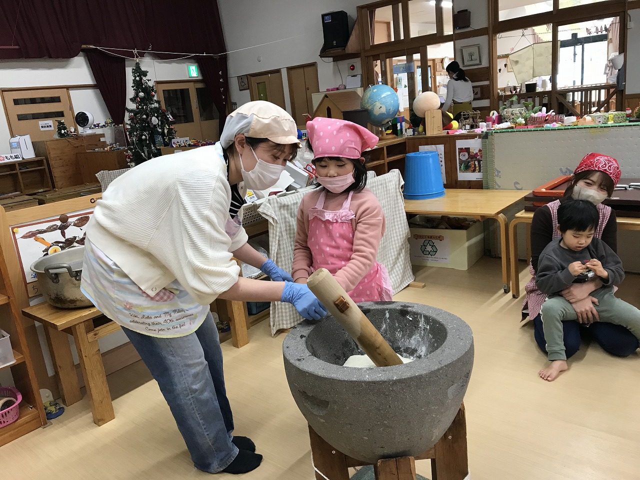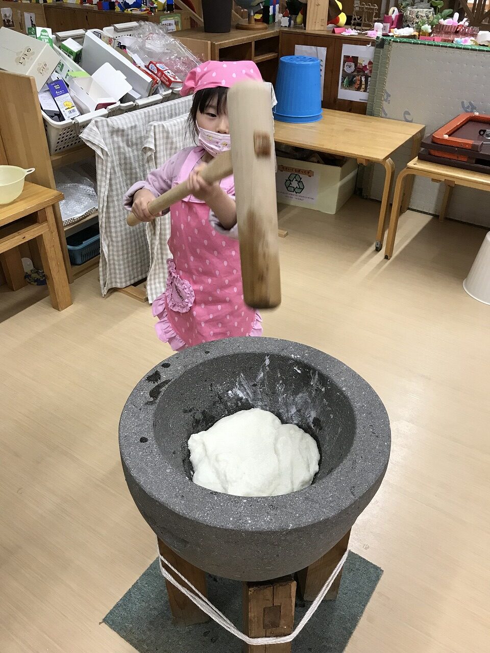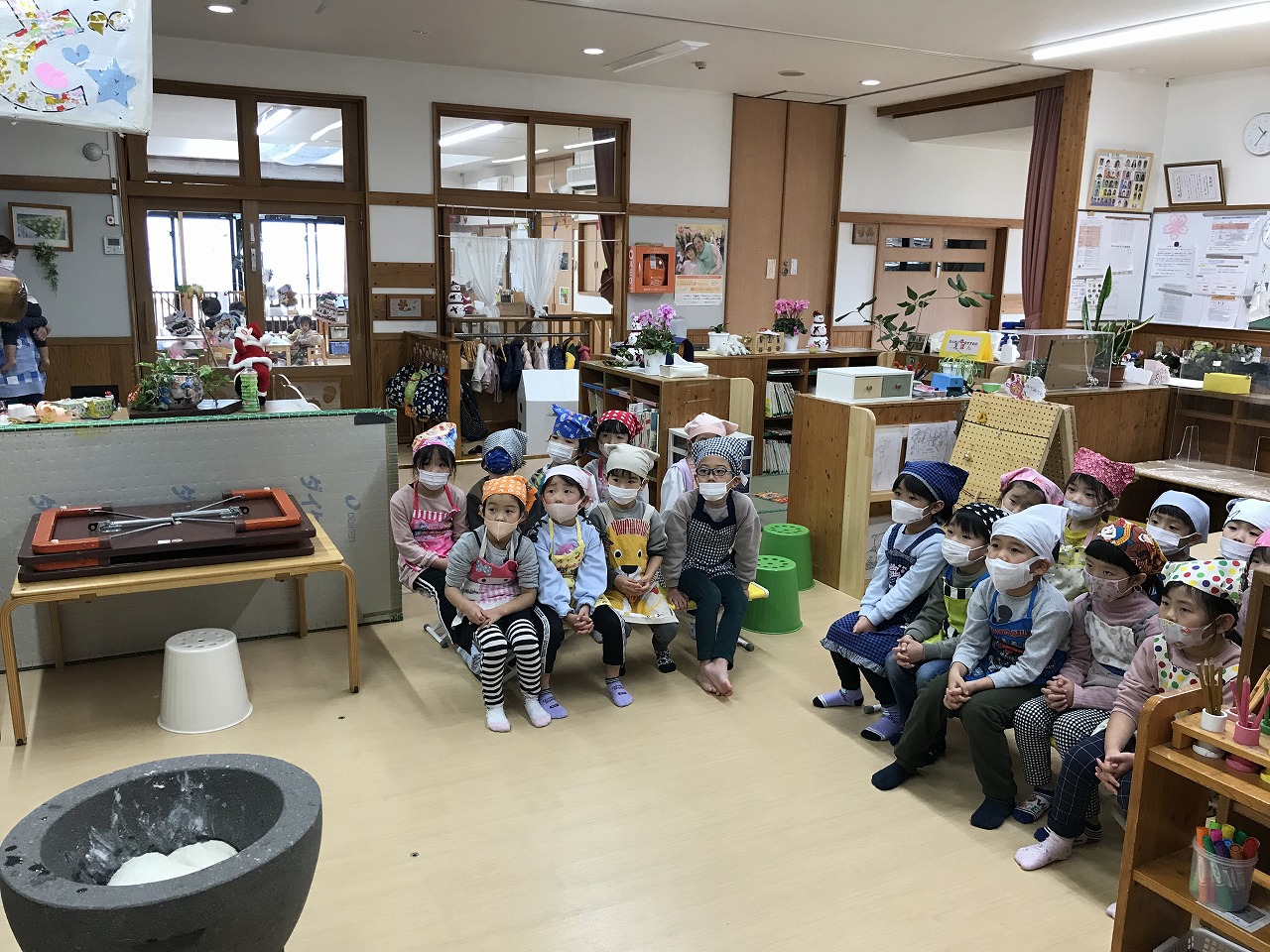 今日はもちつき!子ども達はワクワクしながら登園してきた、うめ組(3歳児)さくら組(4歳児)もも組(5歳児)です。