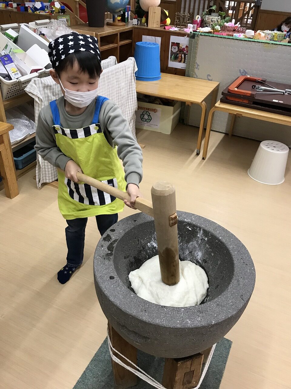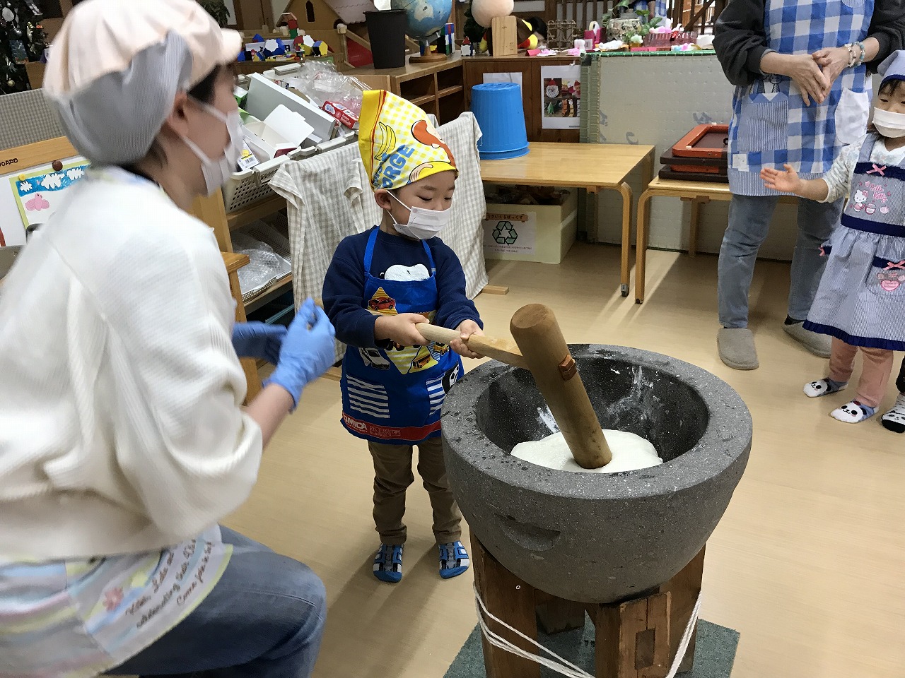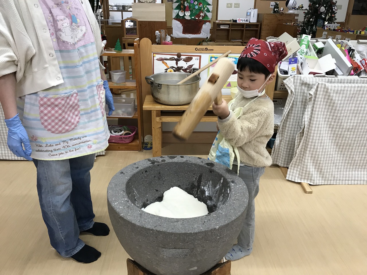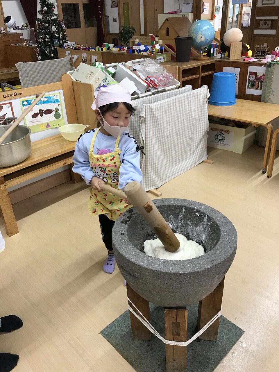 今日はもちつき!子ども達はワクワクしながら登園してきた、うめ組(3歳児)さくら組(4歳児)もも組(5歳児)です。