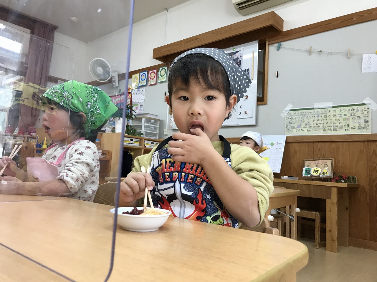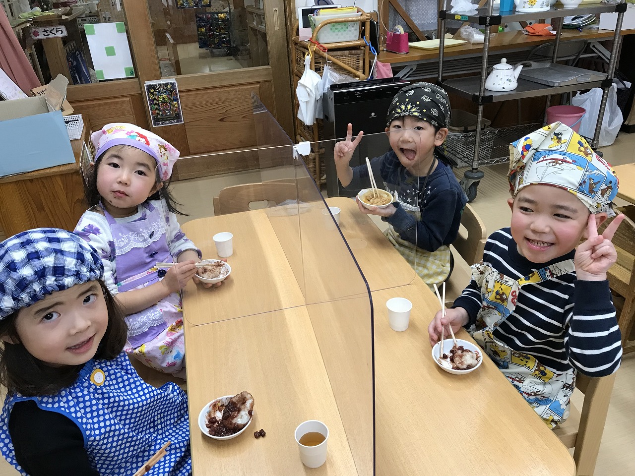 (きなこ、あんこ、砂糖醤油)の中から好きな味を選びおいしそうに食べていました!
