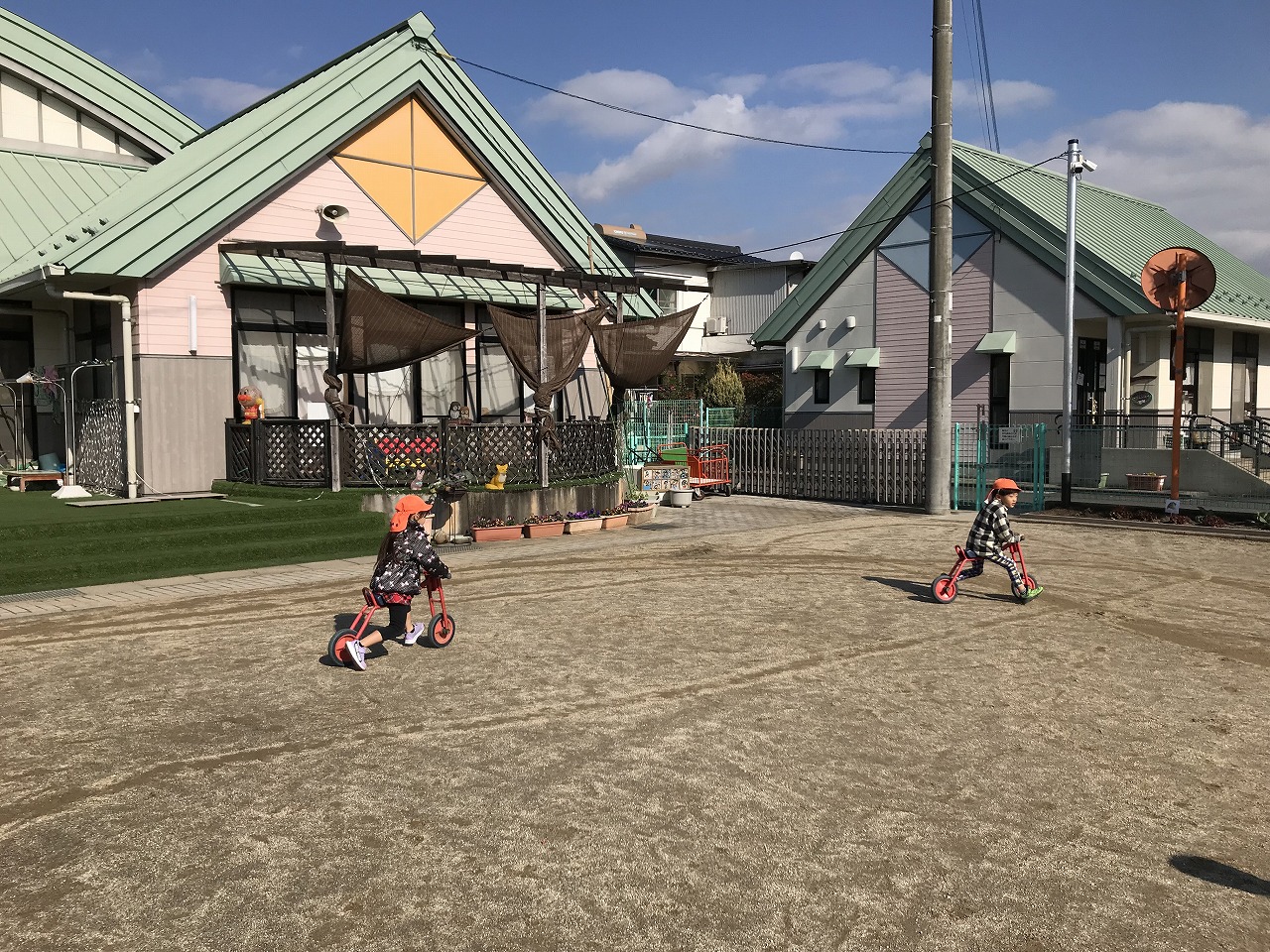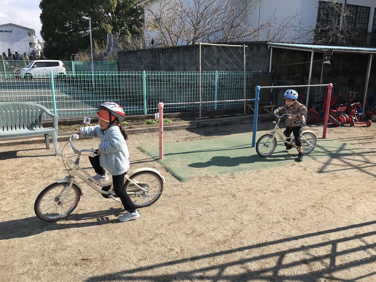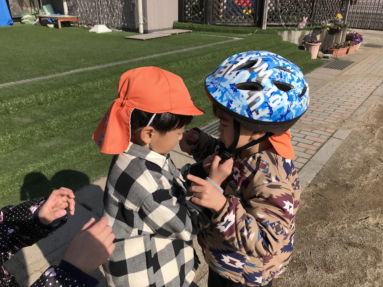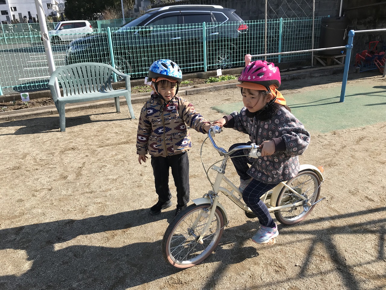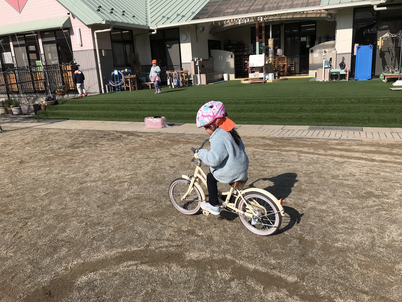 最近は自転車の練習をがんばっています。乗れる子も続々とでてきています。乗れた友だちが「ストライダーをたくさんするといいよ」と教えてくれると、たくさんストライダーの練習をしていました。ヘルメットの装着や、後ろを持ってあげたりなど友だちとの関わりもたくさん見られました。「がんばって~!」など応援も聞こえて楽しい外遊びでした。