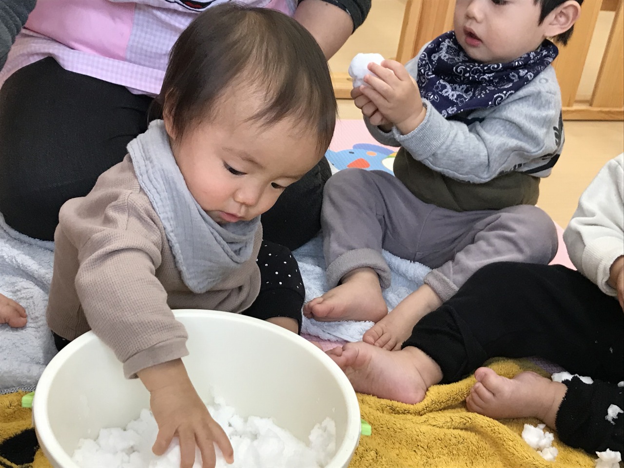 今日は一面真っ白の雪景色でした。ひよこ組(0歳児)の子どもたちも窓から見える雪に「あっ!」と指さしたりして反応をしていました。こんなにたくさんの雪を見るのはきっと初めてなのではないでしょうか。子ども達の目にはどのように映ったのでしょう。今日は楽器遊びをしたりお部屋で雪遊びをしました。リンリン鈴の音がなるのが楽しく楽器を振って音を楽しんだり音楽に合わせて体をゆらしたりと可愛いひよこ組さんでした。