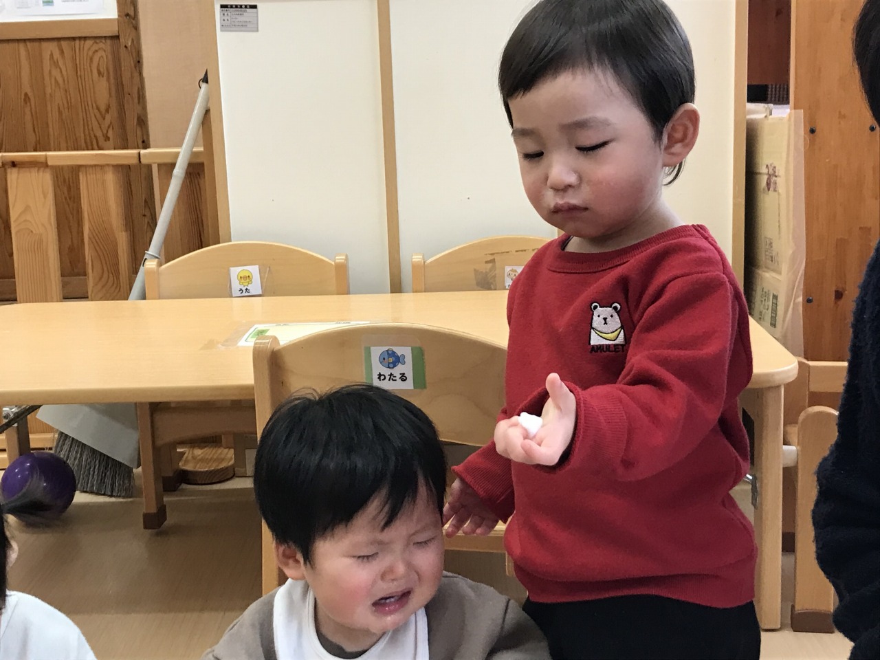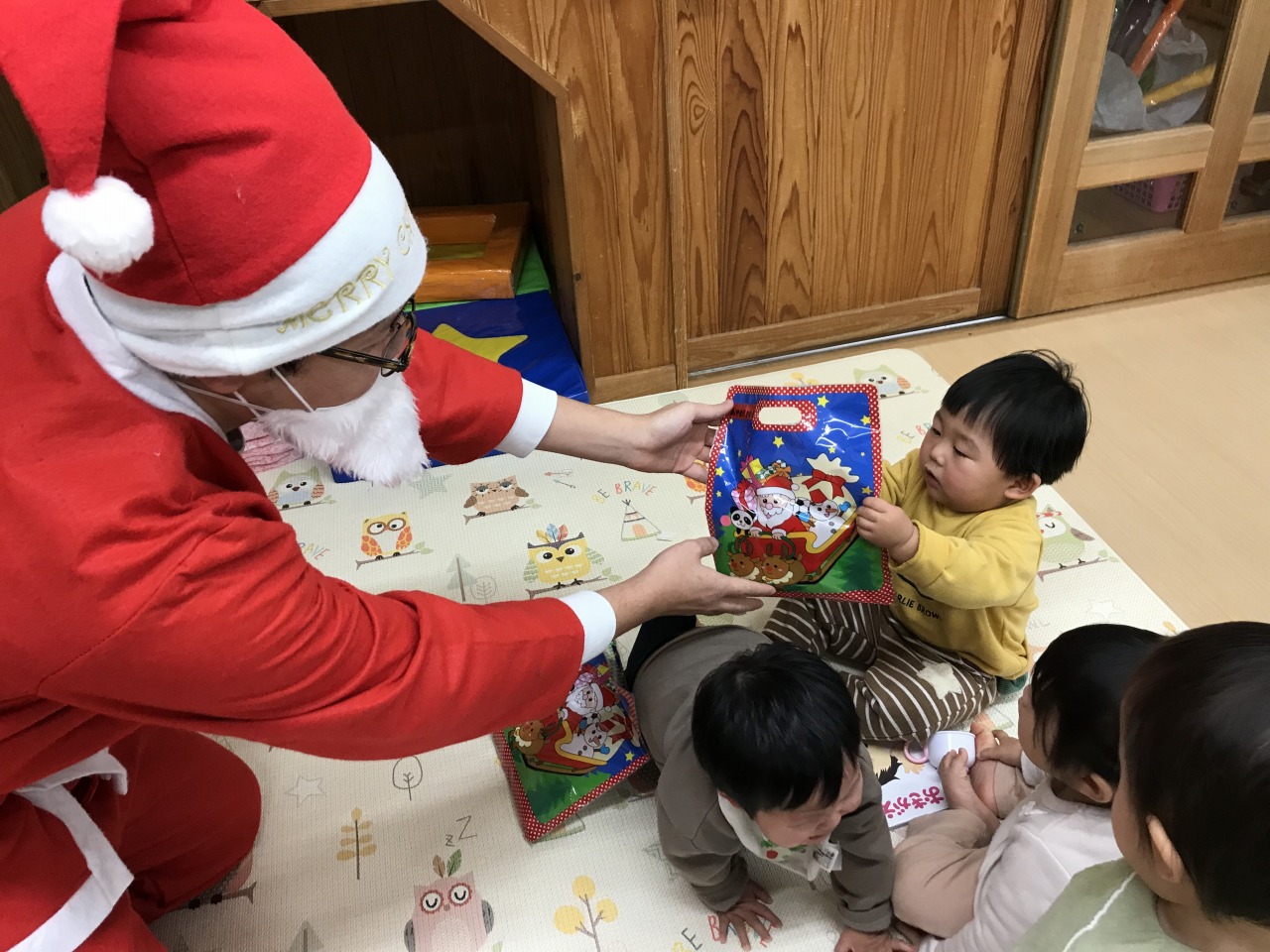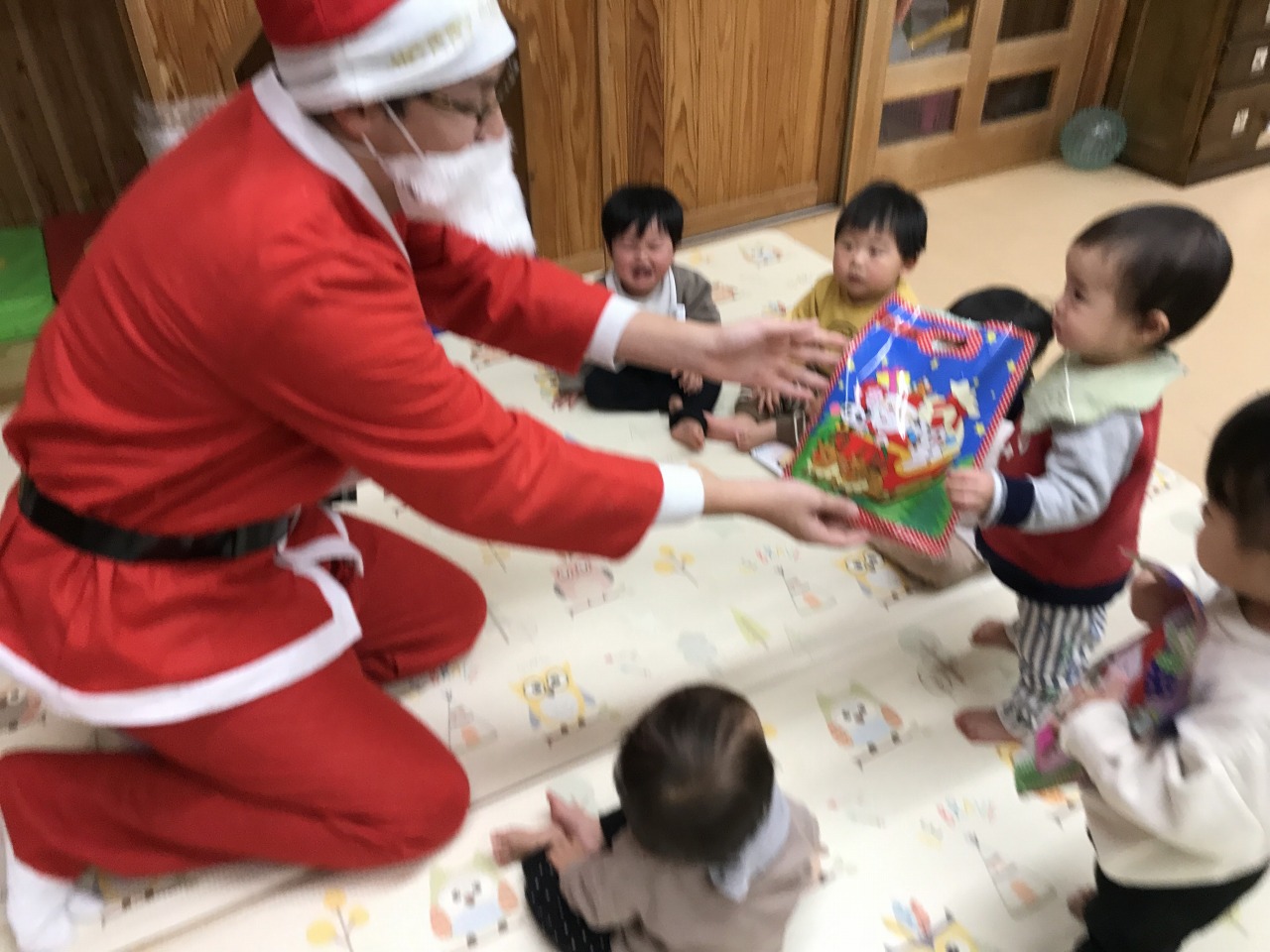 そして、遊んでいるところへなんと、サンタさんがプレゼントを持って来てくれました!みんな驚いて固まったり、保育士にくっついてきたり・・・けれど、優しいサンタさんだと分かると安心してプレゼントを受け取っていました。明日ホワイトクリスマスイブになりそうですね。