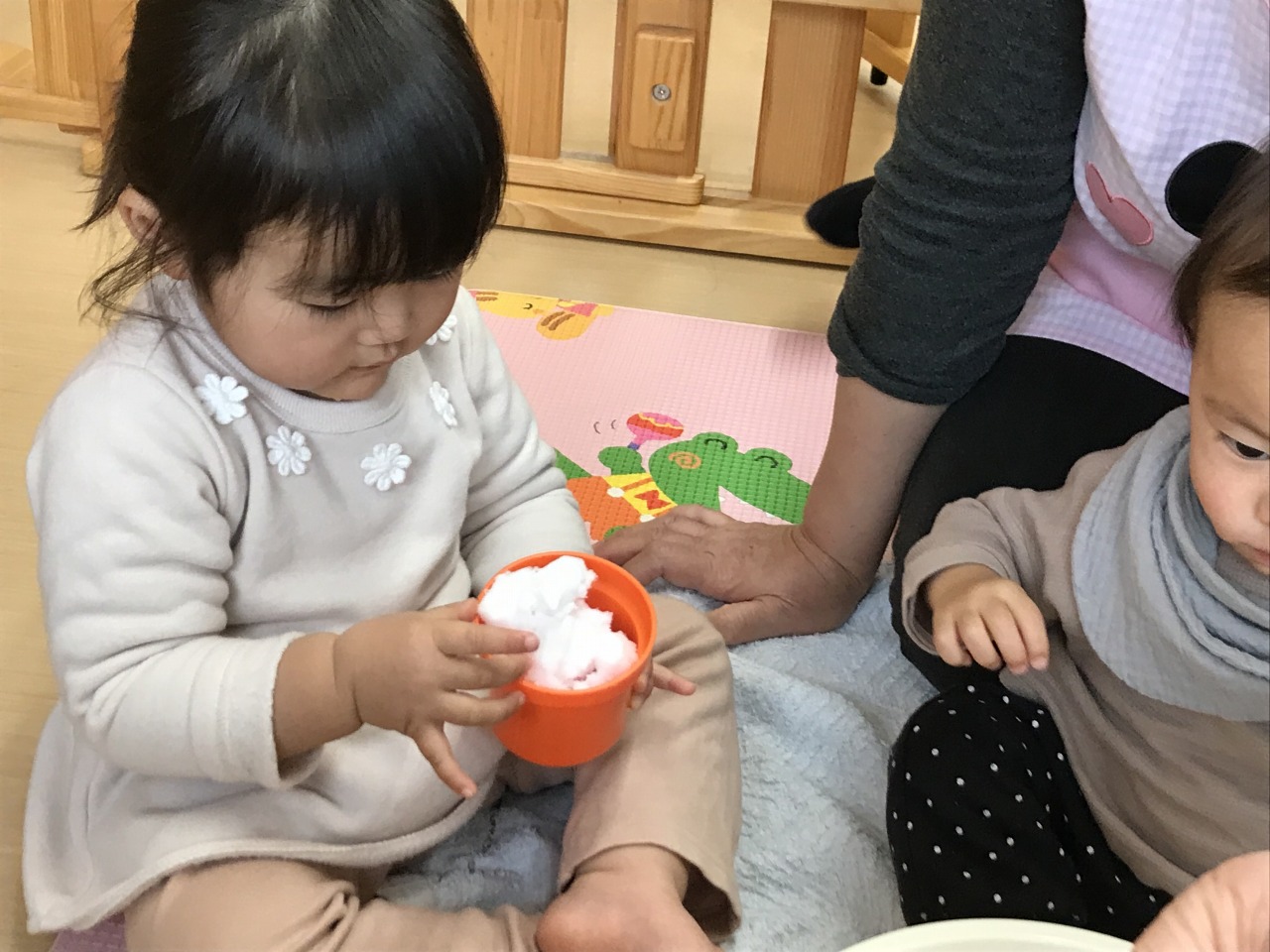 雪遊びでは、最初は触るのをためらう子どもが多かったですが、保育士が触ってみせたり、お友だちが遊んでいる姿を見て”大丈夫そうだからやってみようかな”と安心して次第に遊び出す子ども達でした。カップに入れたり、丸くした雪を手で握りしめたり冷たさを感じながらも楽しむ姿が可愛らしかったです。