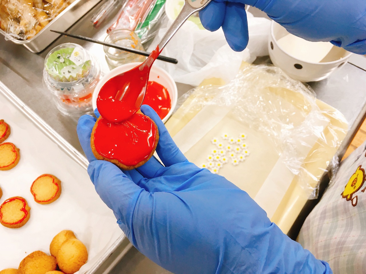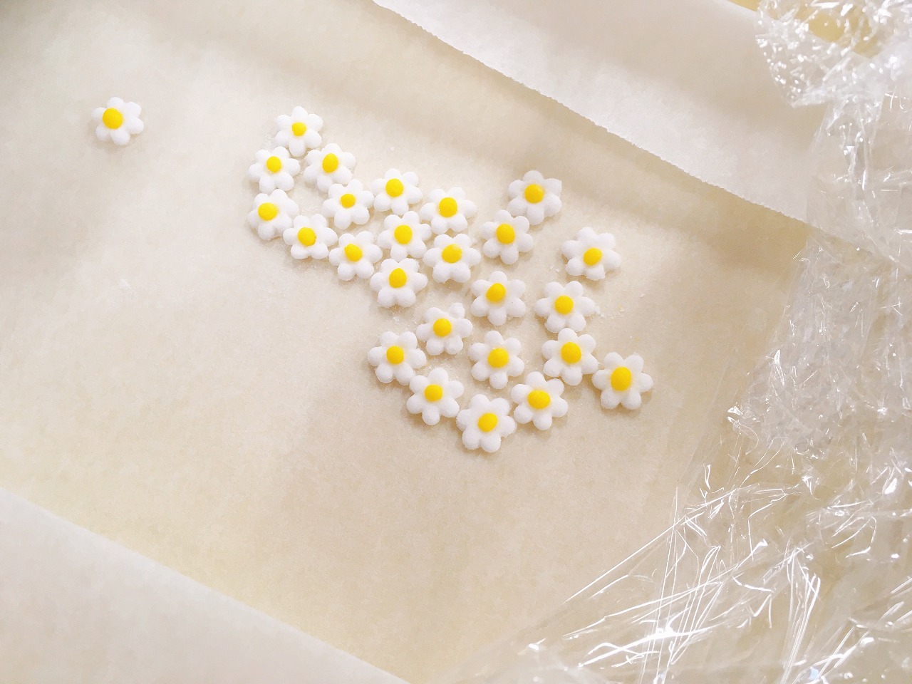 白雪姫をイメージしたりんごのの上にマシュマロフォンダントで作ったお花を乗せたアイシングクッキーを1人1枚ずつ付けています☺
