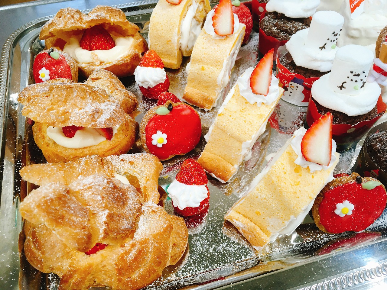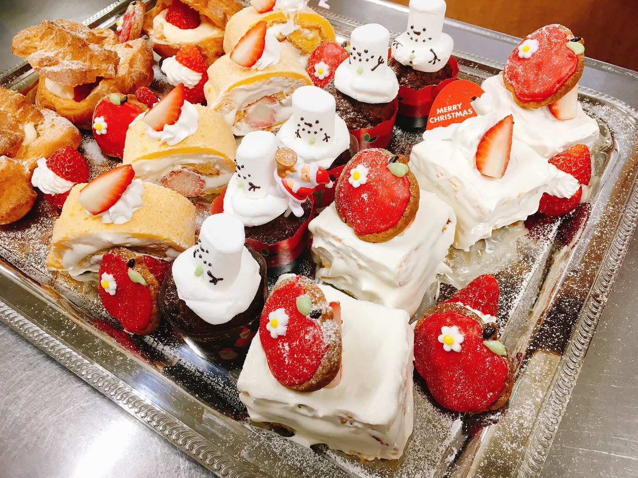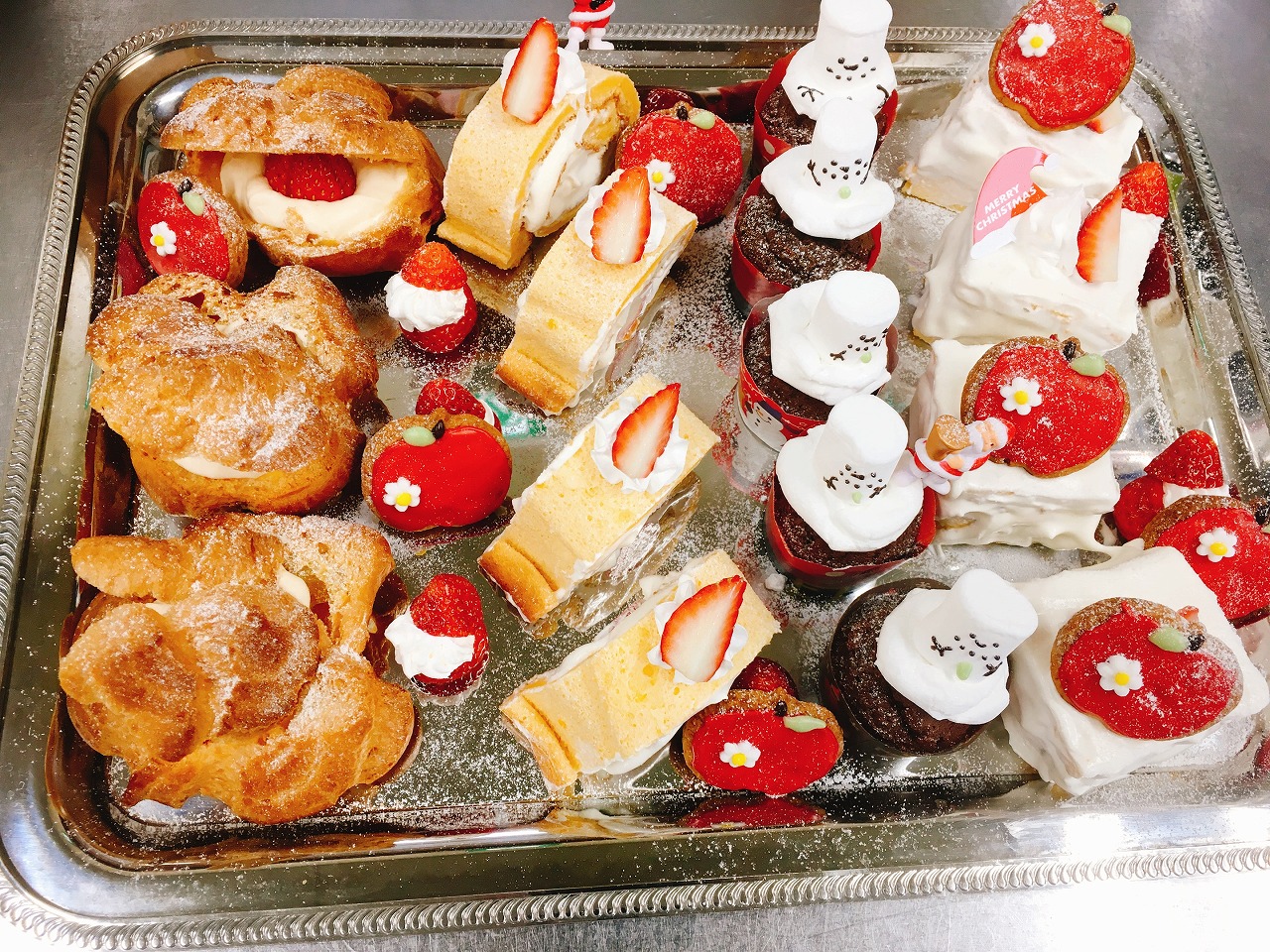 今年は、うめ・さくら・もも組さんはシュークリーム・いちごロール・ショートケーキ・スノーマンにしました。