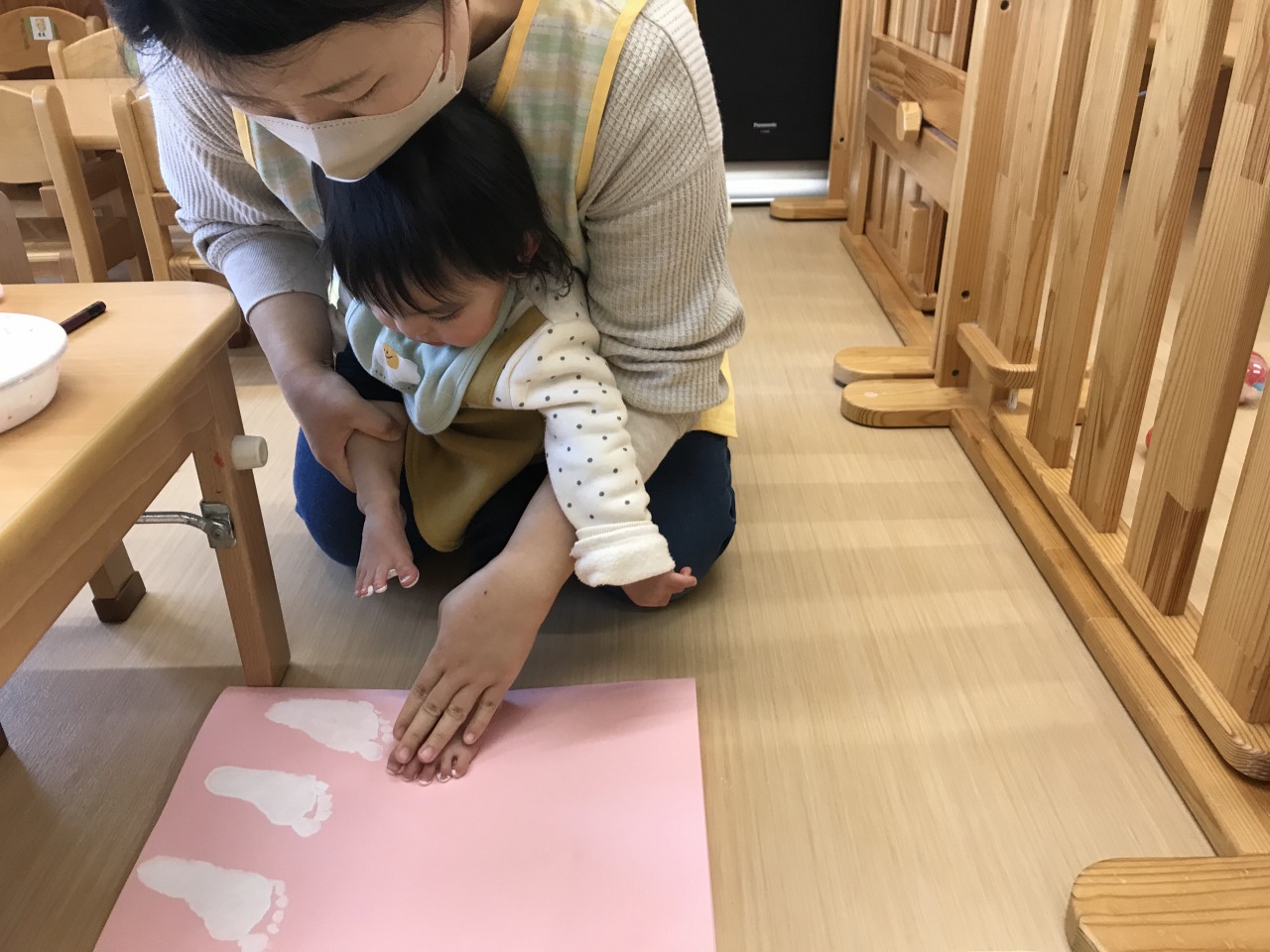 ひよこ組(0歳児)は今日制作遊びで足型をとりました。保育士等が「ぺったんしようか」と声を掛けると、嬉しそうにしていた子ども達です。保育士等が足の裏に白い絵の具で色を塗ると不思議そうにジーッと見つめていたので「足が白くなったね」「上手に足型がとれたね」などと声を掛け、安心して足型がとれるようにしています。足型が何になるか楽しみですね☆