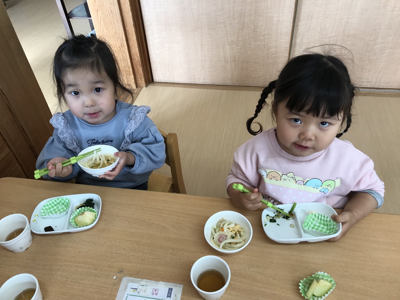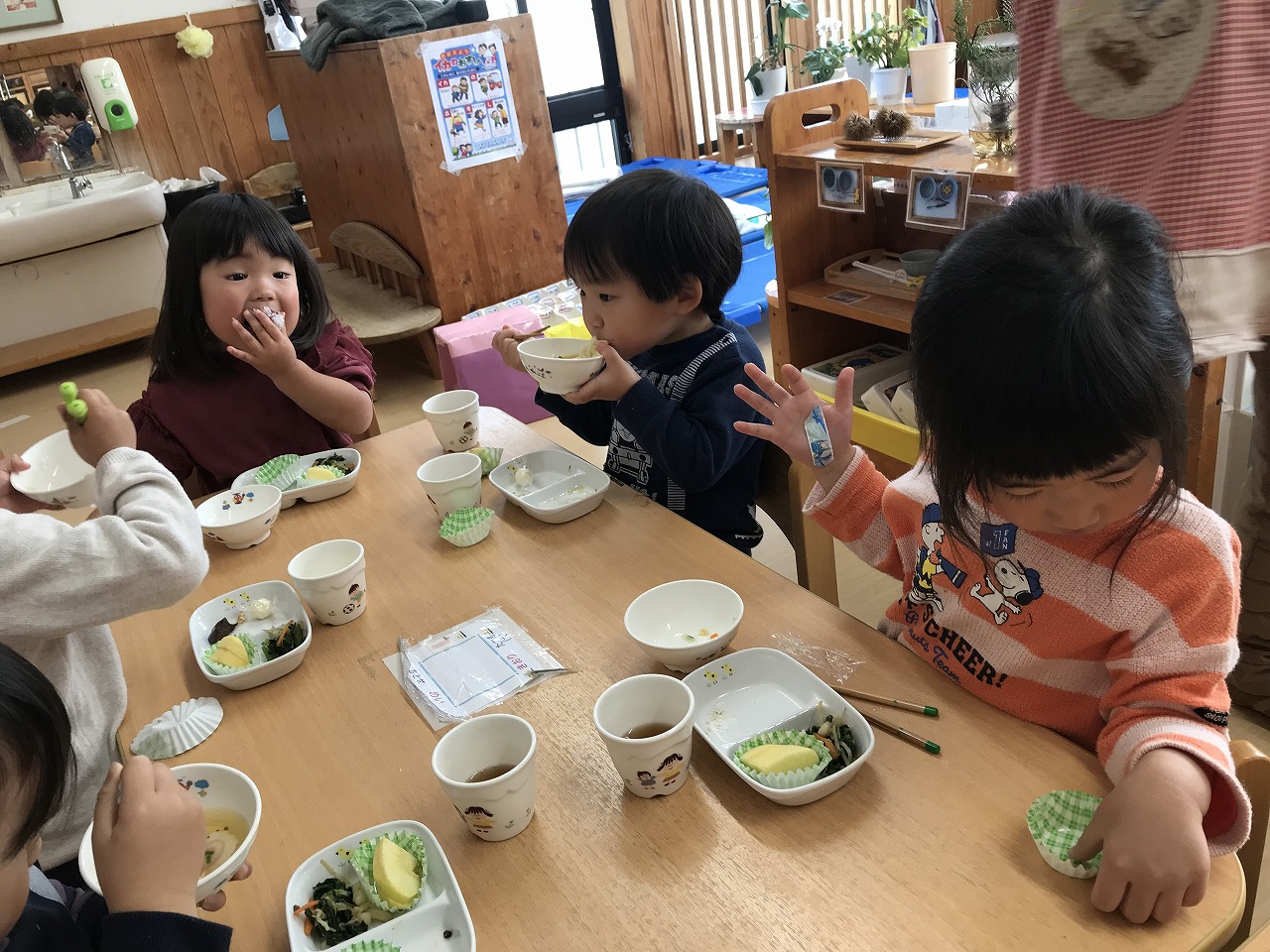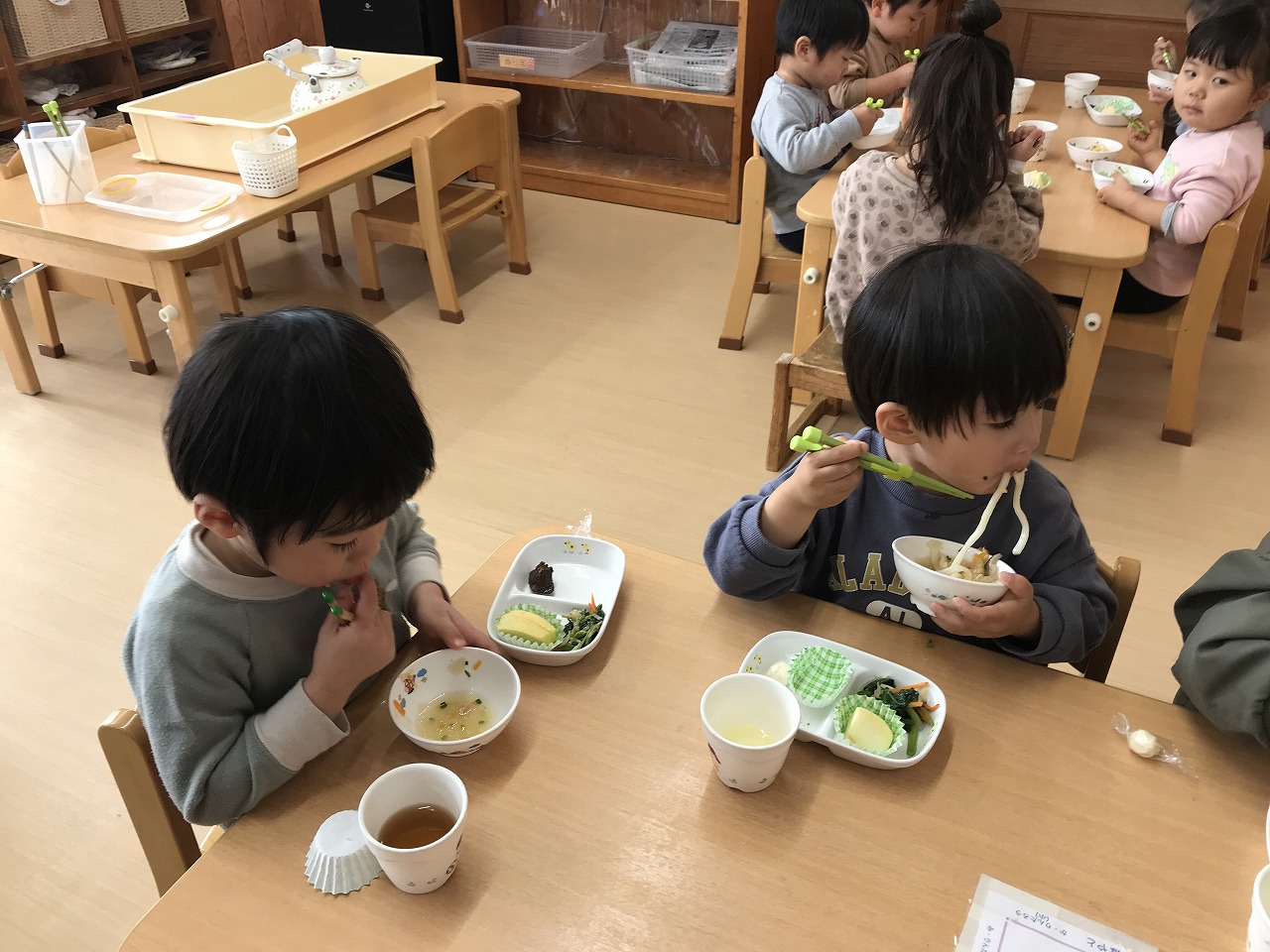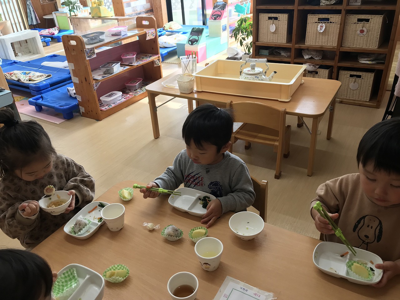 お昼ごはんではお箸の練習も始め、上手に使うことが出来るようになったお友だちも増えてきました。その中で「もうすぐ、うめ組さんになるね」と保育士等が話をすると「うめ組さん、やったー」「早くお兄ちゃんになりたい」などの声が聞こえてきて子どもたちも進級するのを楽しみにしているようです。