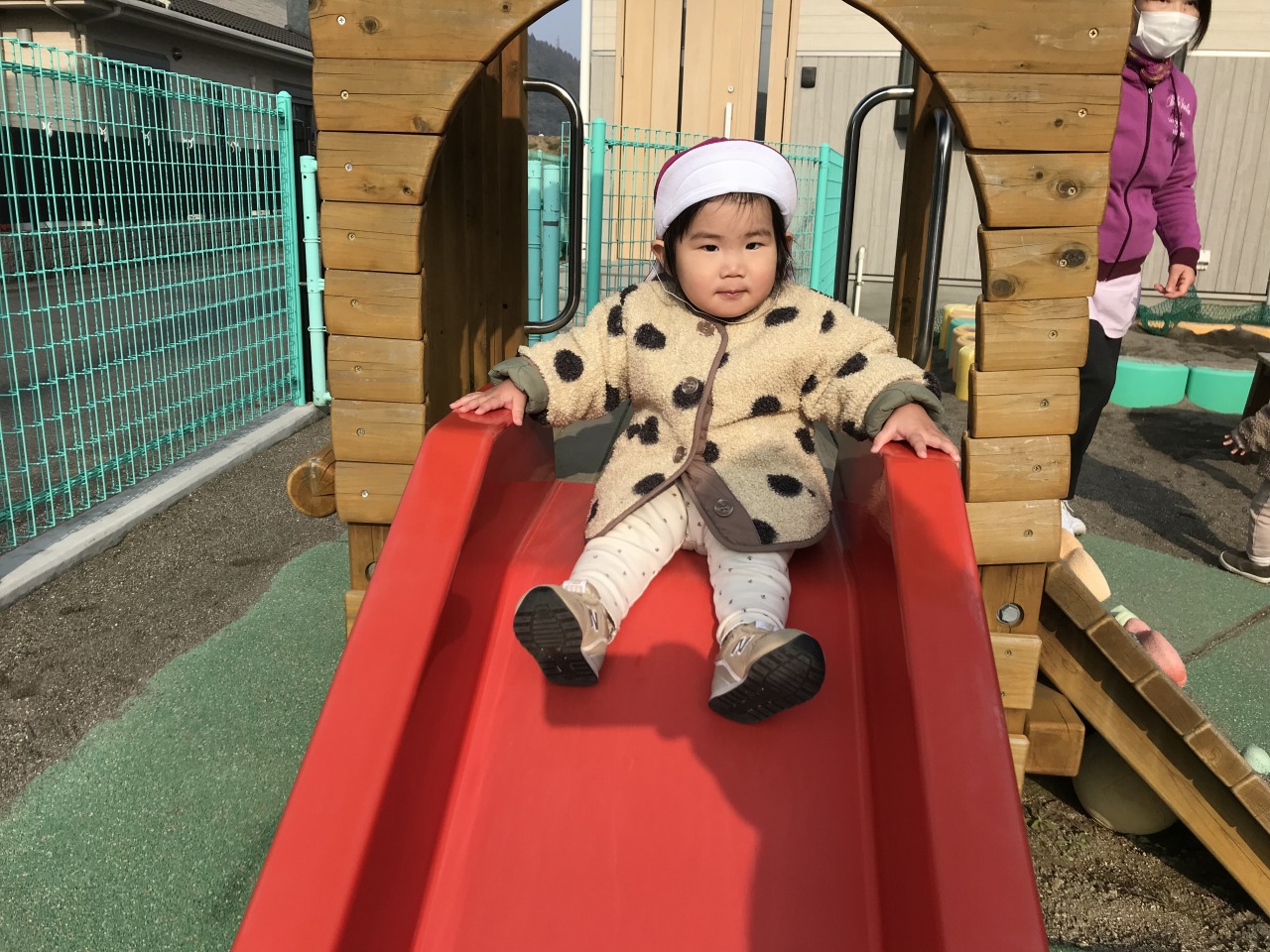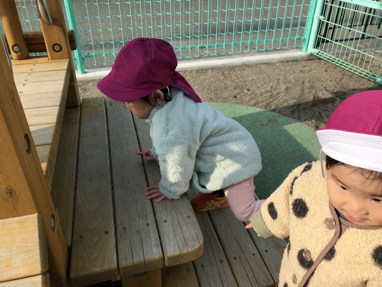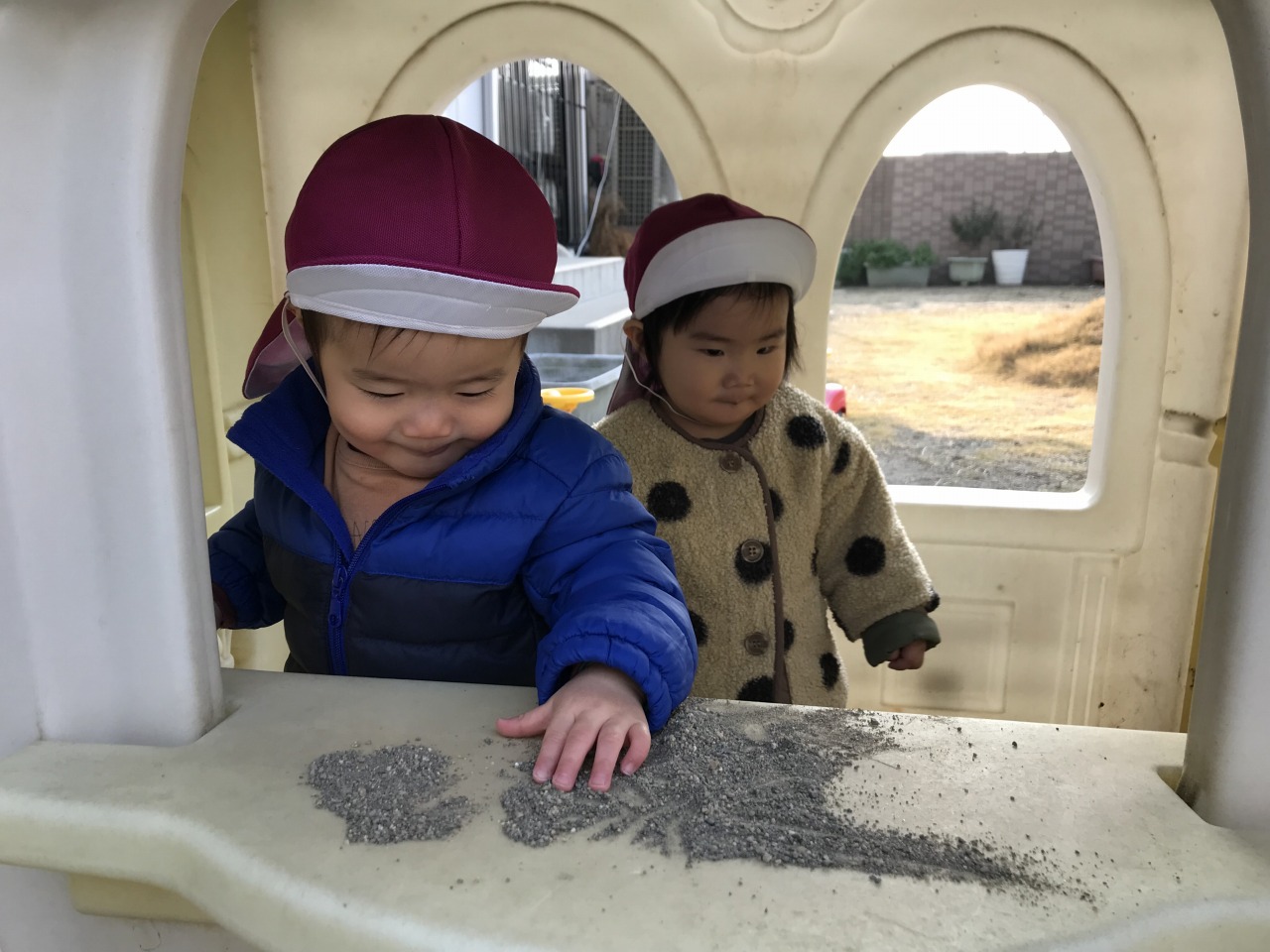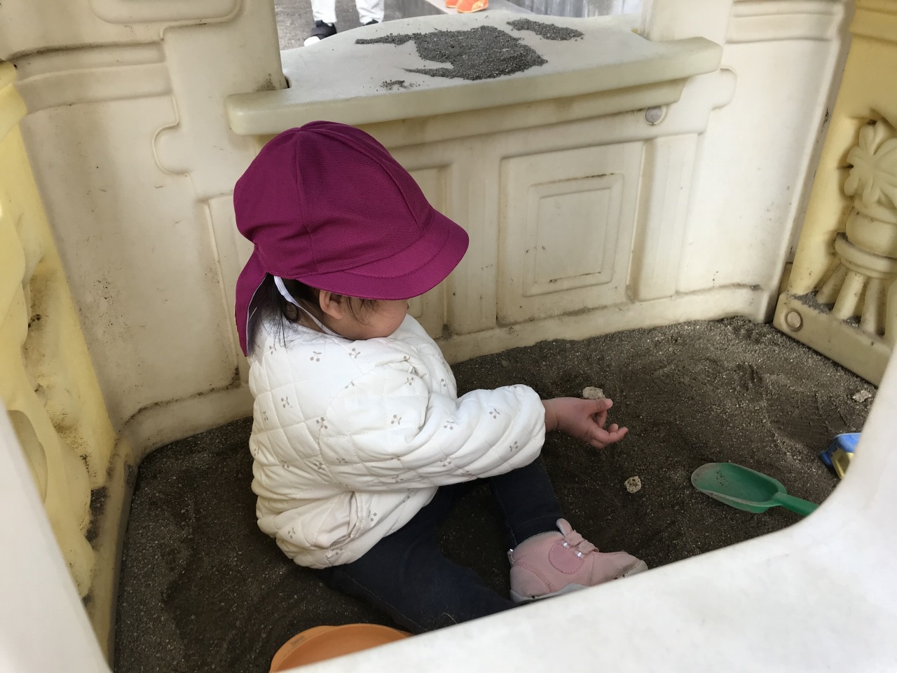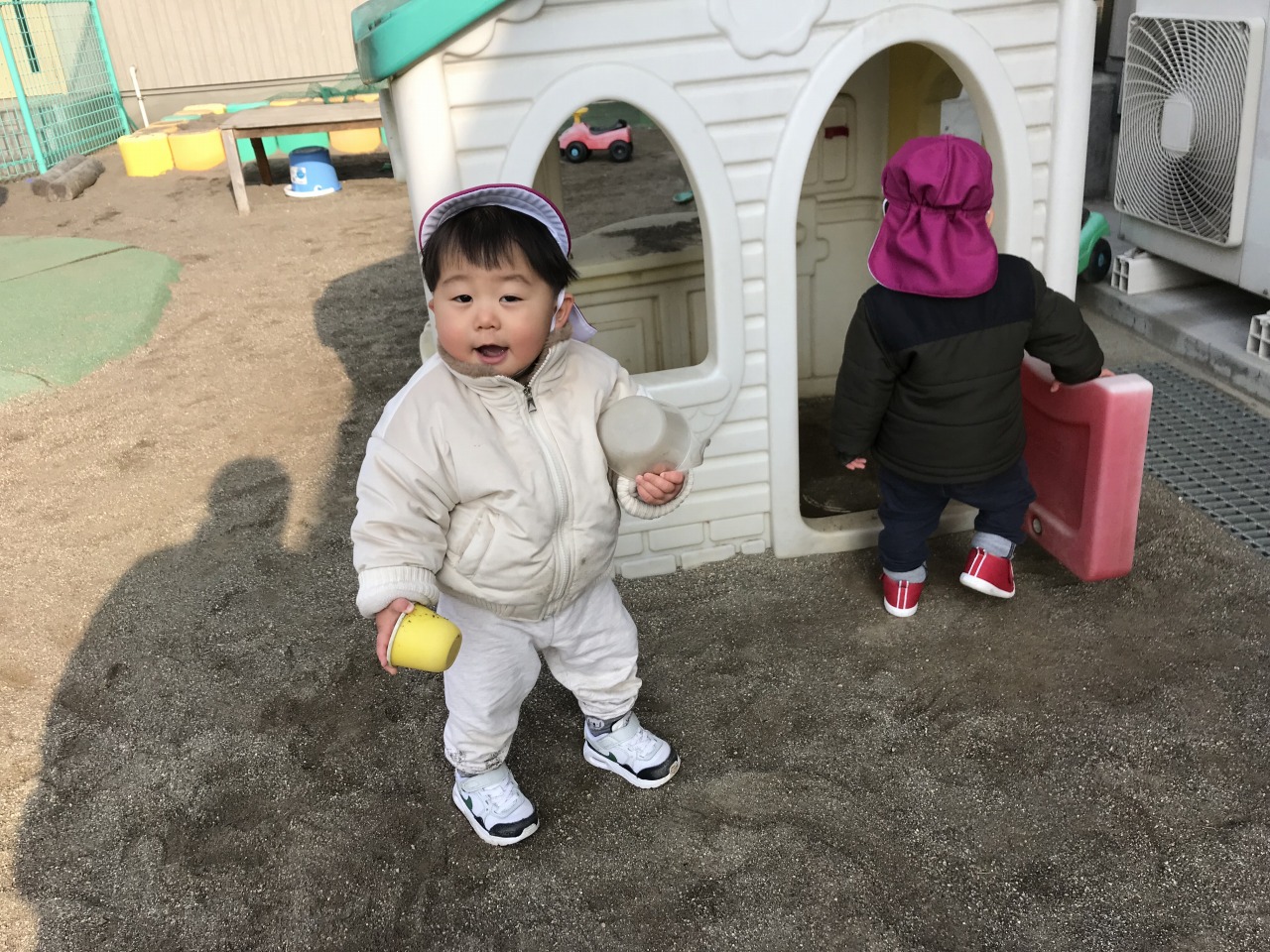 天気が良かったので、ひよこ組(0歳児)は裏庭で遊びました。お外で遊ぶのが大好きな子どもたち。小さいおうちの中に入ってままごとをしたり、階段やロッククライムから登って繰り返し滑り台を滑って遊んだりして、沢山身体を動かして遊んでいました。保育士等と砂遊びをしていると、保育士等の動作の真似をして遊んでいる子どもの姿も見られました。身体の使い方も上手になってきて車に乗って前に進む、山を登るなど様々な遊びができるようになっているので、色んな遊びに挑戦ができるようにしていきたいです。
