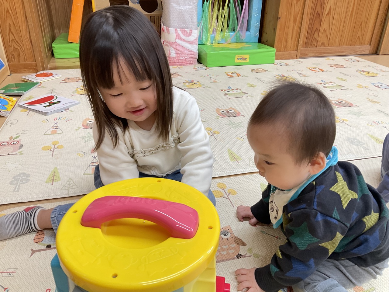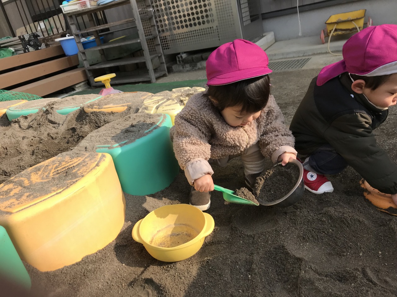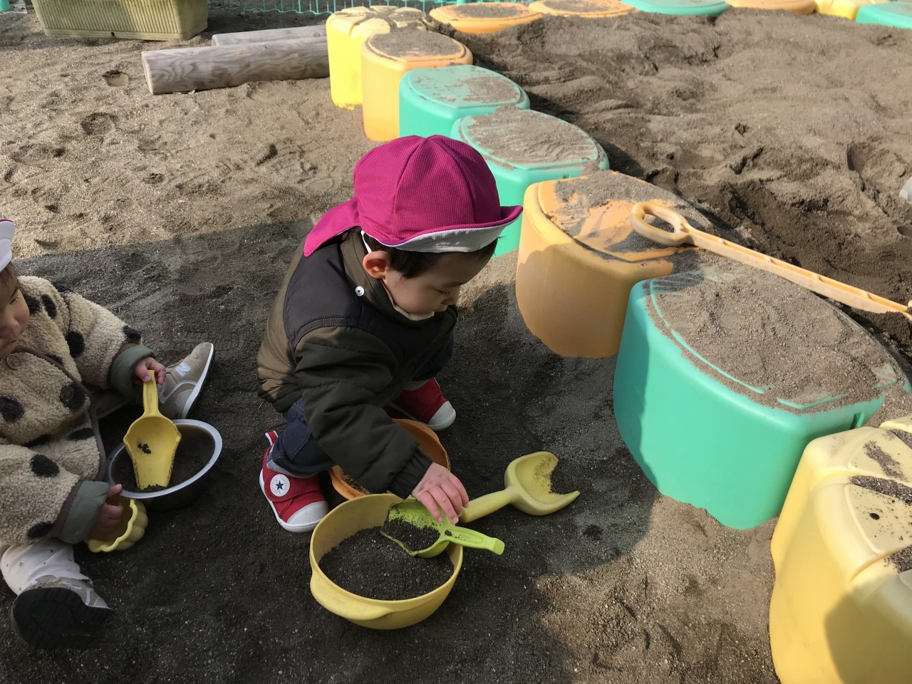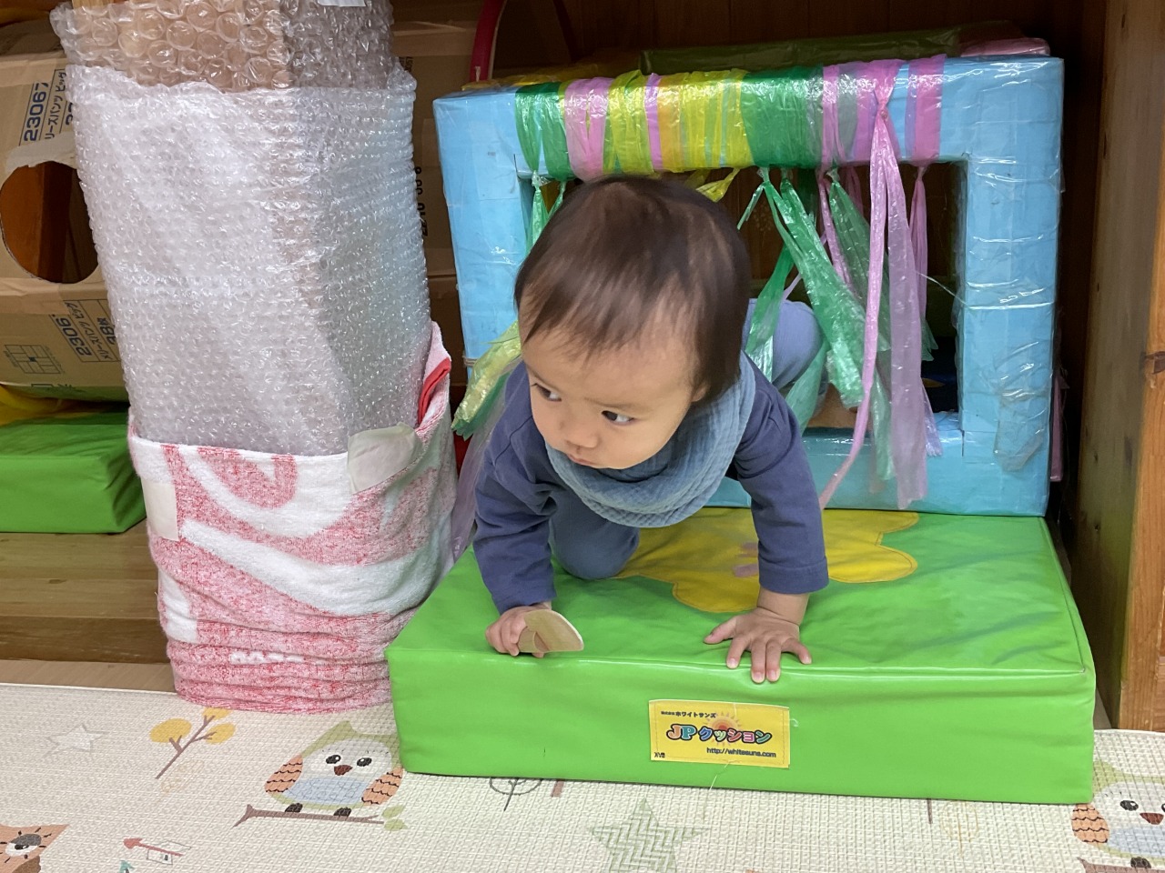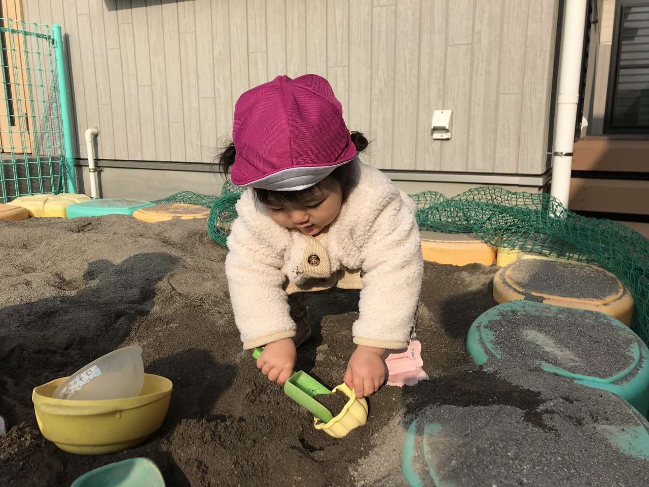 天気が良かったので、ひよこ組(0歳児)は裏庭で遊びました。お外で遊ぶのが大好きな子どもたち。小さいおうちの中に入ってままごとをしたり、階段やロッククライムから登って繰り返し滑り台を滑って遊んだりして、沢山身体を動かして遊んでいました。保育士等と砂遊びをしていると、保育士等の動作の真似をして遊んでいる子どもの姿も見られました。身体の使い方も上手になってきて車に乗って前に進む、山を登るなど様々な遊びができるようになっているので、色んな遊びに挑戦ができるようにしていきたいです。