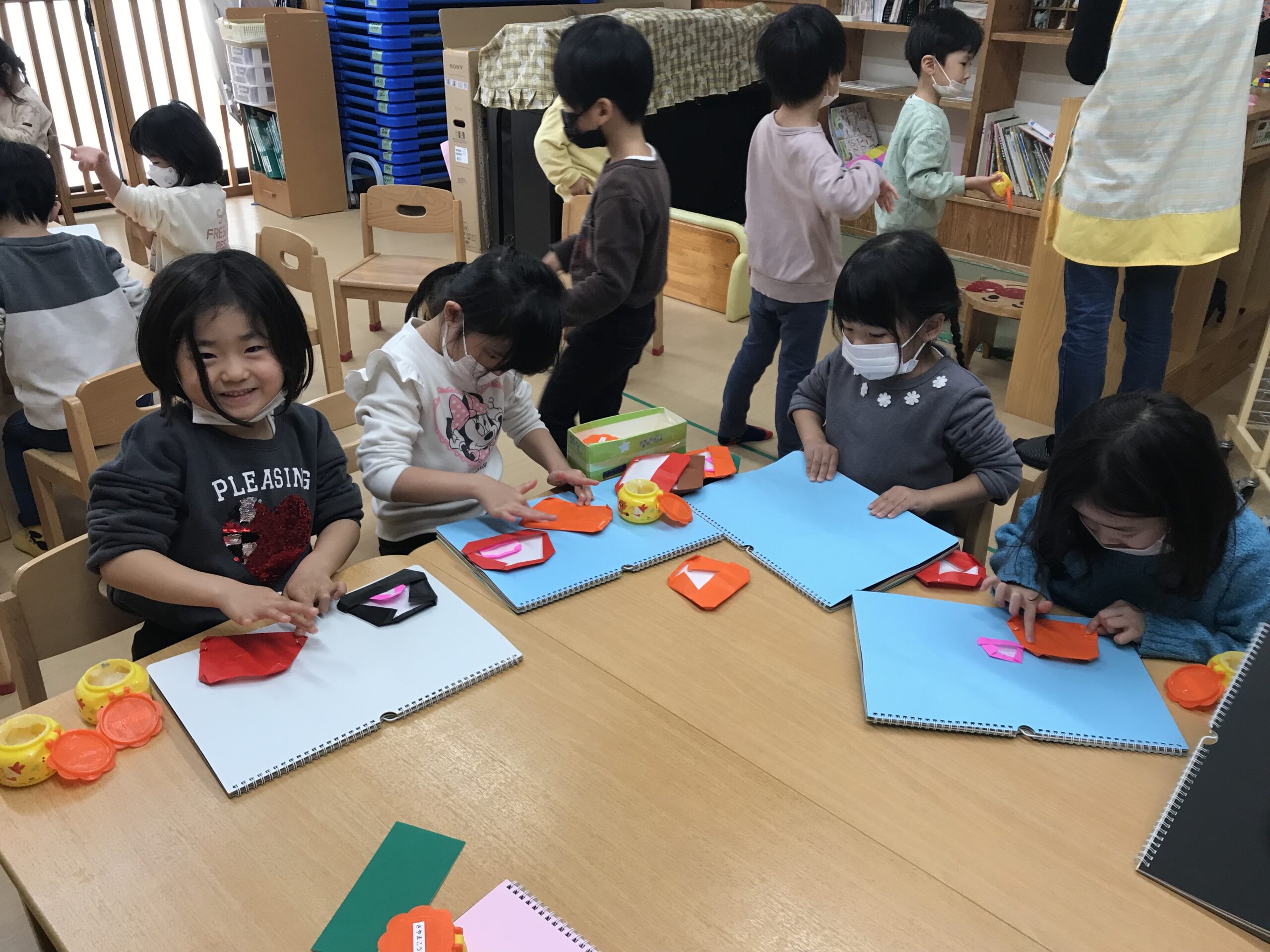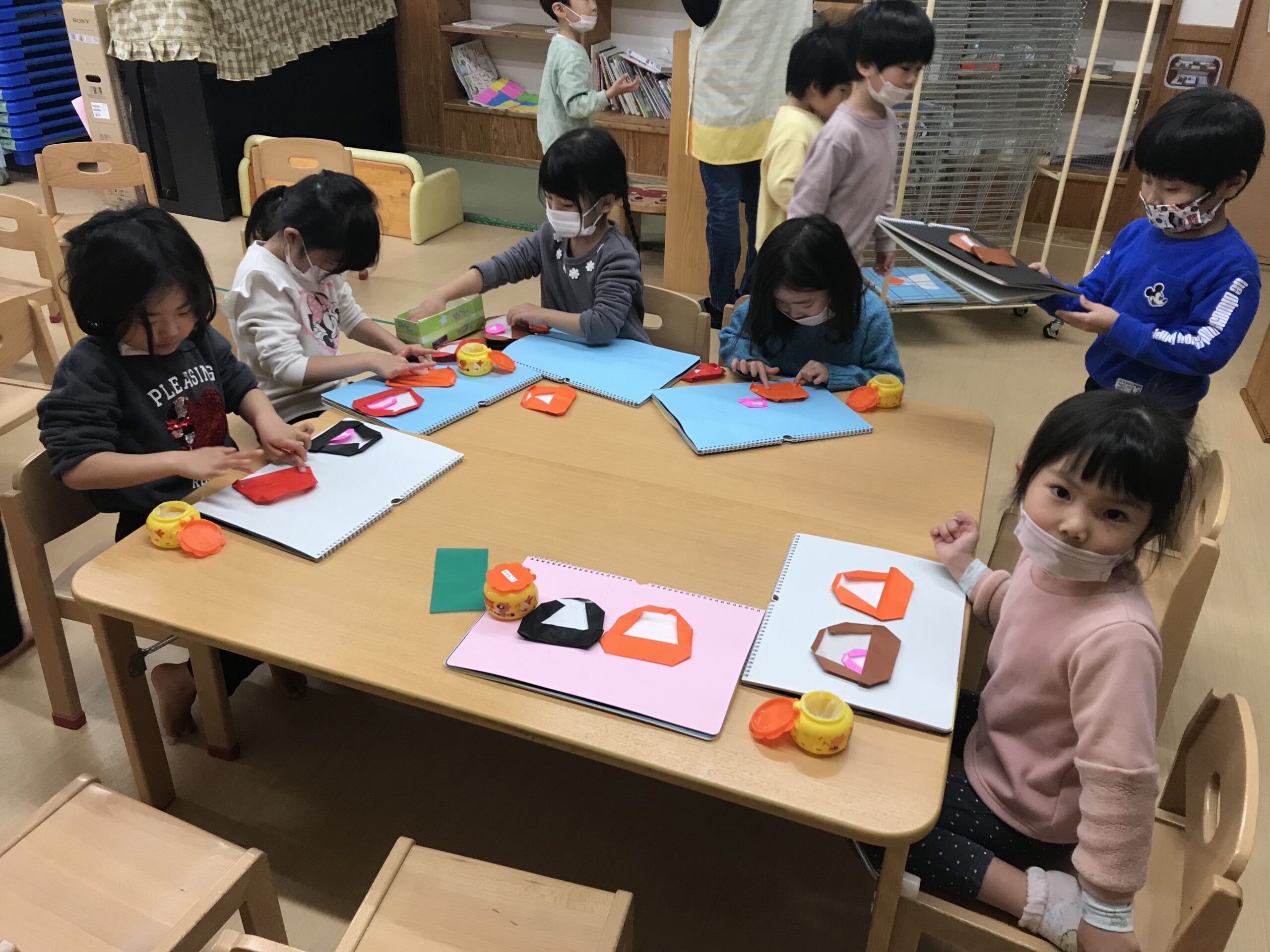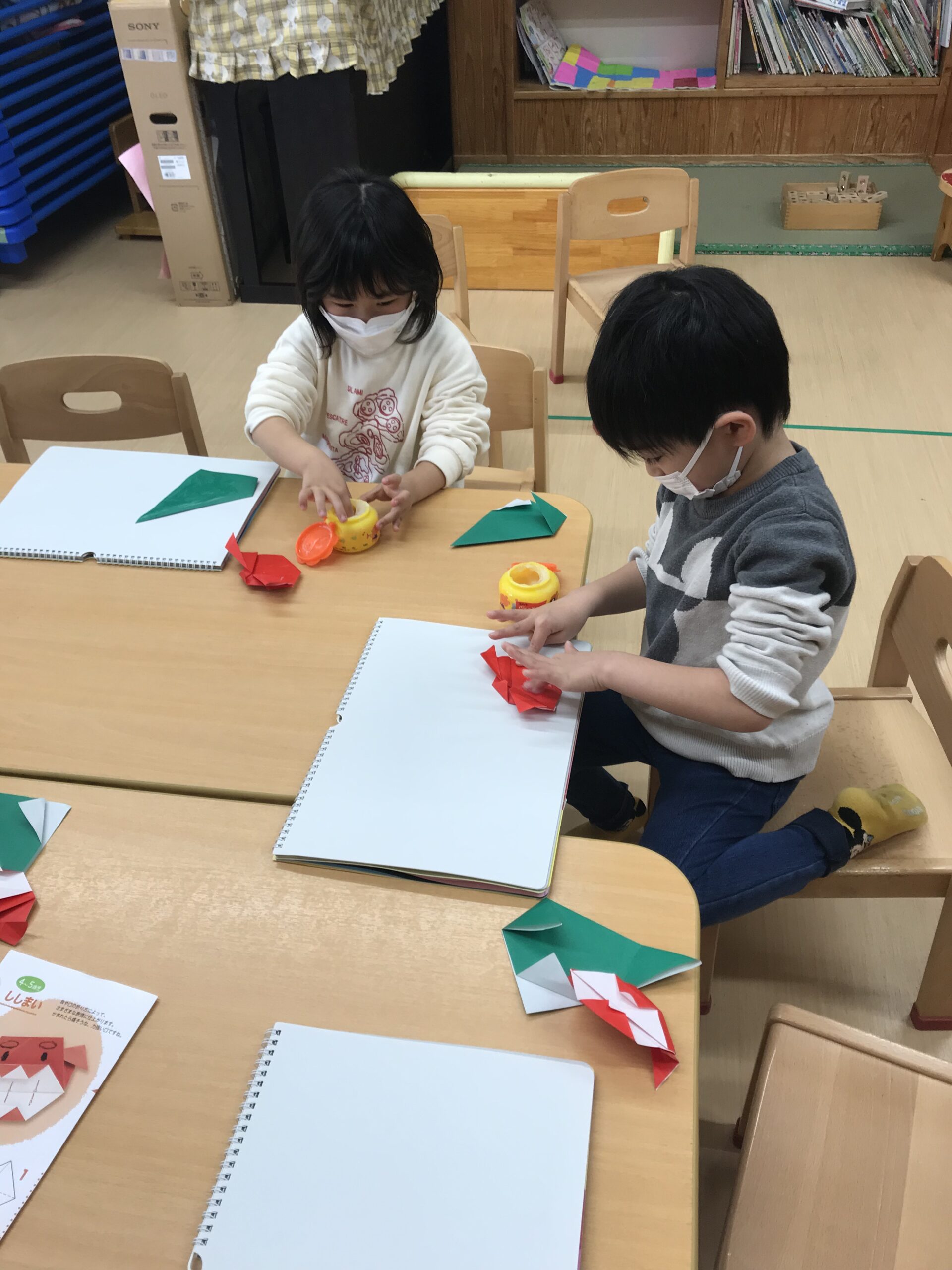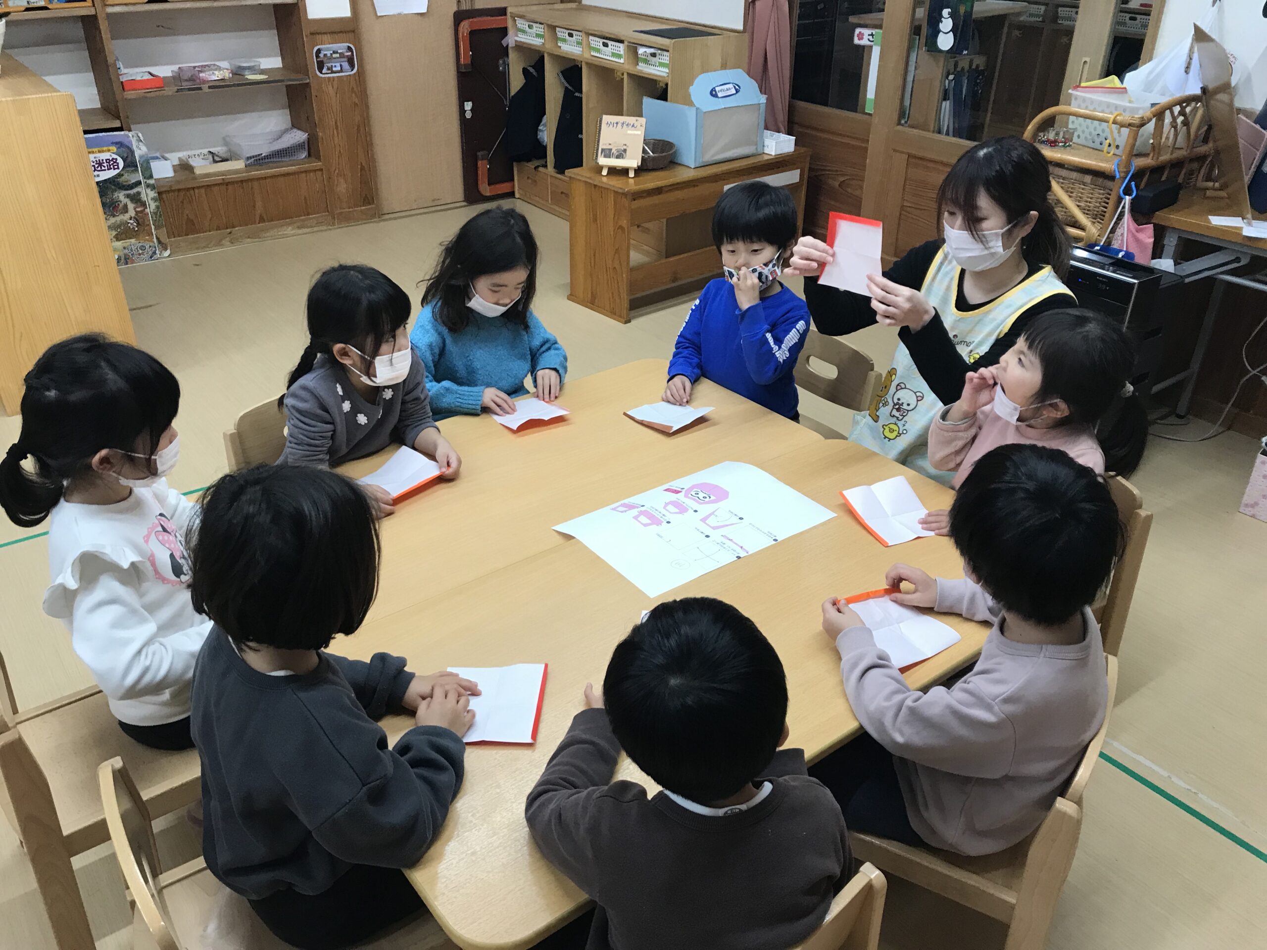 体操教室を終えて、折り紙制作を楽しみました。1月にちなんだ「だるま」や「ししまい」を折りました。縁起だるまやししまいの写真を見ると興味津々でお話を聞いていました。お正月ならではのお話を聞きながら楽しく折り紙を折りました。明日は、今日の続きでだるまやししまいに絵を描いていく予定です!完成が楽しみです♩