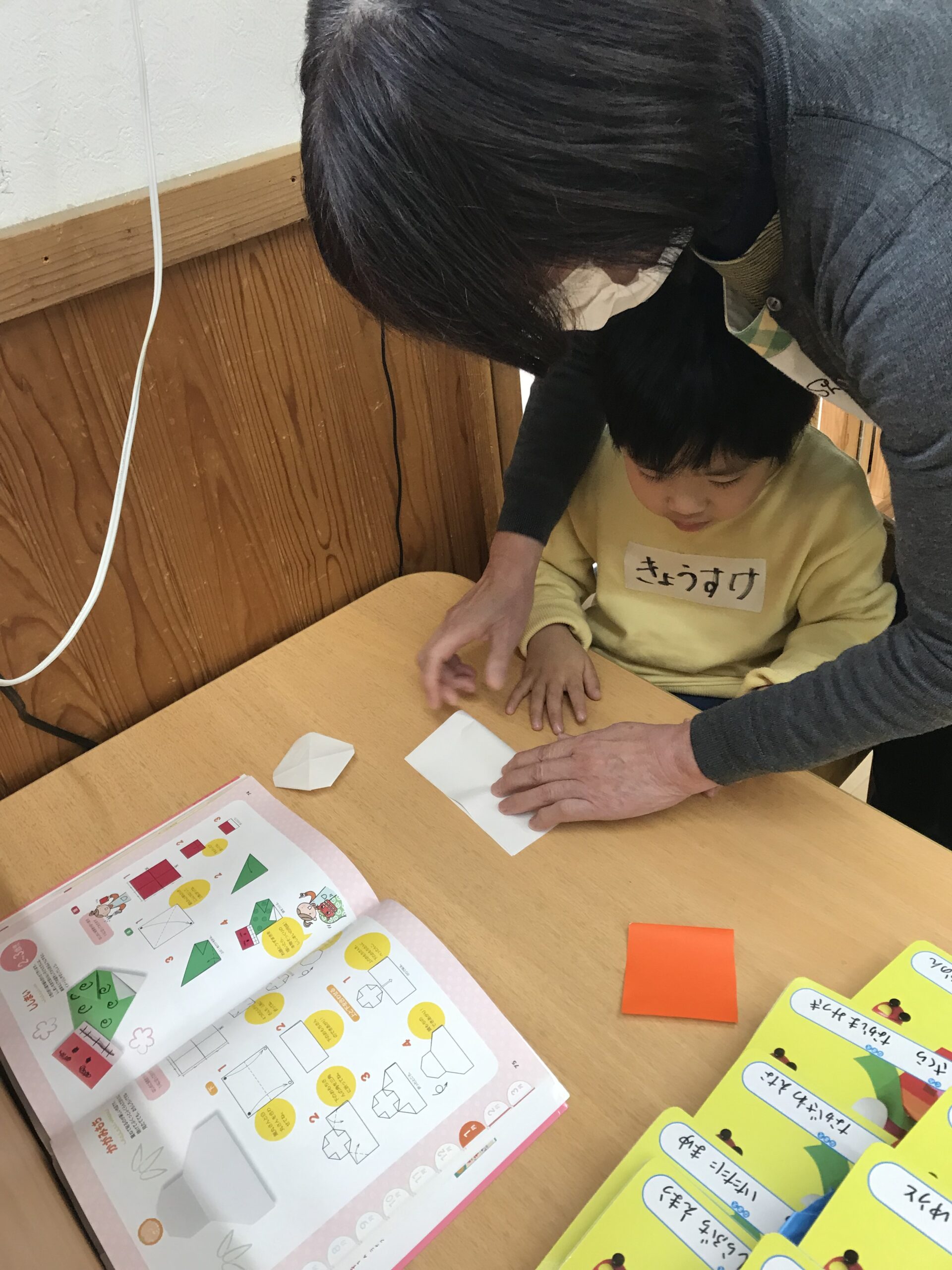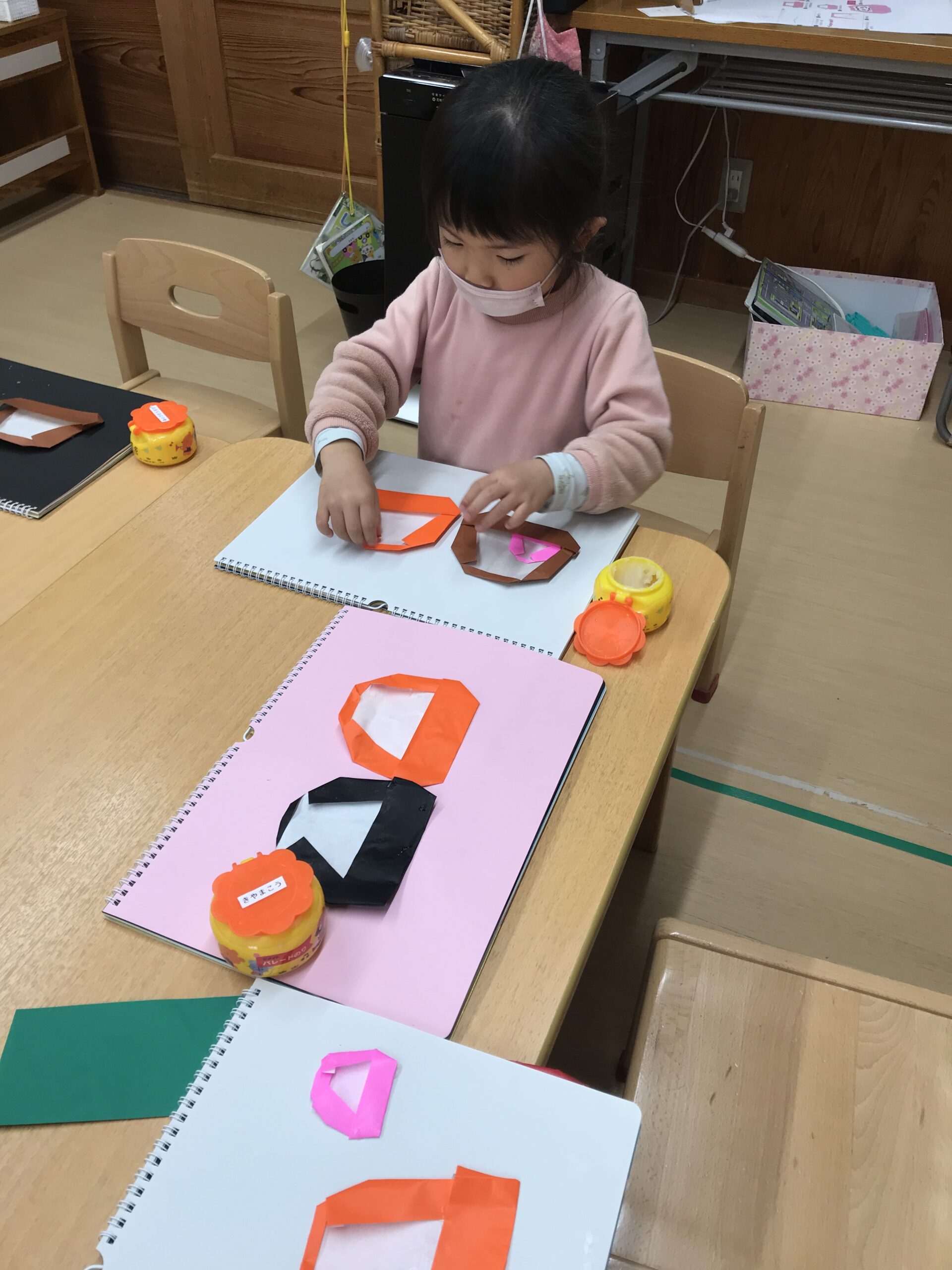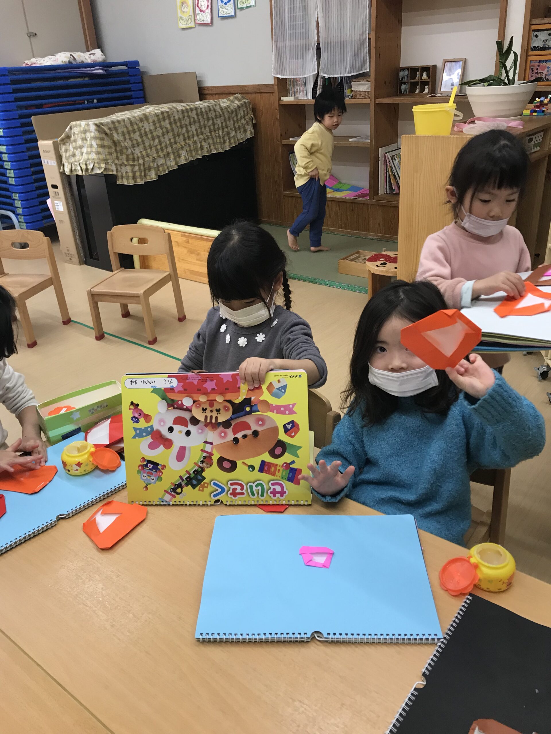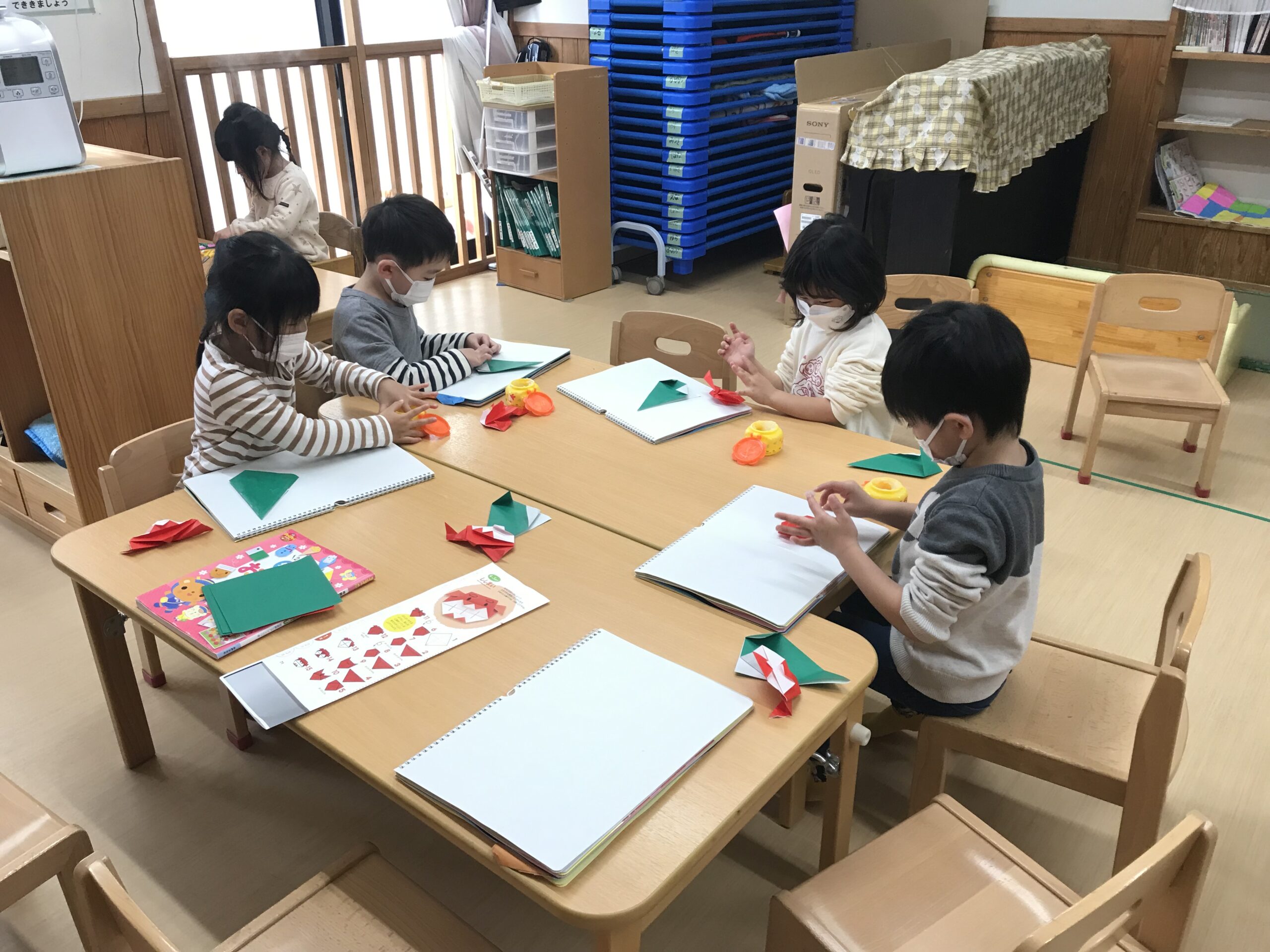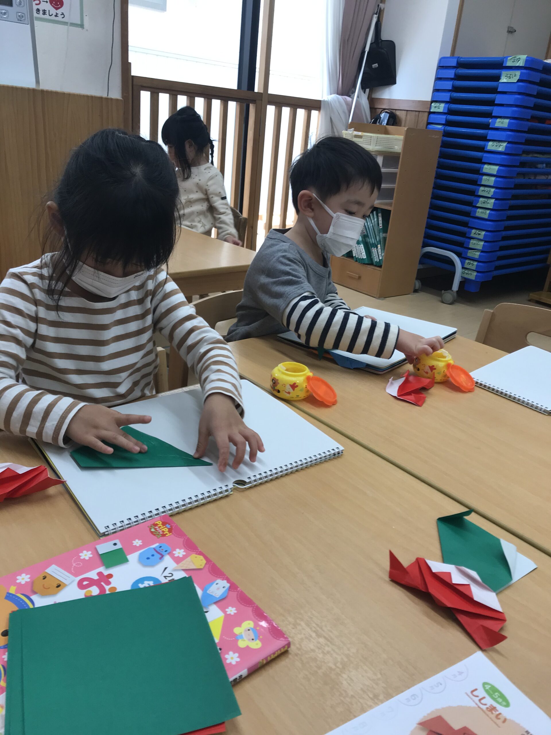 体操教室を終えて、折り紙制作を楽しみました。1月にちなんだ「だるま」や「ししまい」を折りました。縁起だるまやししまいの写真を見ると興味津々でお話を聞いていました。お正月ならではのお話を聞きながら楽しく折り紙を折りました。明日は、今日の続きでだるまやししまいに絵を描いていく予定です!完成が楽しみです♩