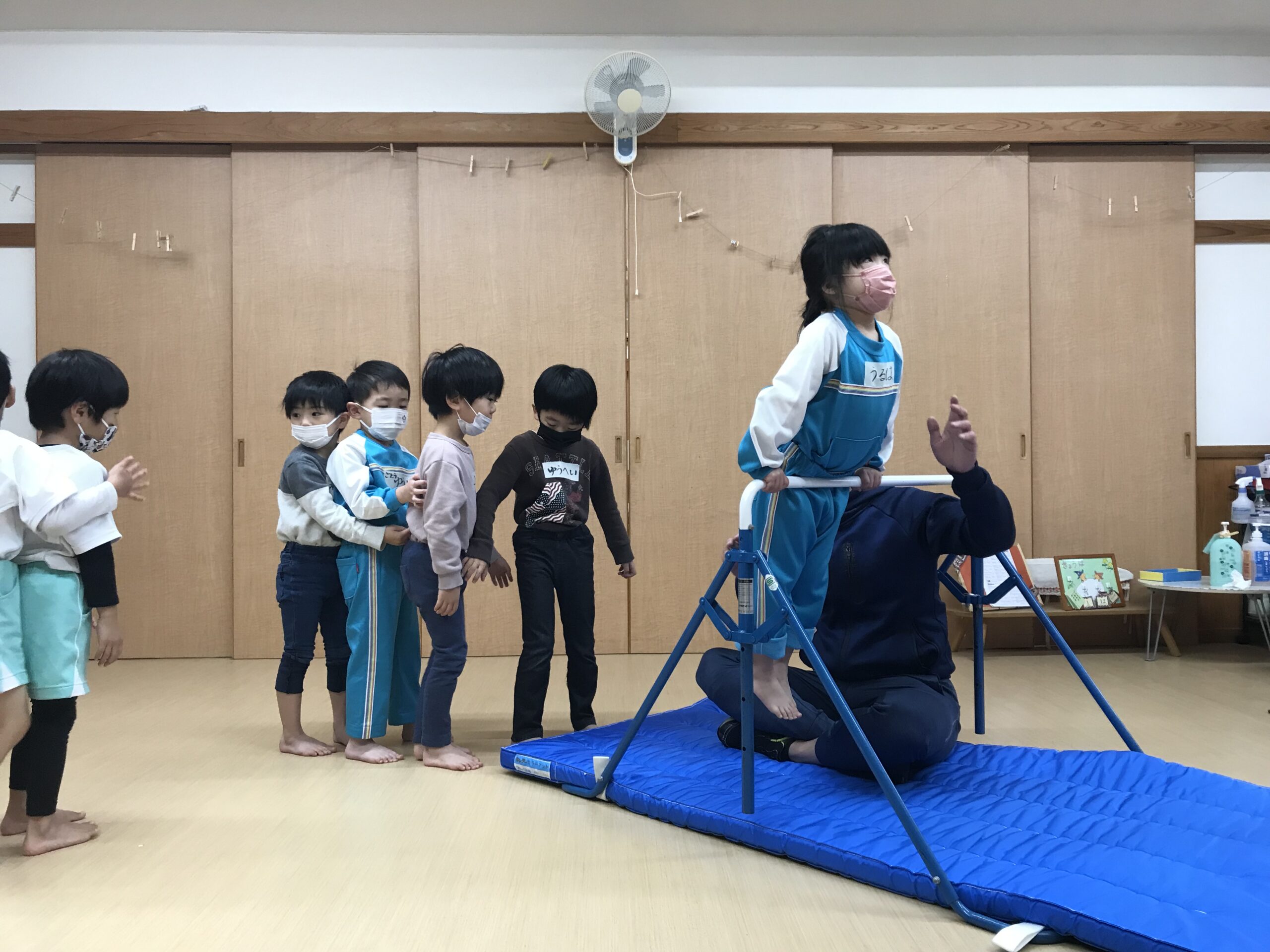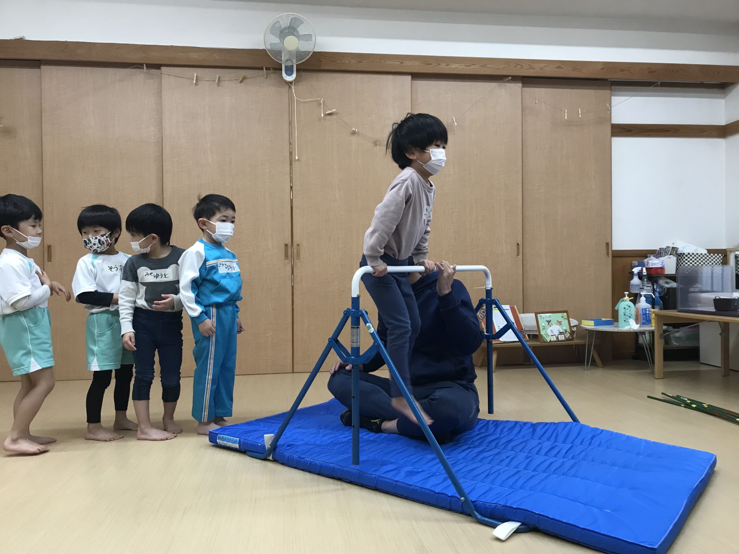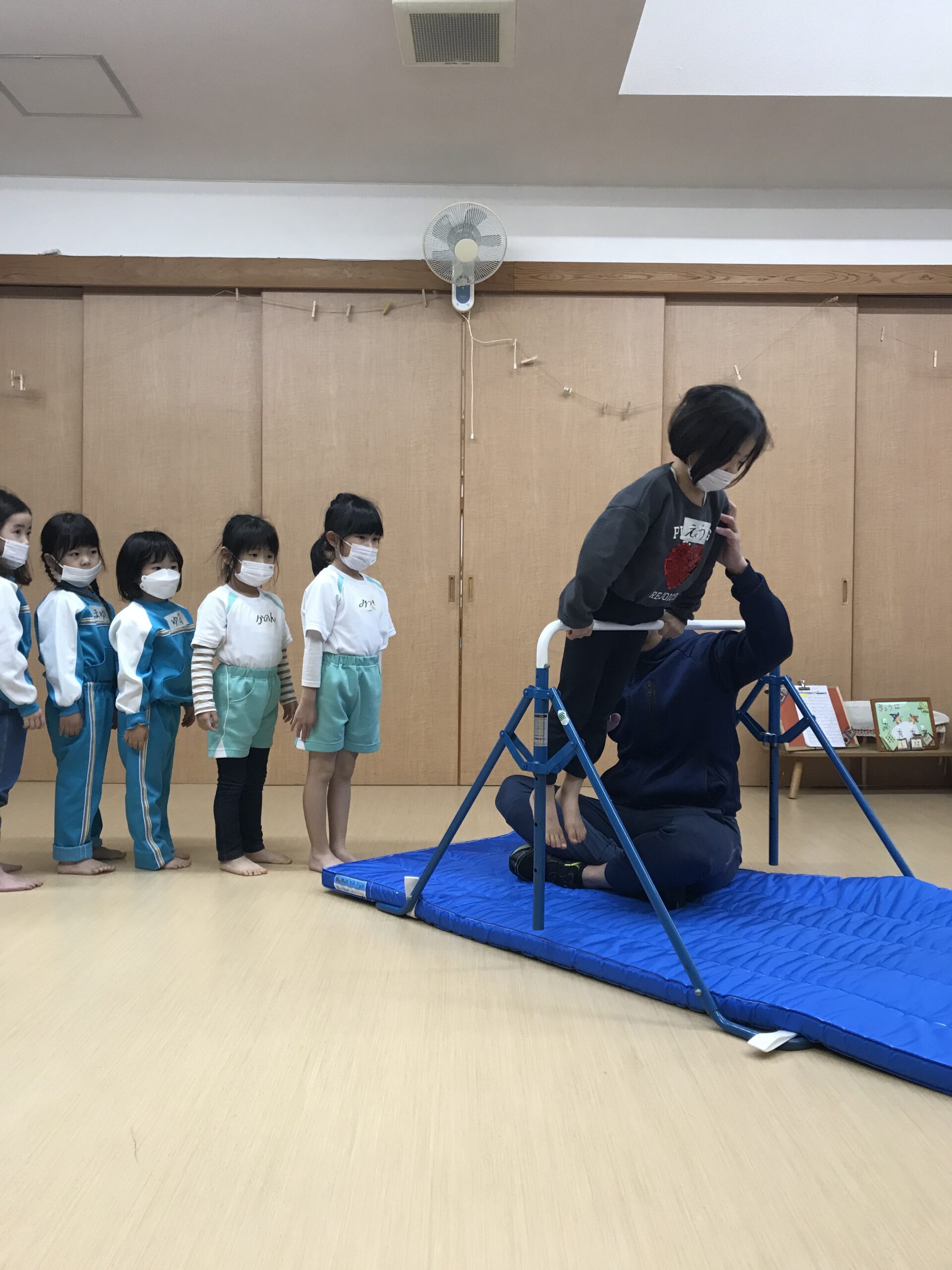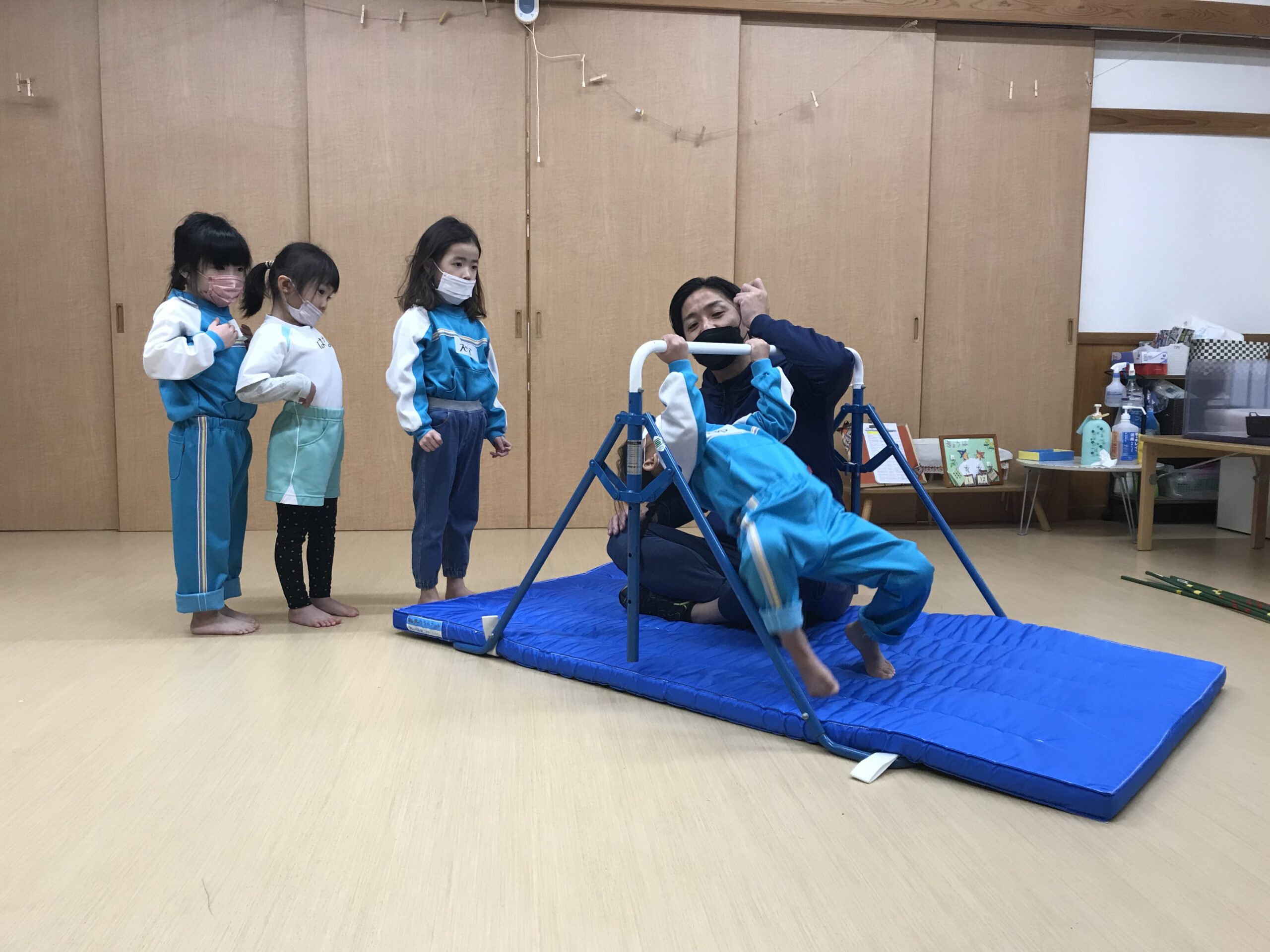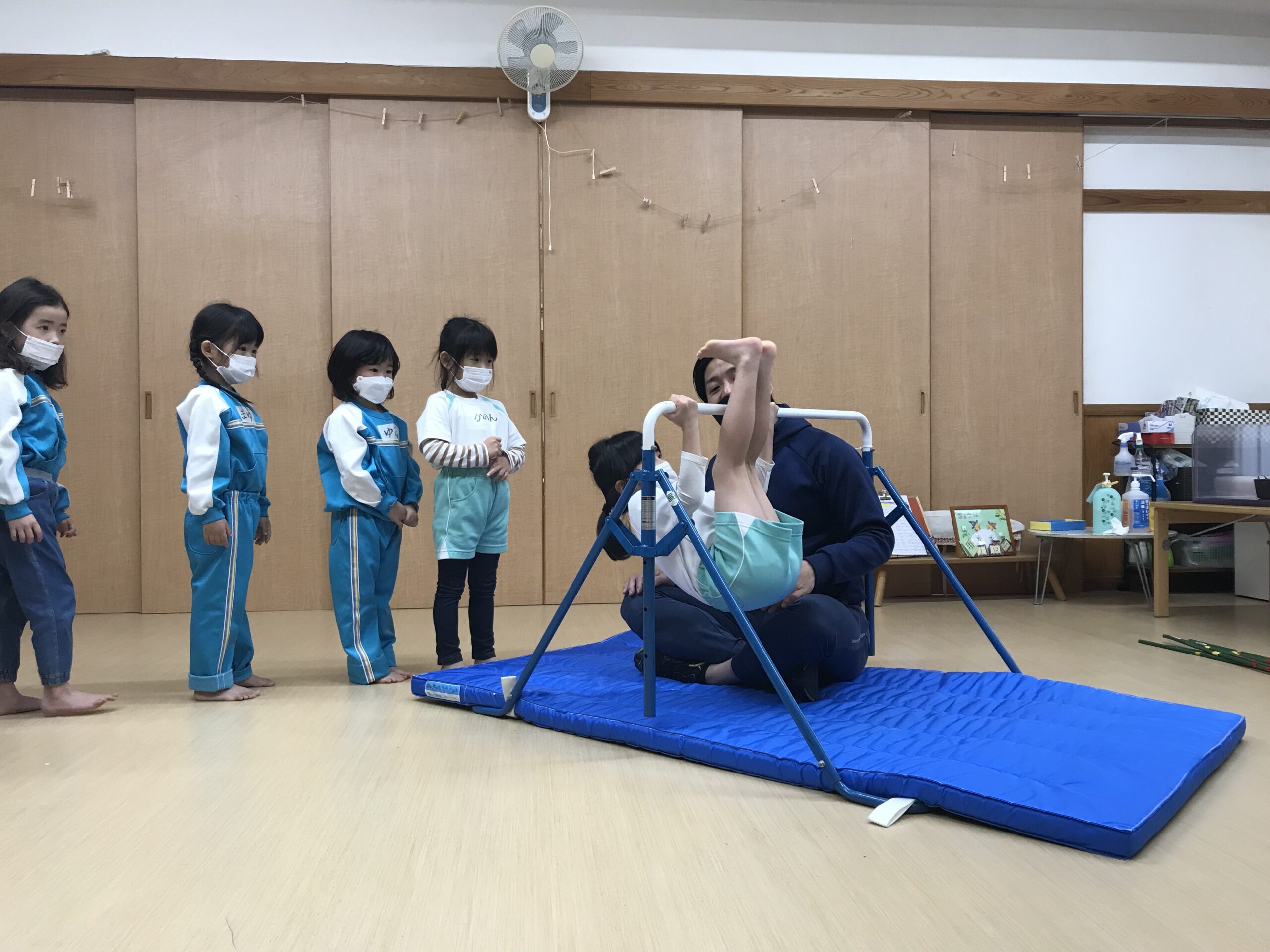 今日は体操教室がありました。最近のさくら組(4歳児)では、前回の体操教室で教えてもらった逆上がりをお家で練習したり、戸外遊びの時には園庭の鉄棒で何度も練習している姿が見られていました。今日は、「鉄棒がしたいな~」と子ども達も朝から張り切っています。今日の体操教室はみんなが願っていた鉄棒でした!前回りから中抜きまわり、逆上がりなどと少しずつ技も難しくなっていきますが、子ども達は「出来るようになりたい!」と意欲的に練習に取り組みます。出来なくて悔しい時には涙を流してしまうこともありますが、保育士等やお友達からの励ましの言葉でまた挑戦しようと頑張る姿もありました。何度も練習した成果が出たお友達、もう少しでできそう!と頑張るお友達、みんな一生懸命練習を頑張るさくら組(4歳児)さんです♩