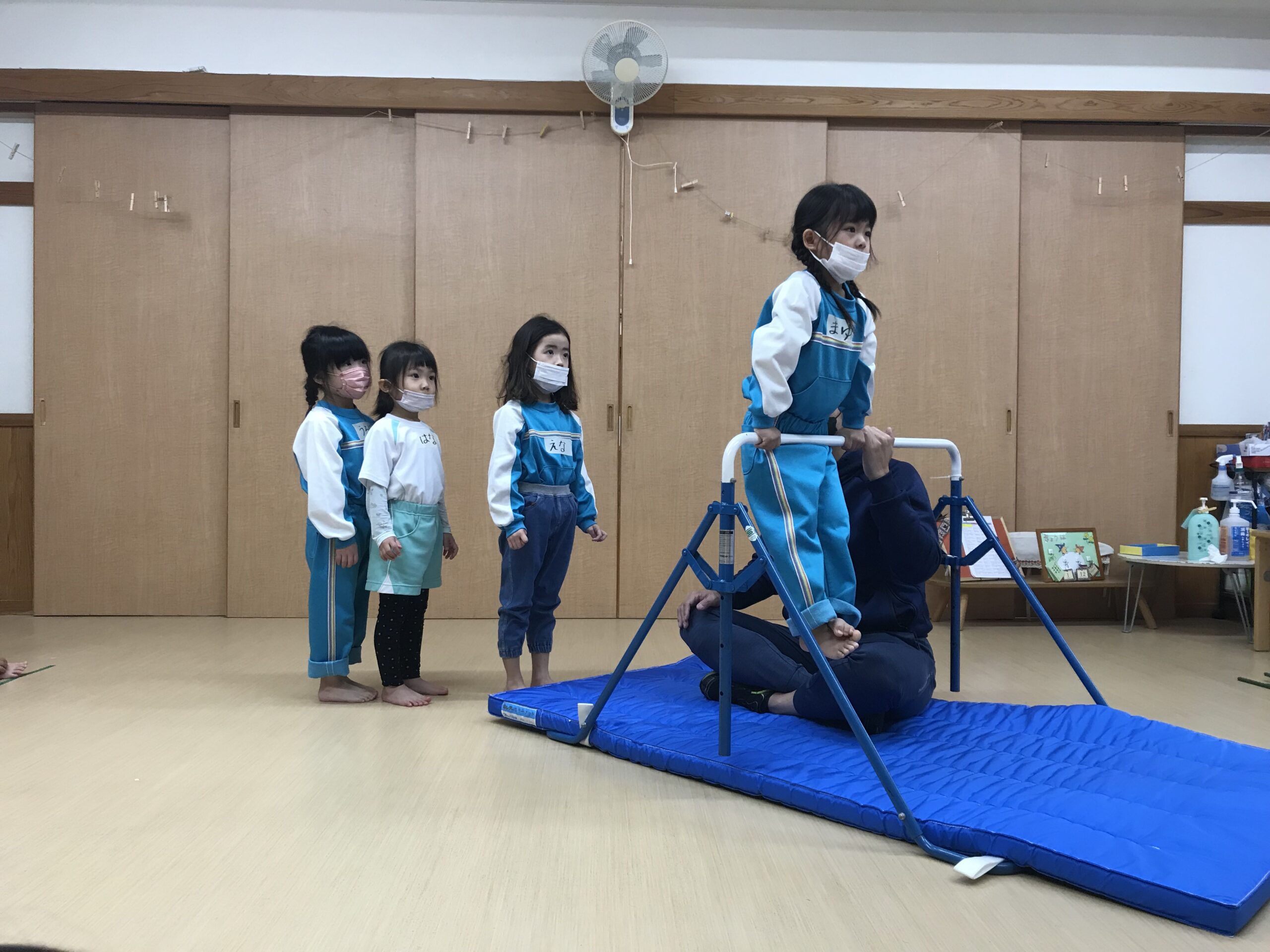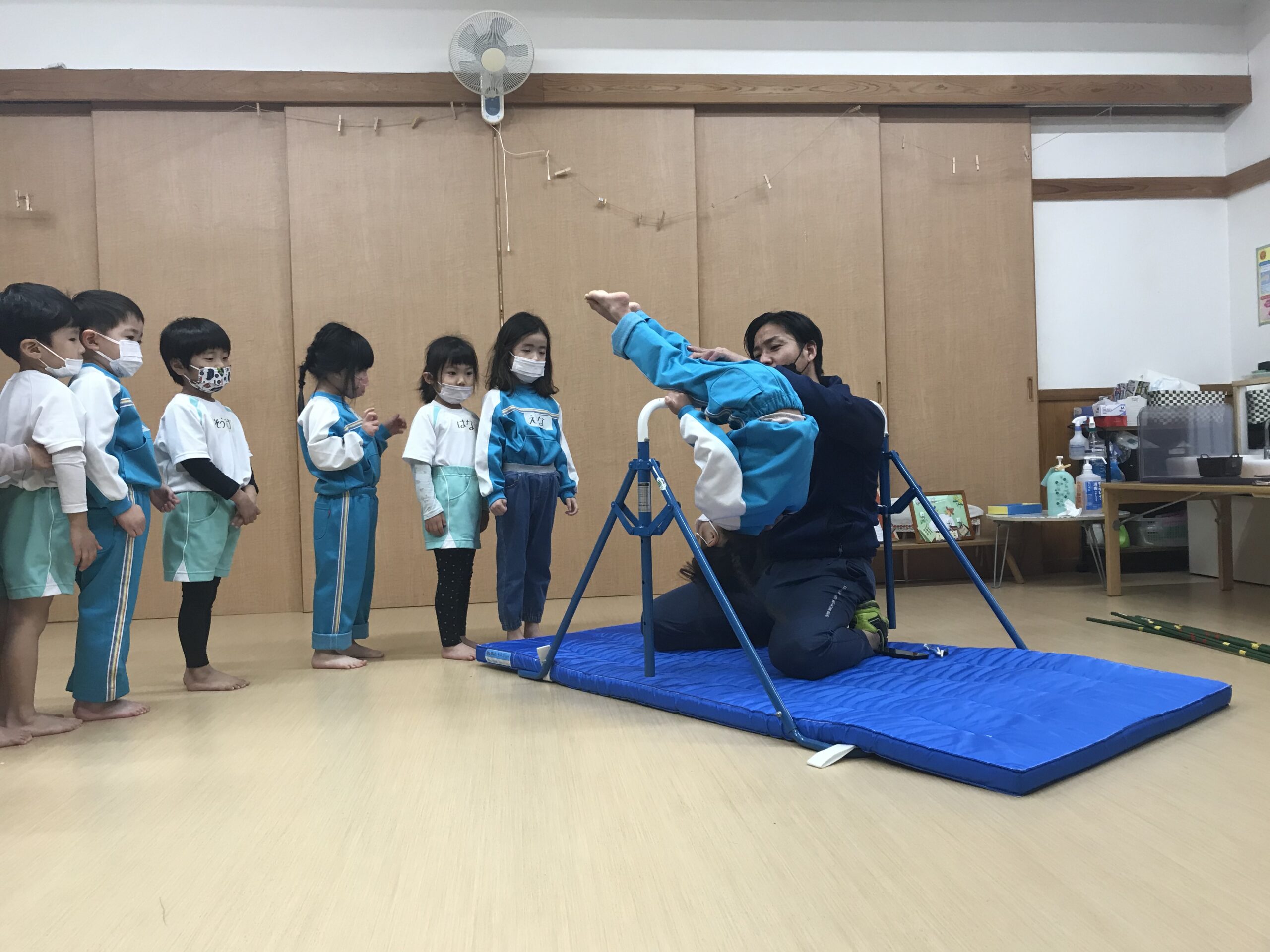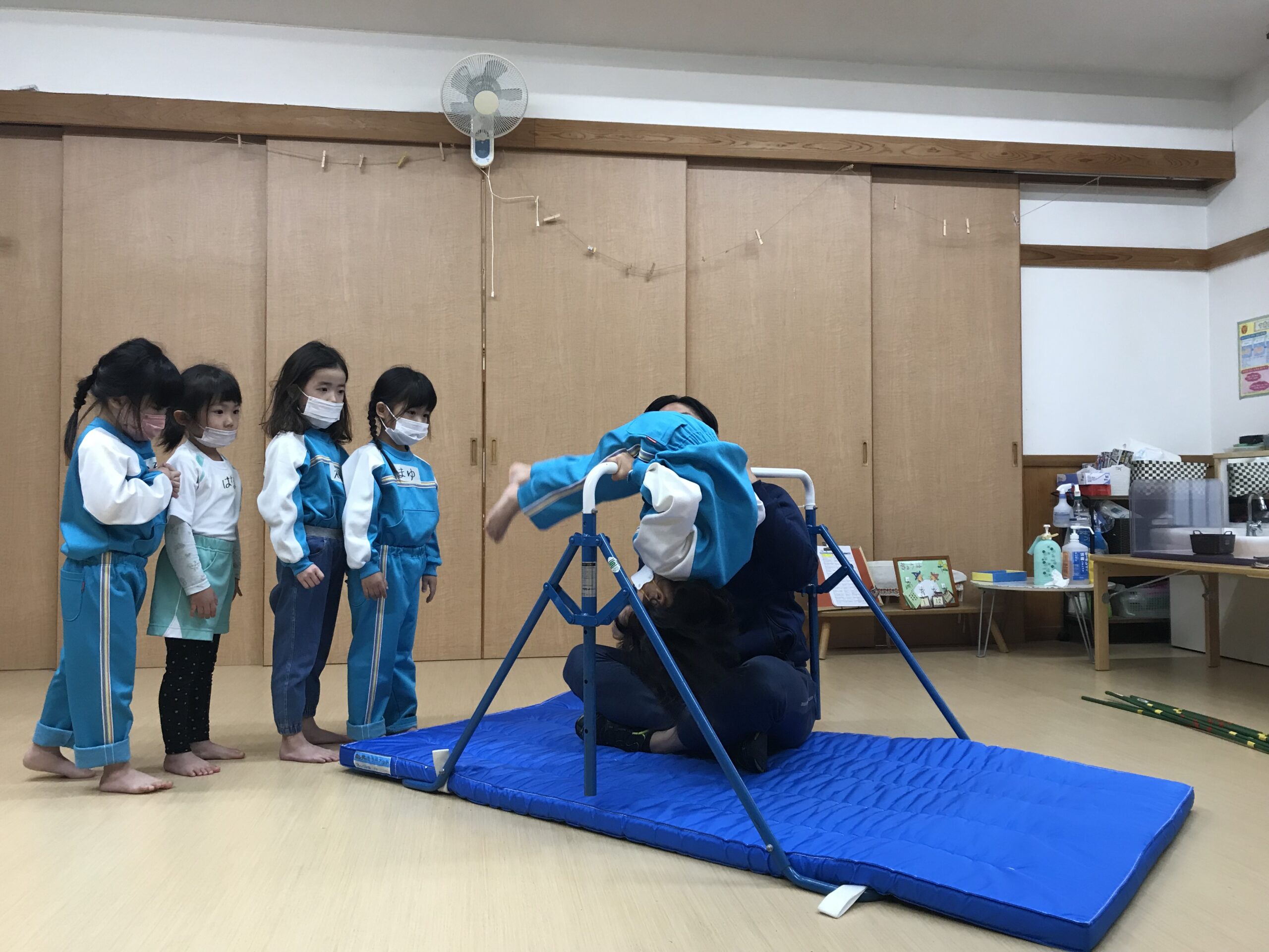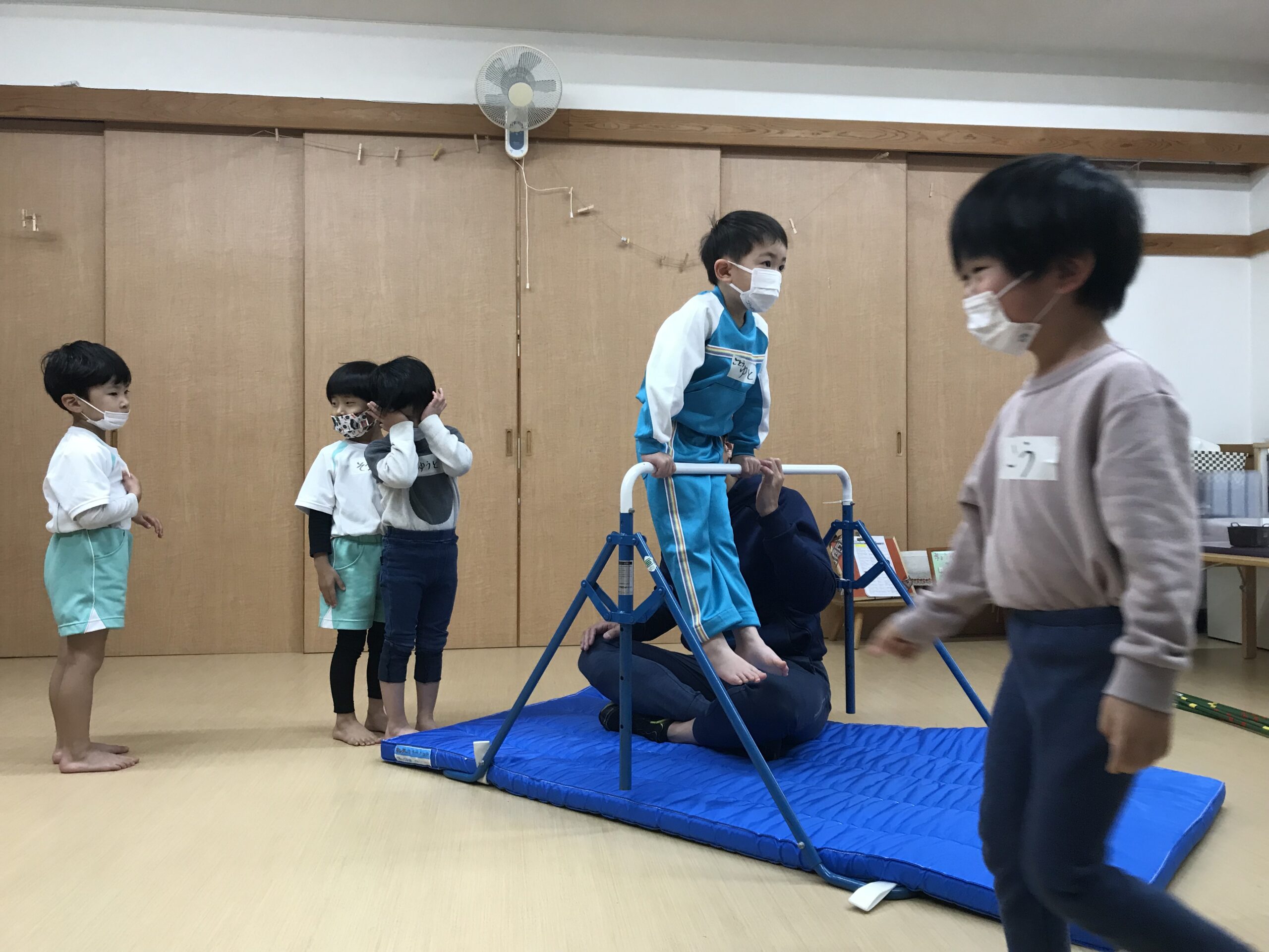 今日は体操教室がありました。最近のさくら組(4歳児)では、前回の体操教室で教えてもらった逆上がりをお家で練習したり、戸外遊びの時には園庭の鉄棒で何度も練習している姿が見られていました。今日は、「鉄棒がしたいな~」と子ども達も朝から張り切っています。今日の体操教室はみんなが願っていた鉄棒でした!前回りから中抜きまわり、逆上がりなどと少しずつ技も難しくなっていきますが、子ども達は「出来るようになりたい!」と意欲的に練習に取り組みます。出来なくて悔しい時には涙を流してしまうこともありますが、保育士等やお友達からの励ましの言葉でまた挑戦しようと頑張る姿もありました。何度も練習した成果が出たお友達、もう少しでできそう!と頑張るお友達、みんな一生懸命練習を頑張るさくら組(4歳児)さんです♩