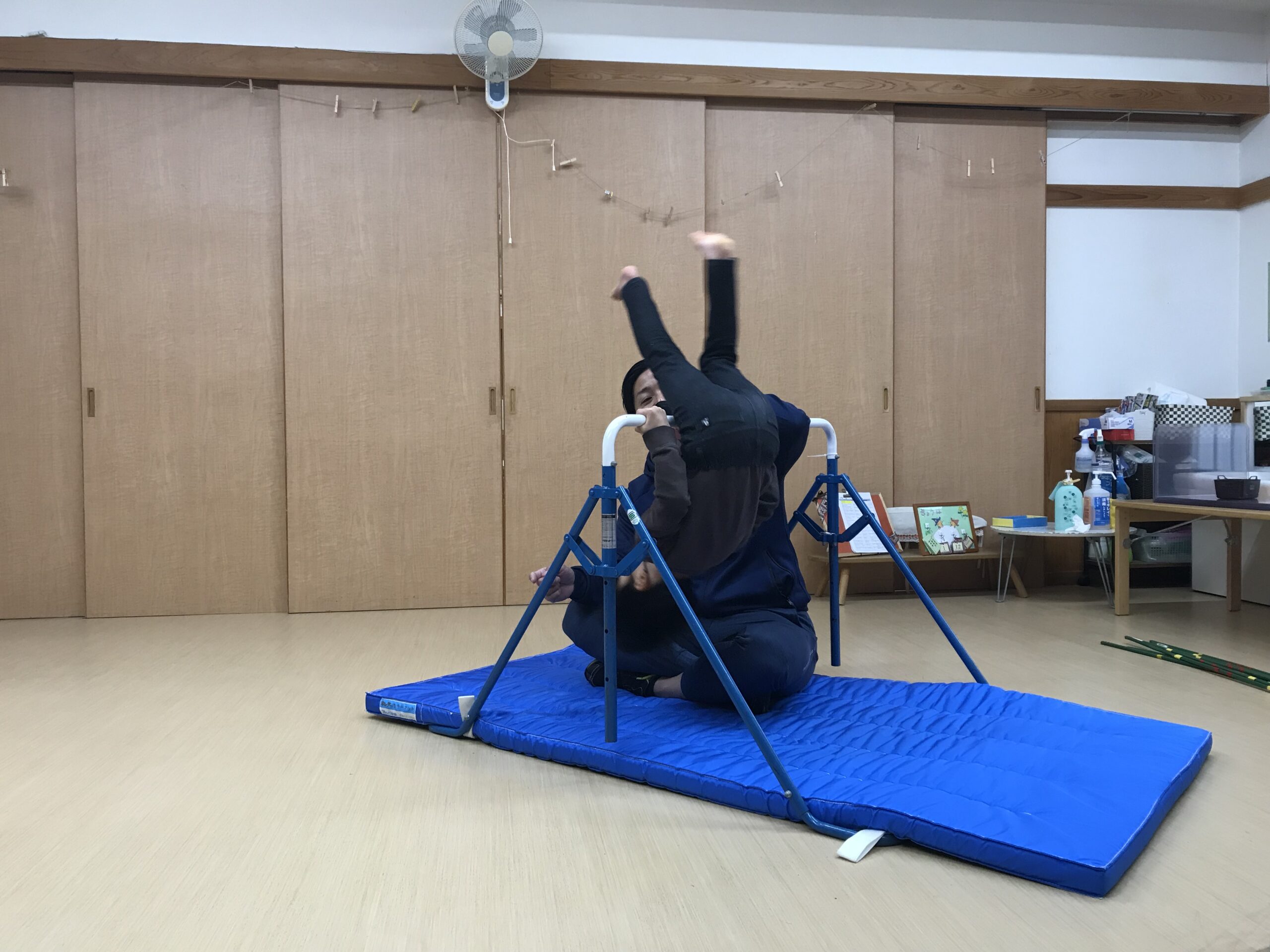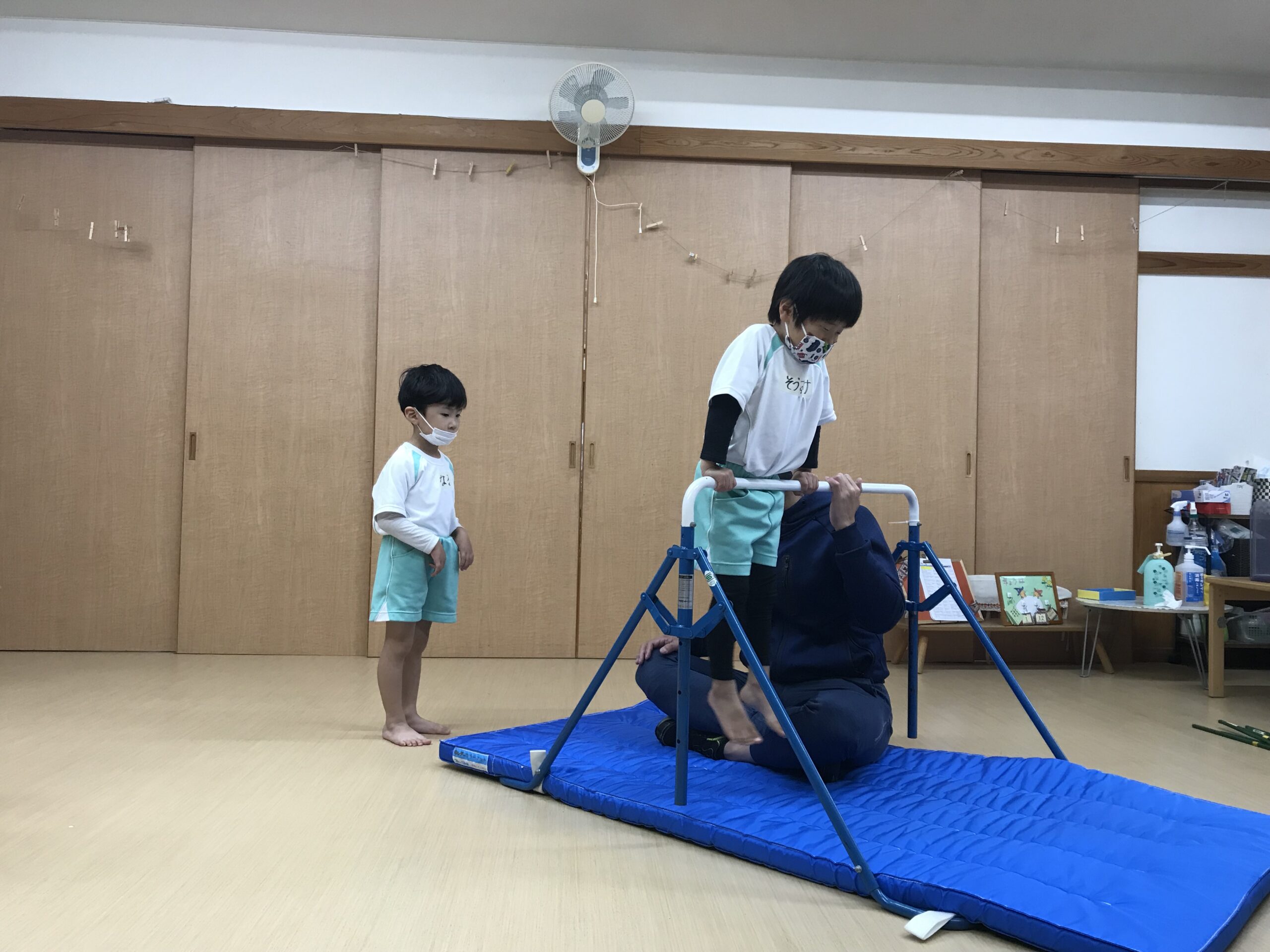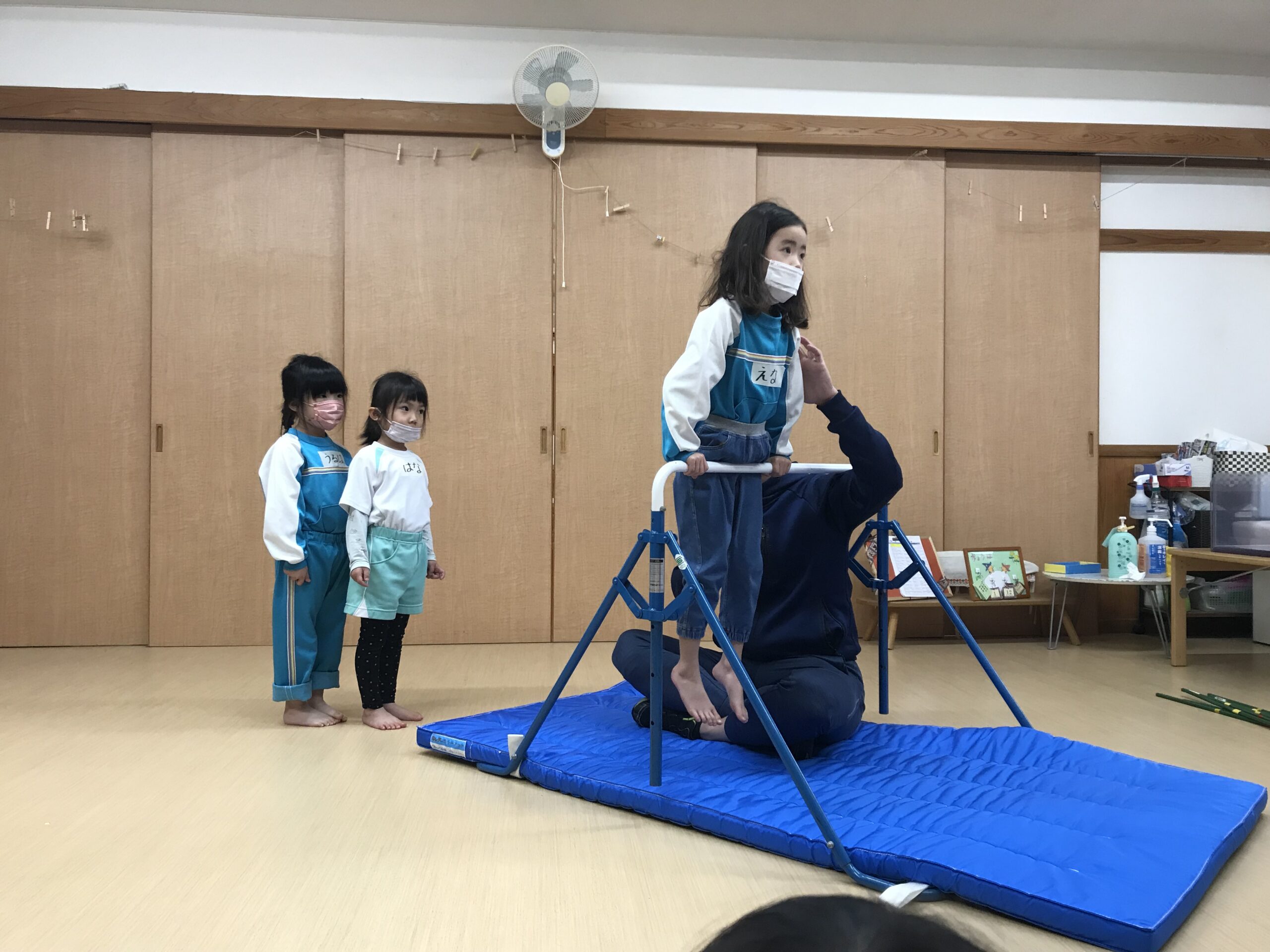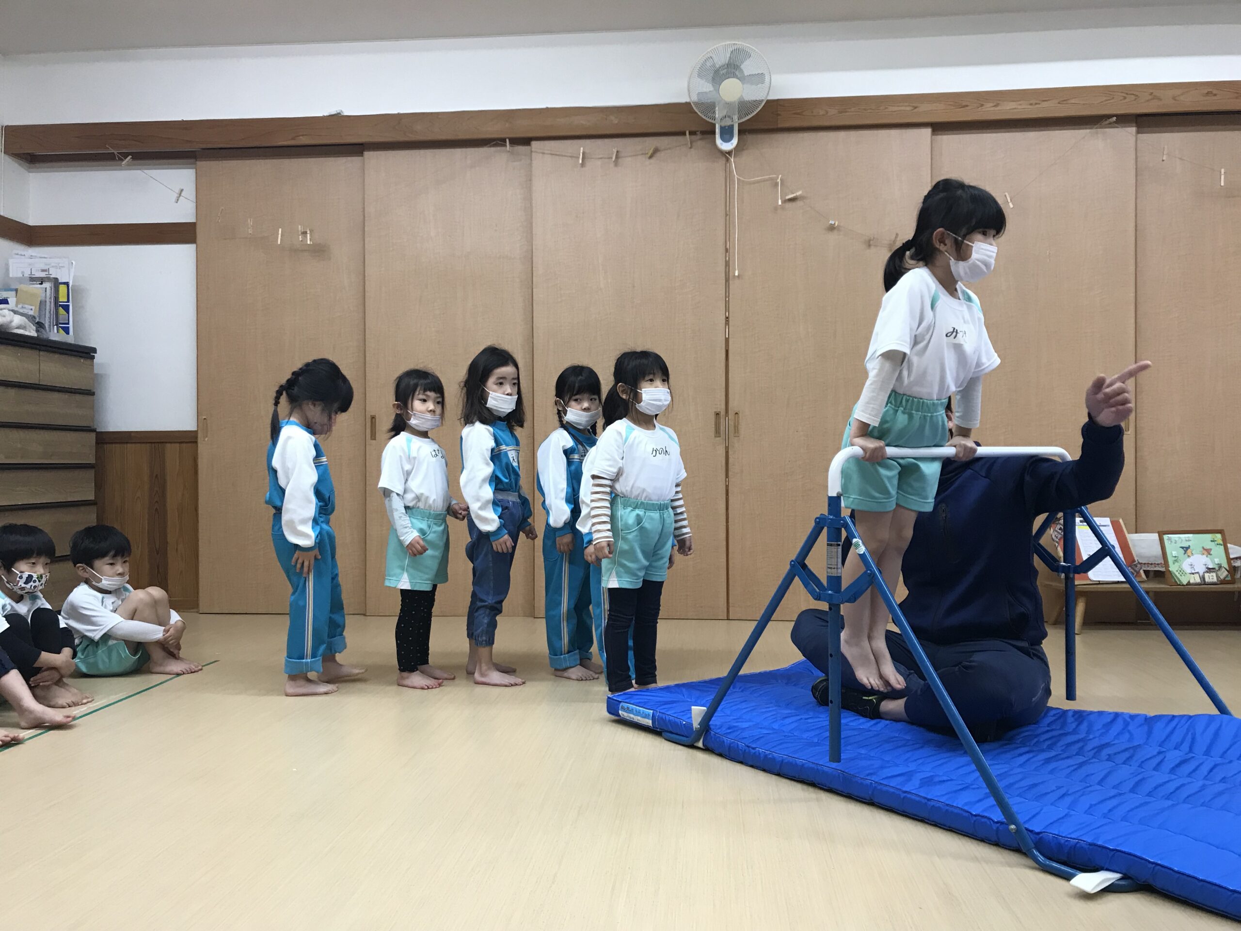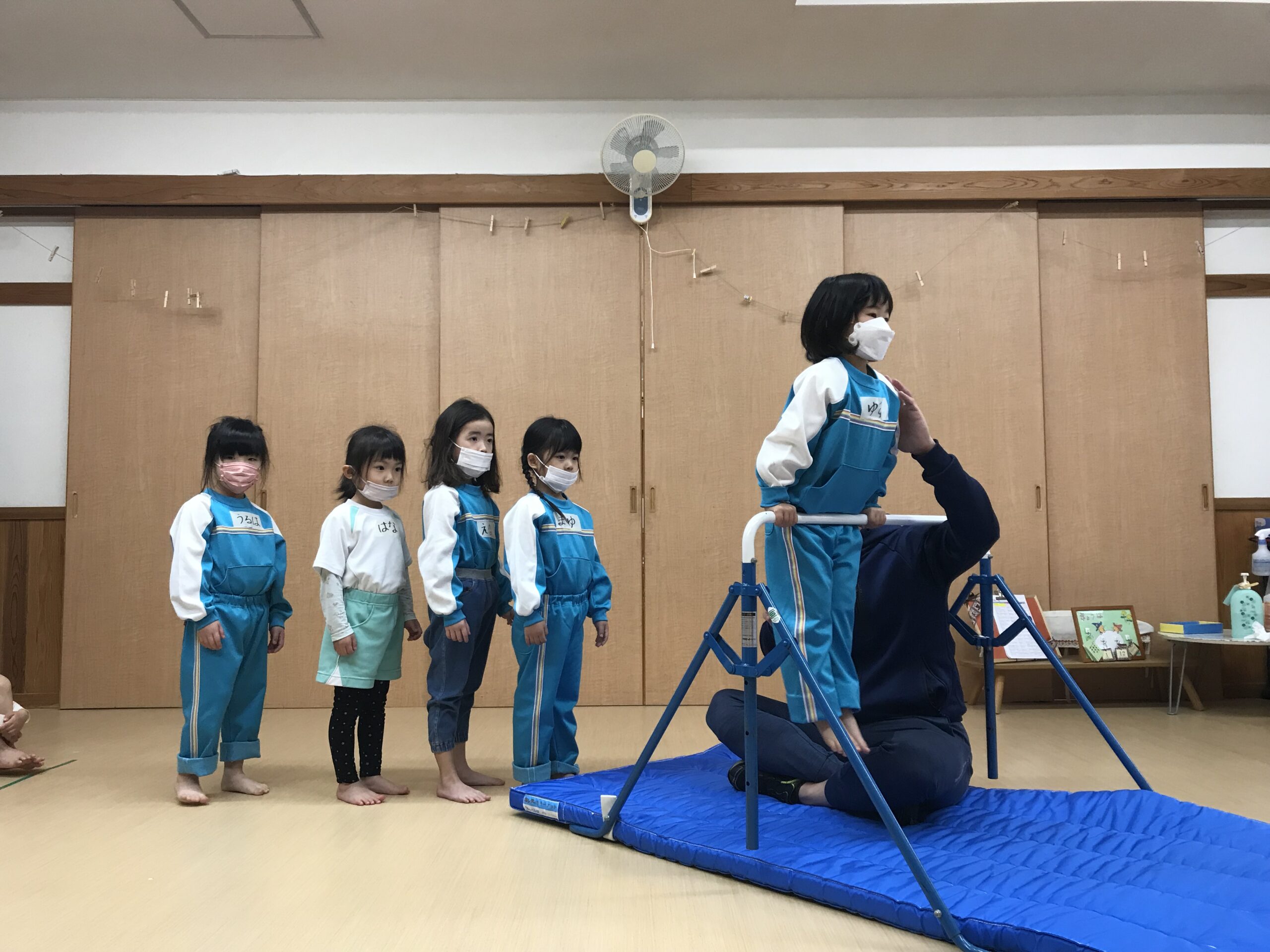 今日は体操教室がありました。最近のさくら組(4歳児)では、前回の体操教室で教えてもらった逆上がりをお家で練習したり、戸外遊びの時には園庭の鉄棒で何度も練習している姿が見られていました。今日は、「鉄棒がしたいな~」と子ども達も朝から張り切っています。今日の体操教室はみんなが願っていた鉄棒でした!前回りから中抜きまわり、逆上がりなどと少しずつ技も難しくなっていきますが、子ども達は「出来るようになりたい!」と意欲的に練習に取り組みます。出来なくて悔しい時には涙を流してしまうこともありますが、保育士等やお友達からの励ましの言葉でまた挑戦しようと頑張る姿もありました。何度も練習した成果が出たお友達、もう少しでできそう!と頑張るお友達、みんな一生懸命練習を頑張るさくら組(4歳児)さんです♩