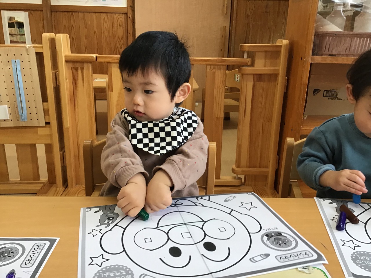 室内で過ごした子どもはぬり絵をしました。自分で好きな色のクレパスを選んで、線を描いたりクレパスを紙にトントンしたりして紙に色がつく様子を楽しみました。
