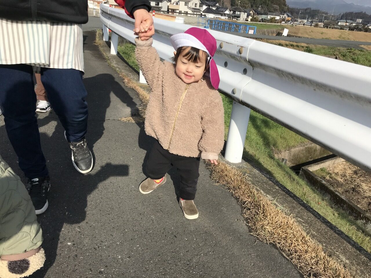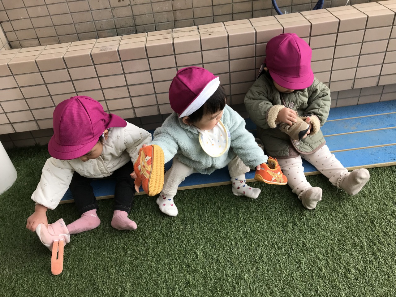 今日は天気が良かったので、ひよこ組(0歳児)は散歩に出掛けました。散歩に出掛ける前には、自分のロッカーから帽子を取りだして被ろうとしたり、靴下を自分で履こうとしたりする姿が見られるようになりました。保育士等も自分でしようとする姿を受け止めて様子を見守り、できないところは援助をするようにしています。準備ができたら散歩に出発です!川にいる鳥を見たり、橋を通っているトラックを見たりと、景色を見ながら散歩を楽しみました。天気の良い日には積極的に戸外に出て、冬の自然を感じたり身体を動かして遊んだりできるようにしていきたいです。