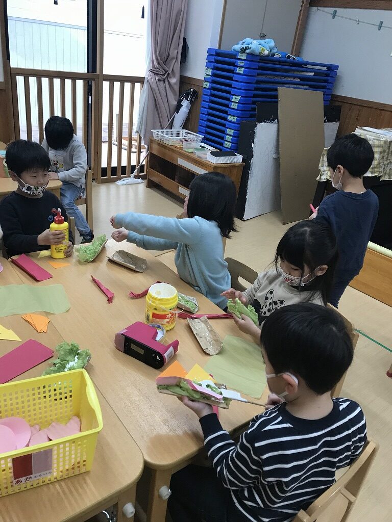 今日はお店屋さんごっこの準備を楽しみました。ポップコーンとホットドックの制作でした。色付けをしたり、パンに具材を挟んだり、お友達と物の貸し借りをしたり、アイディアを出し合ったりしながら自由に制作を楽しんでいました。「美味しそ~う!」「先生見て!本物みたい!」と上手くできて満足そうに保育士等に見せてくれました。