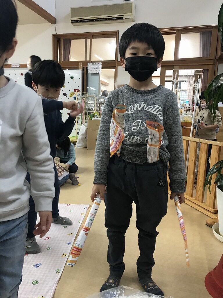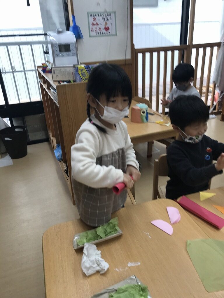 節分に向けて鬼のお面も「まだしたい!」と画用紙を切り貼りし、さらに素敵なお面に大変身しています♩節分の鬼退治が楽しみです!