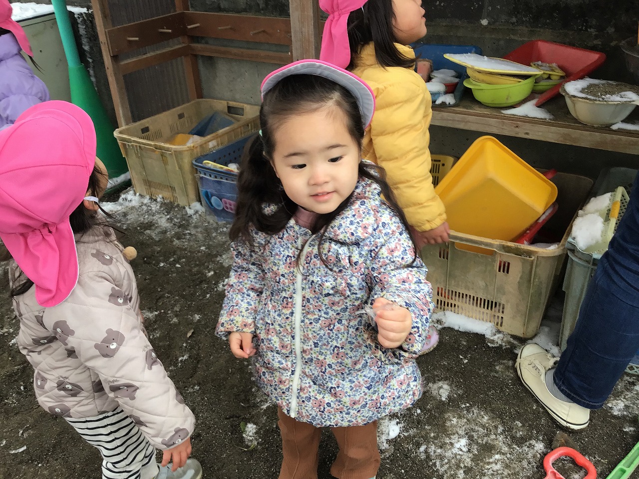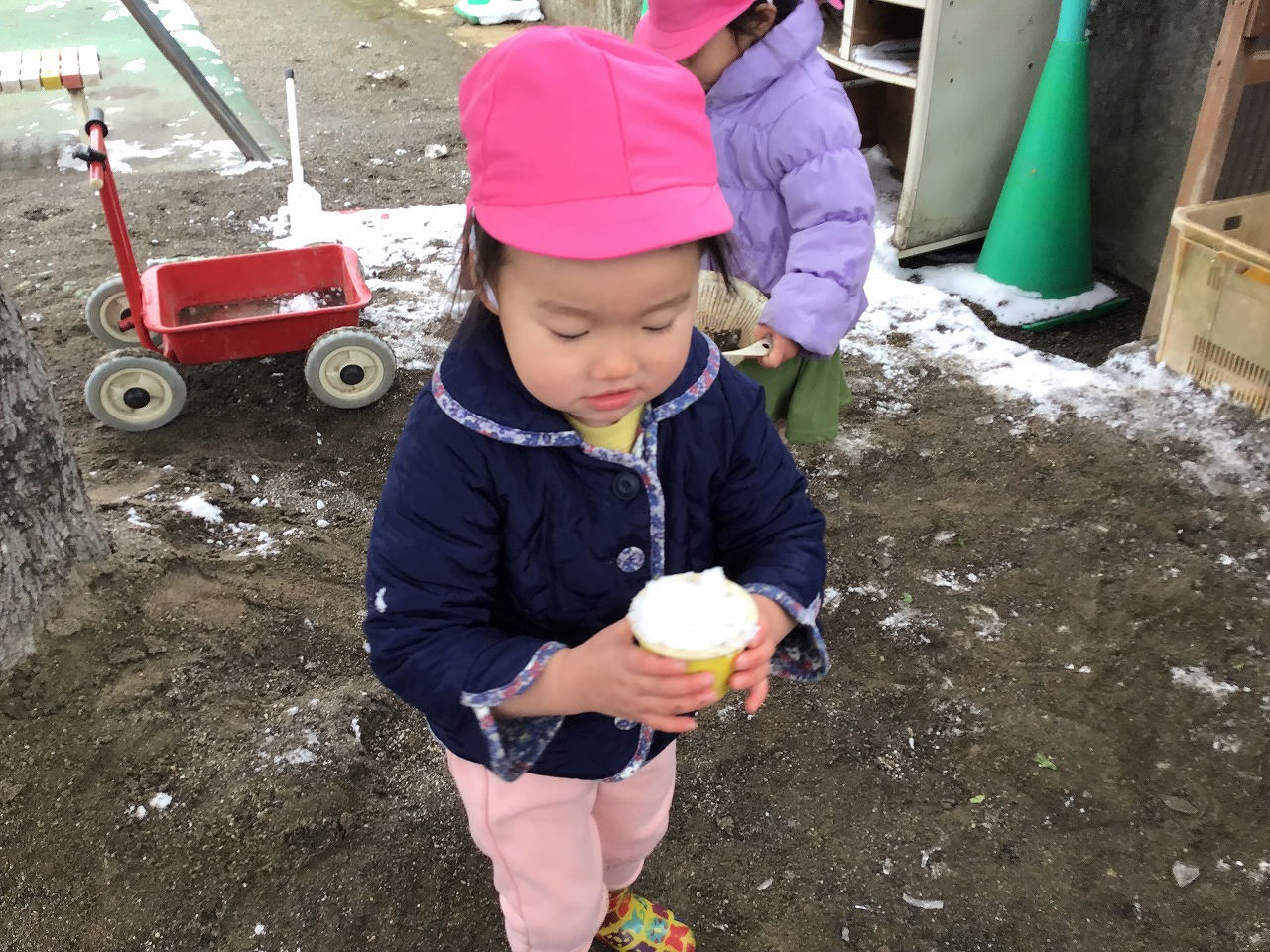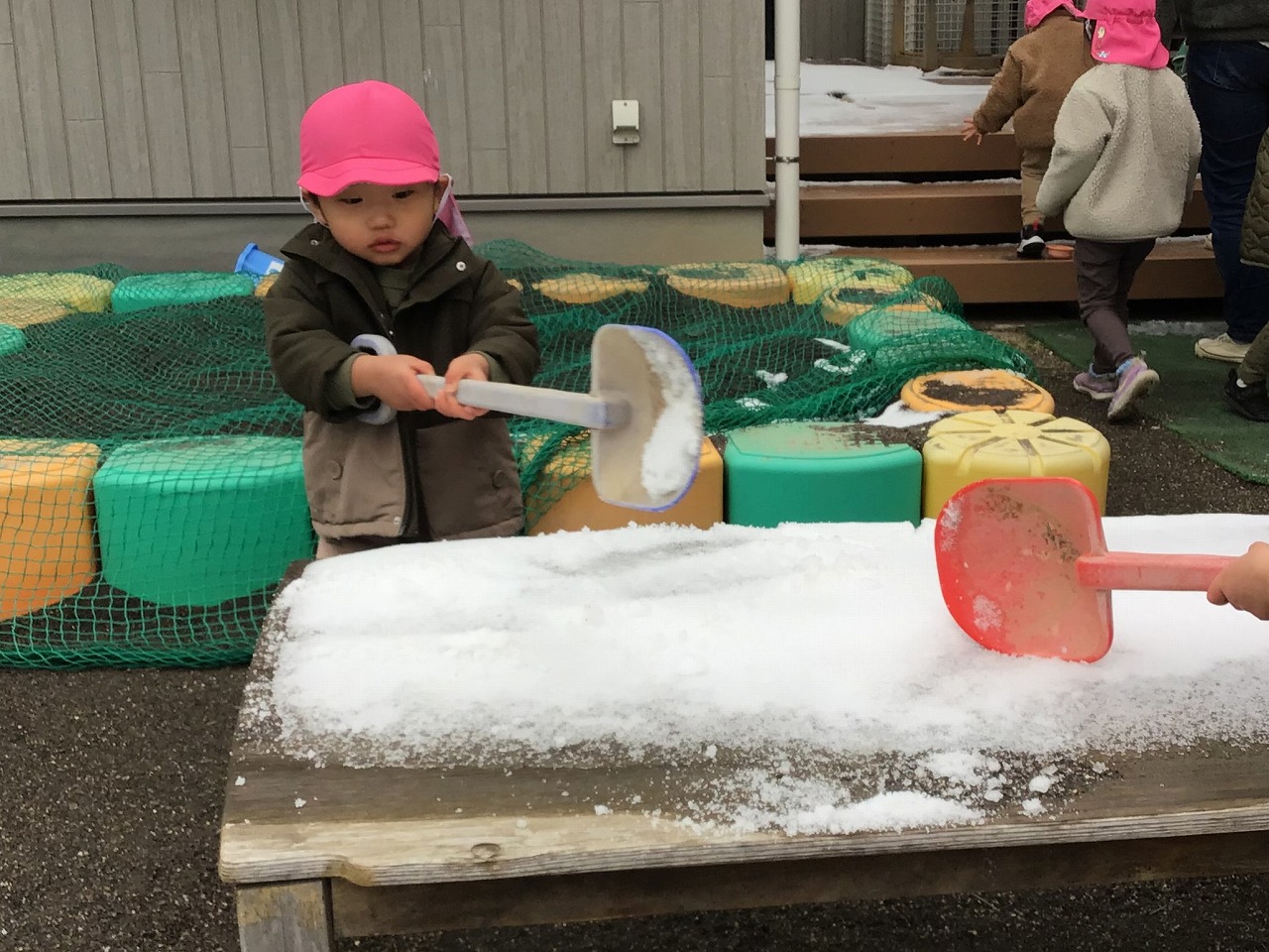 雪を踏んで音を楽しんだりスコップを持ってきて雪かきをしたり…集めた雪をカップに入れて「かき氷ができたよ」と教えてくれる子どももいました。みんな寒さに負けず元気いっぱいでした。