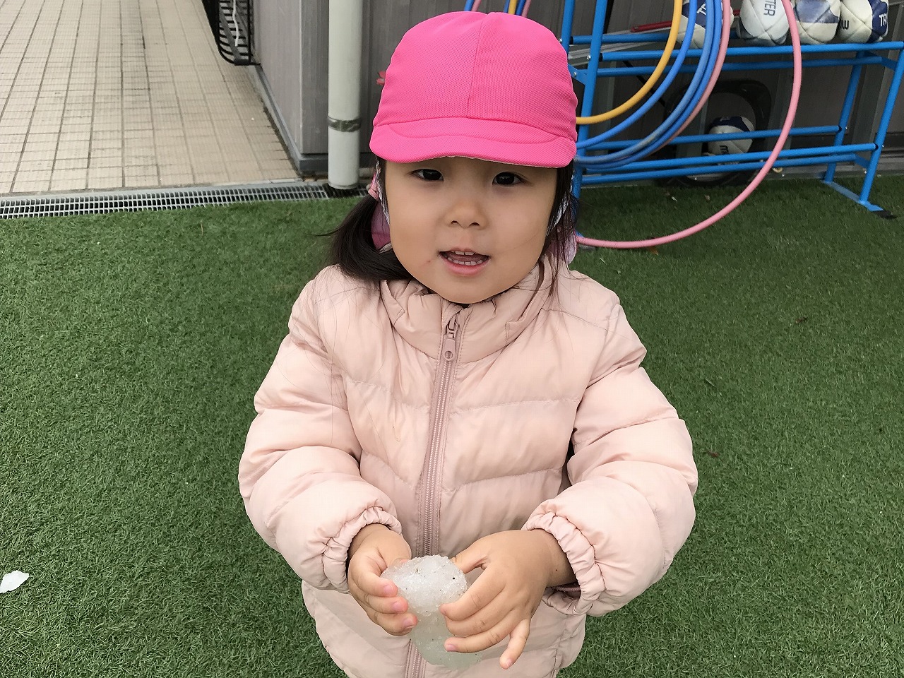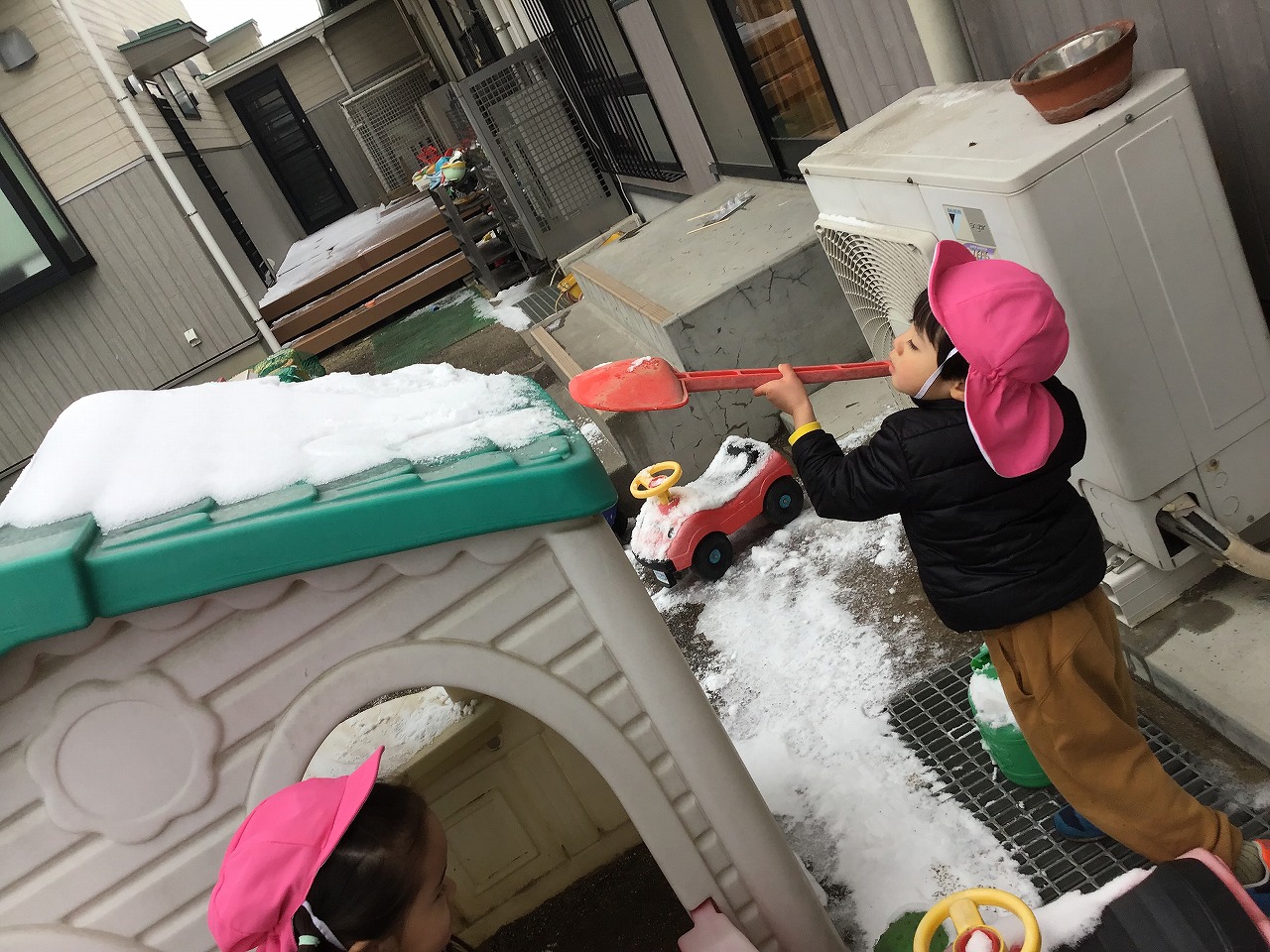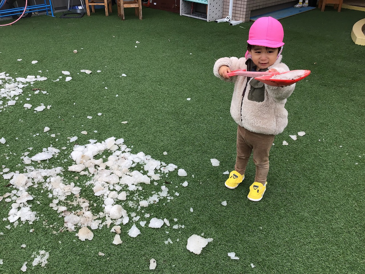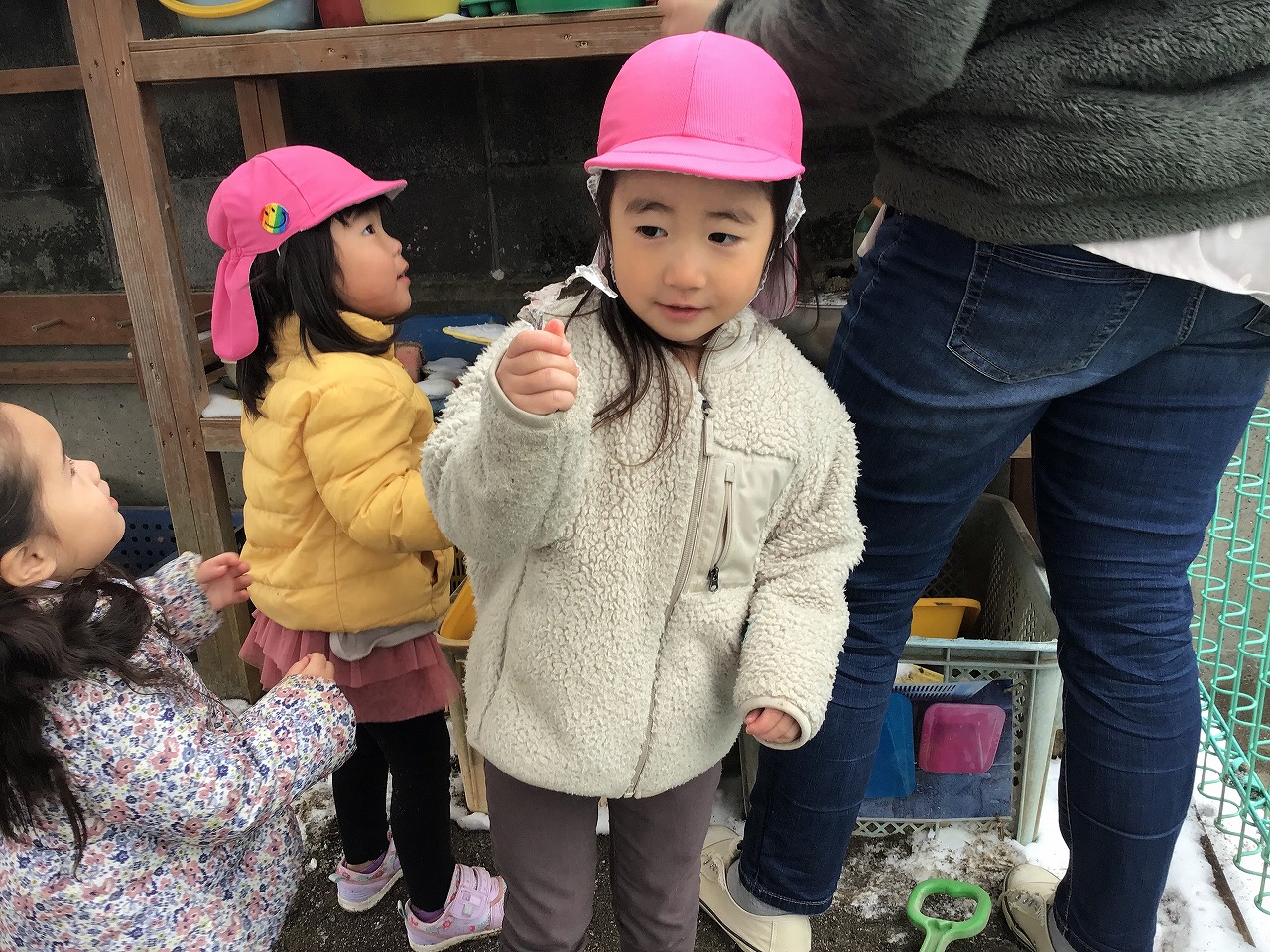 雪を踏んで音を楽しんだりスコップを持ってきて雪かきをしたり…集めた雪をカップに入れて「かき氷ができたよ」と教えてくれる子どももいました。みんな寒さに負けず元気いっぱいでした。