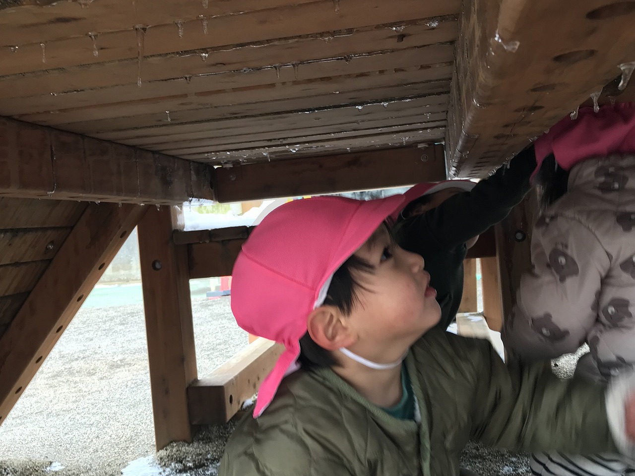 しばらく雪で遊んでいると、今度は遊具の下や屋根に氷柱が出来ていることを発見!!