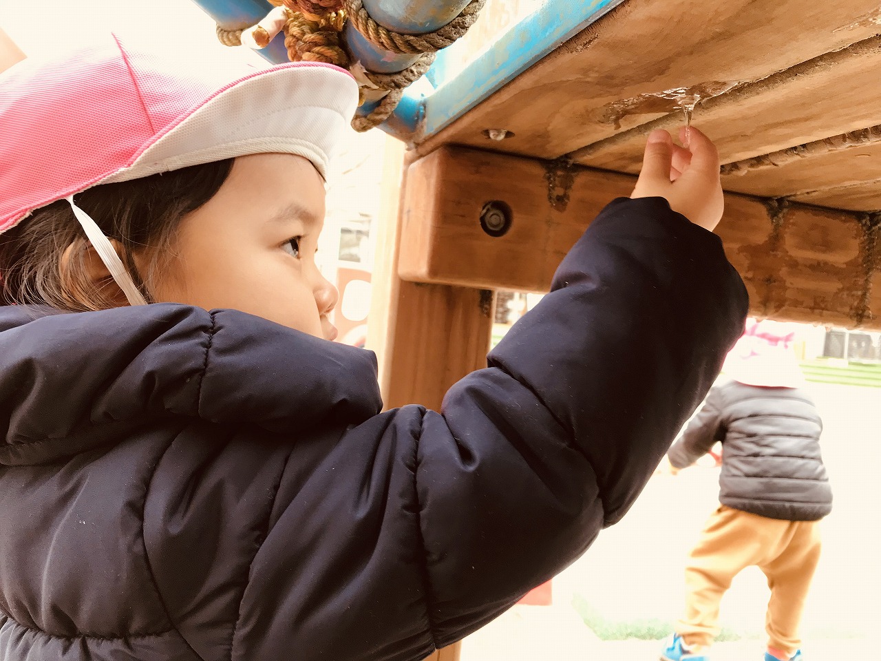 氷柱を触っていると、どんどん溶けていき最後には水になってしまいます。子どもたちも「水になったね!」と新しい発見をしたようです。