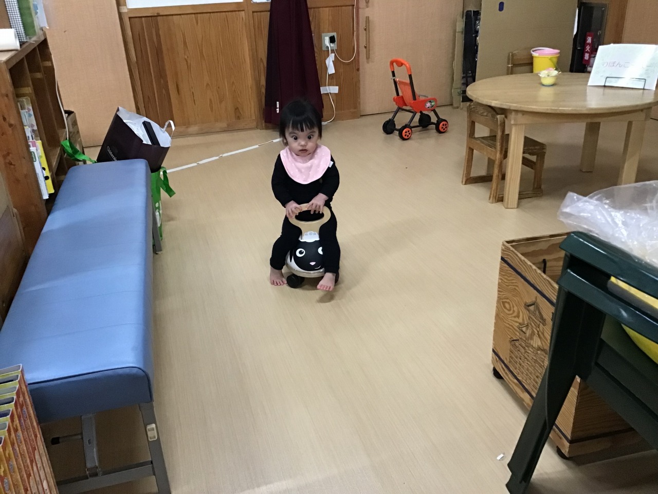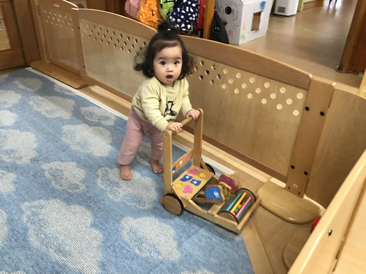 お部屋では過ごした子ども達はホールで遊びました。手押し車は人気で押しながら自分の好きな場所へ行くことが楽しい様子です。
