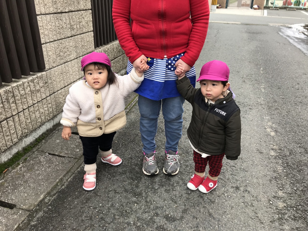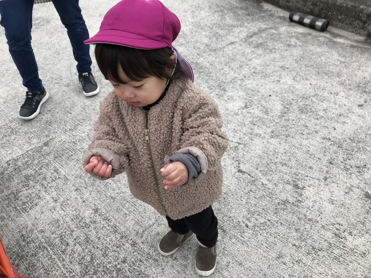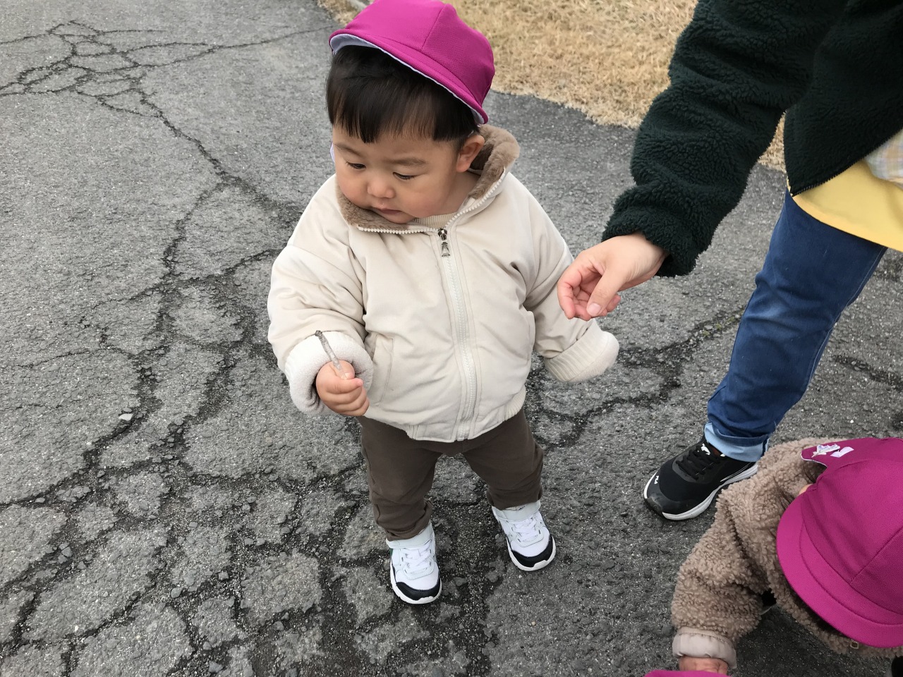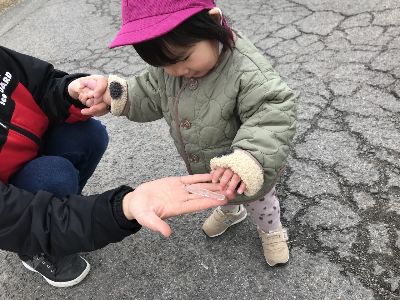 ひよこ組(0歳児)は積もった雪がまだ解けずに残っている散歩道をゆっくり歩きながら冬を感じました。いつもとは違う風景に「冷たいね、雪だよ」と子ども達に声をかけたり雪や氷を手に取り見せました。すると子ども達の反応は様々で、最初は確かめるようにちょんっと指先で触れて大丈夫と思ったら触ってみたり、氷を握りしめて持ち歩く子どももいました。こうやって身近な自然に触れ、様々なことを感じて感性が豊かに育っていく経験を重ねていきたいです。
