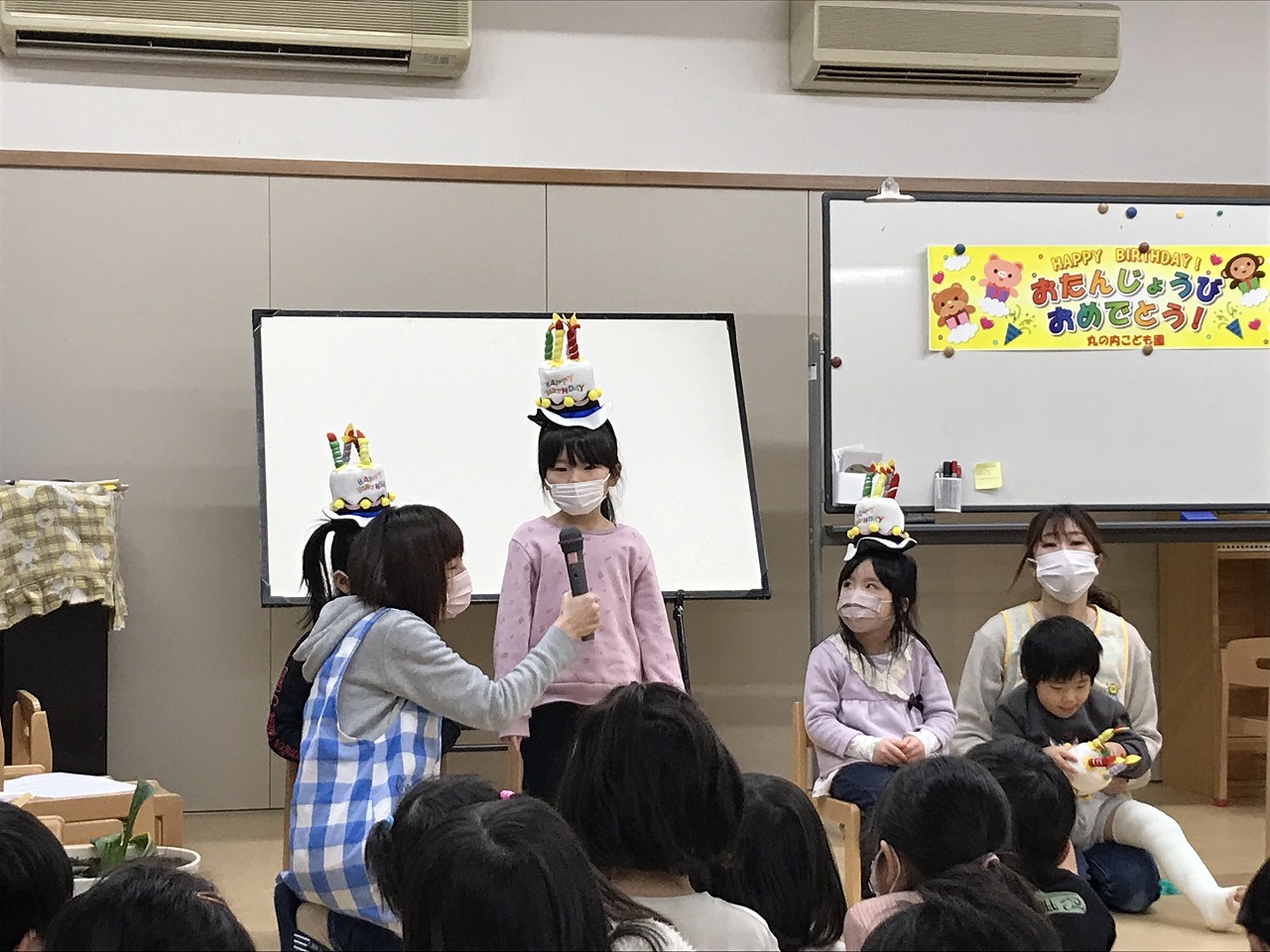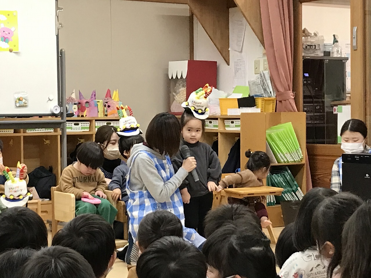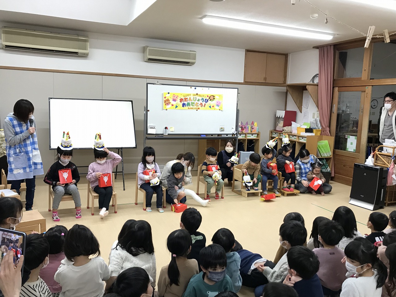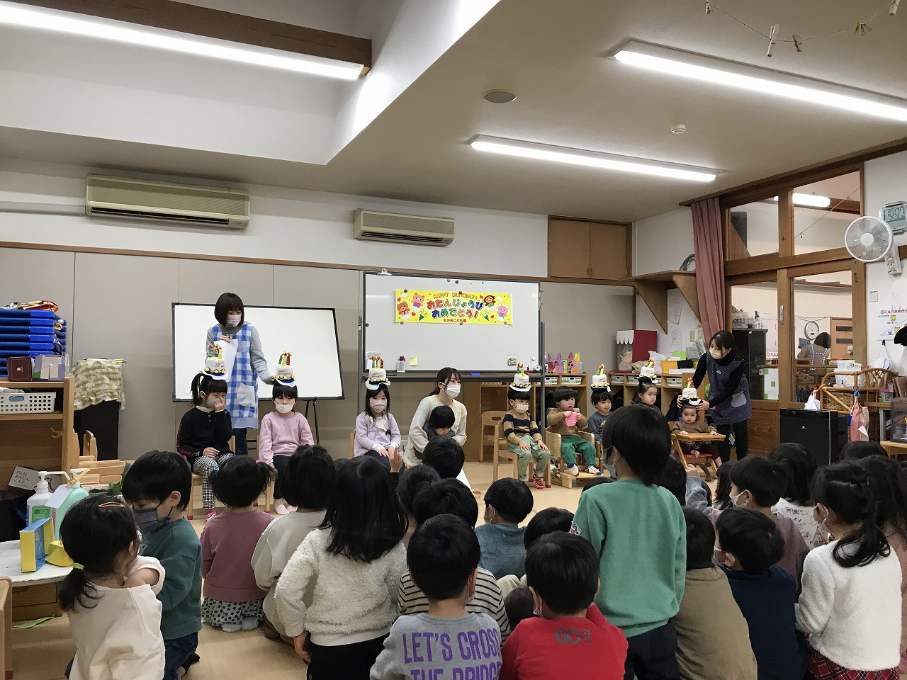 1月生まれのお誕生日会がありました。インタビューでは少しドキドキしながらも、各クラスによって質問が違い、『おおきくなったら』や『好きな食べ物』など、それぞれがとてもかっこよく答えていました!友だちも大きな拍手でお祝いの気持ちを伝えていました。自分のお誕生日は特別な日、とってもうれしそうな1月生まれのお友だちでした。園長先生にプレゼントをもらって、先生の出し物を見ました。パネルシアターでは動物たちが『おたんじょうびおめでとう!』とみんなでお祝いをしてくれました!しんけんなまなざしで見ていた子ども達です。たんぽぽ組さんやすみれ組さんも一緒に見学しました。
