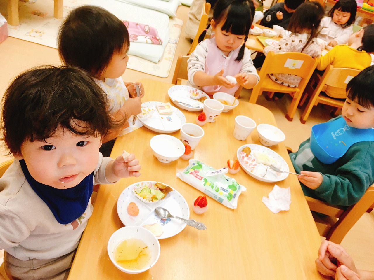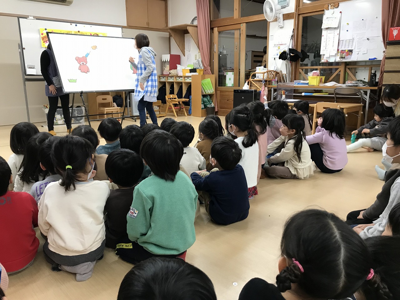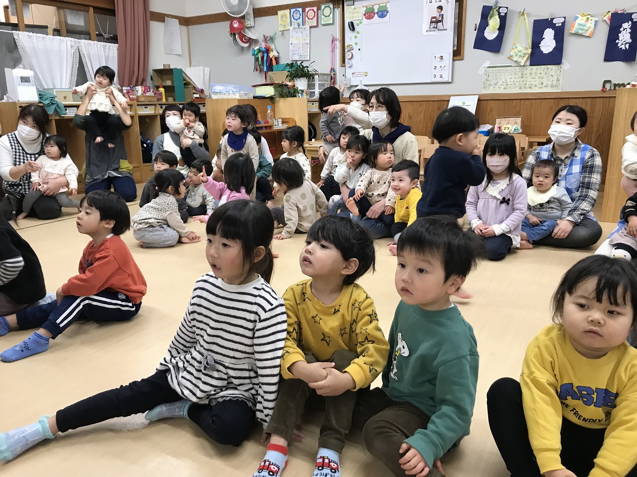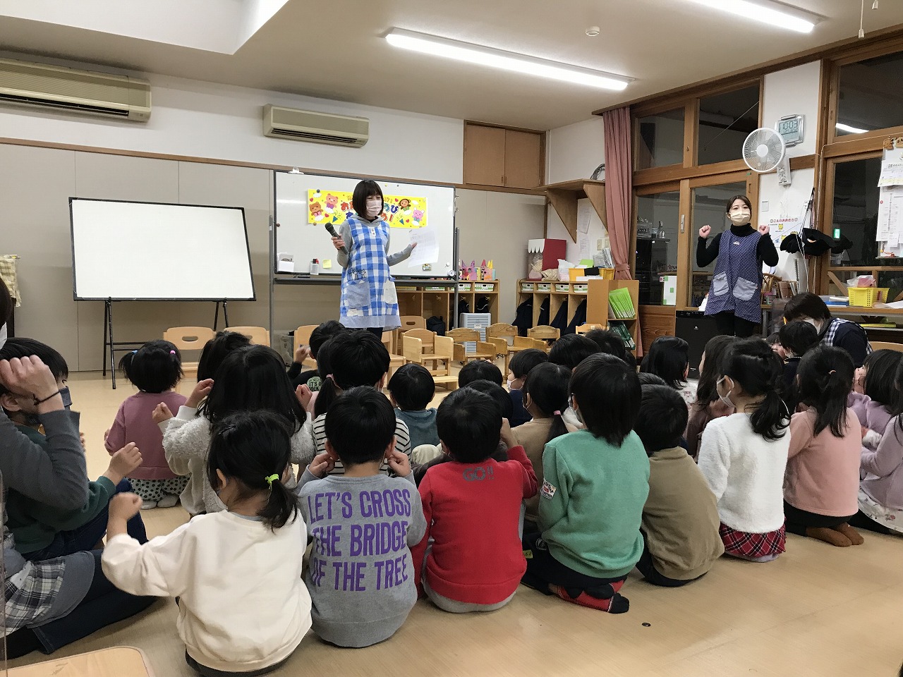 1月生まれのお誕生日会がありました。インタビューでは少しドキドキしながらも、各クラスによって質問が違い、『おおきくなったら』や『好きな食べ物』など、それぞれがとてもかっこよく答えていました!友だちも大きな拍手でお祝いの気持ちを伝えていました。自分のお誕生日は特別な日、とってもうれしそうな1月生まれのお友だちでした。園長先生にプレゼントをもらって、先生の出し物を見ました。パネルシアターでは動物たちが『おたんじょうびおめでとう!』とみんなでお祝いをしてくれました!しんけんなまなざしで見ていた子ども達です。たんぽぽ組さんやすみれ組さんも一緒に見学しました。