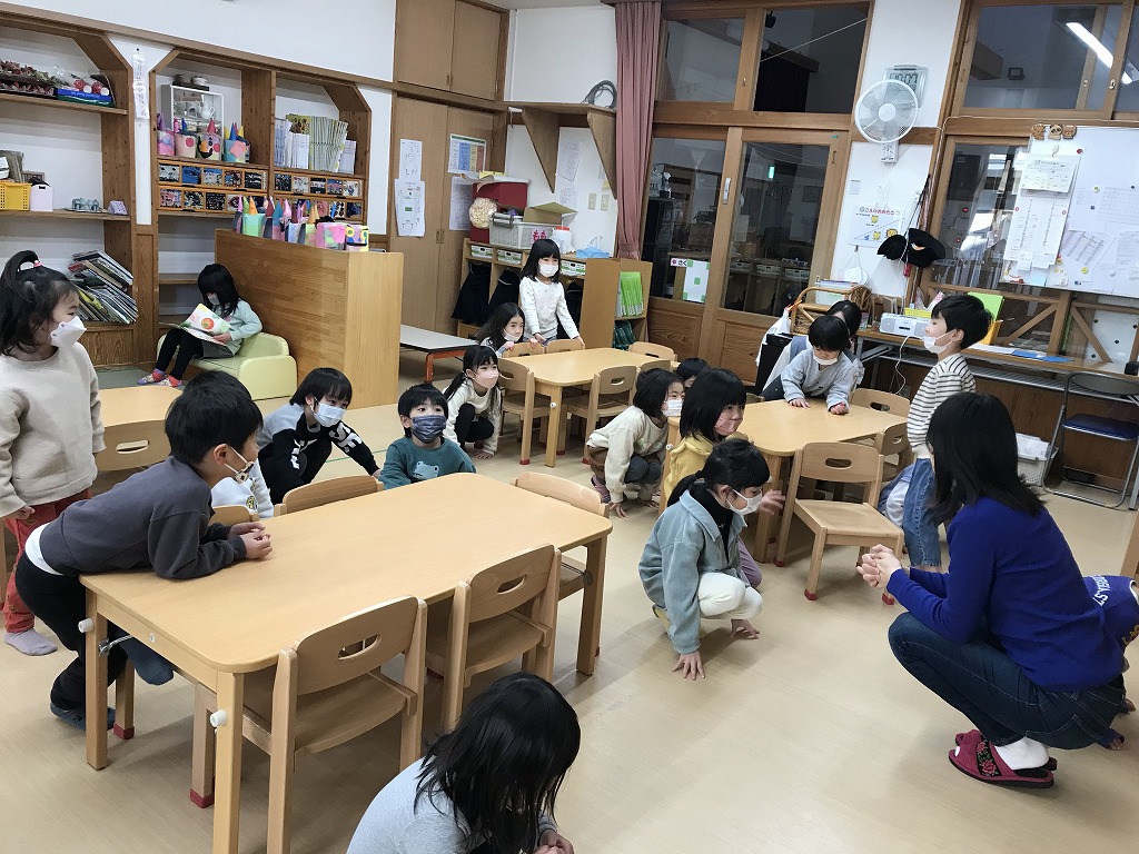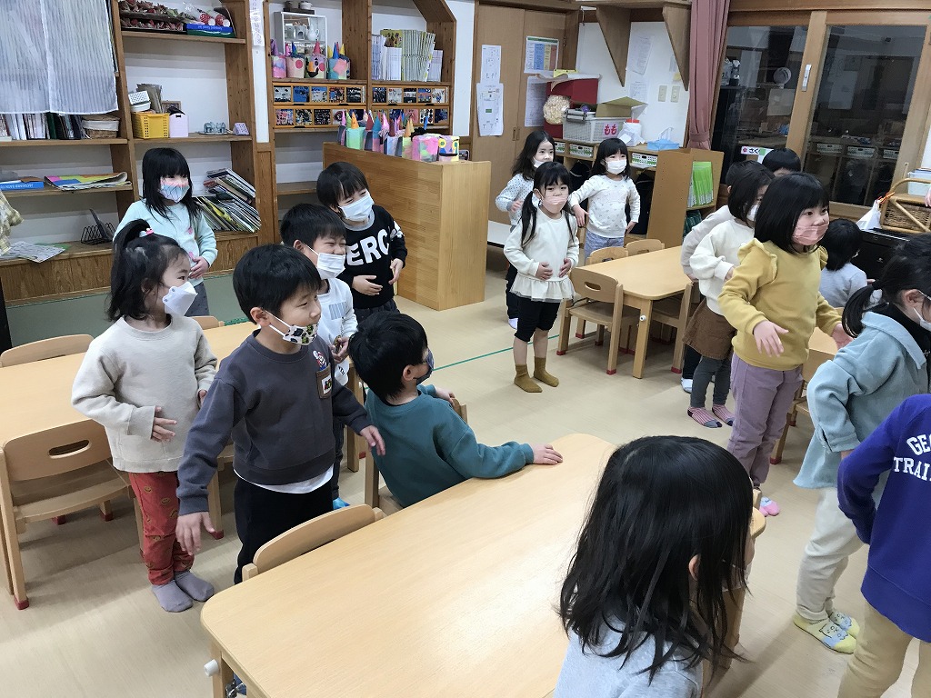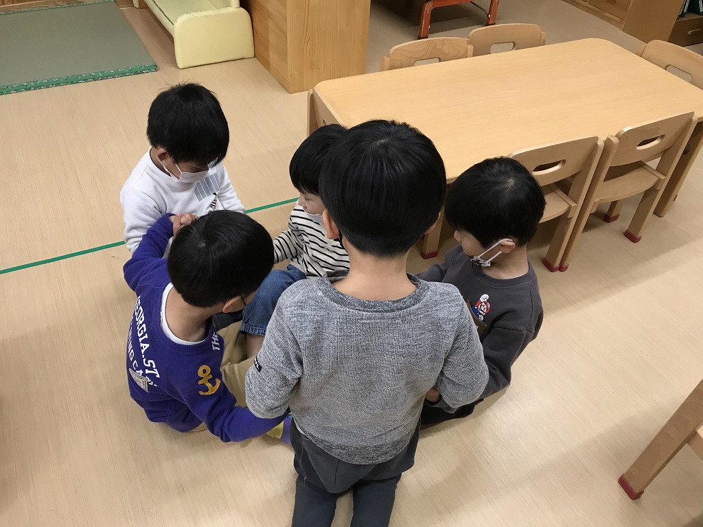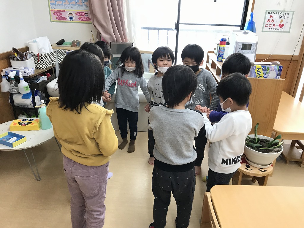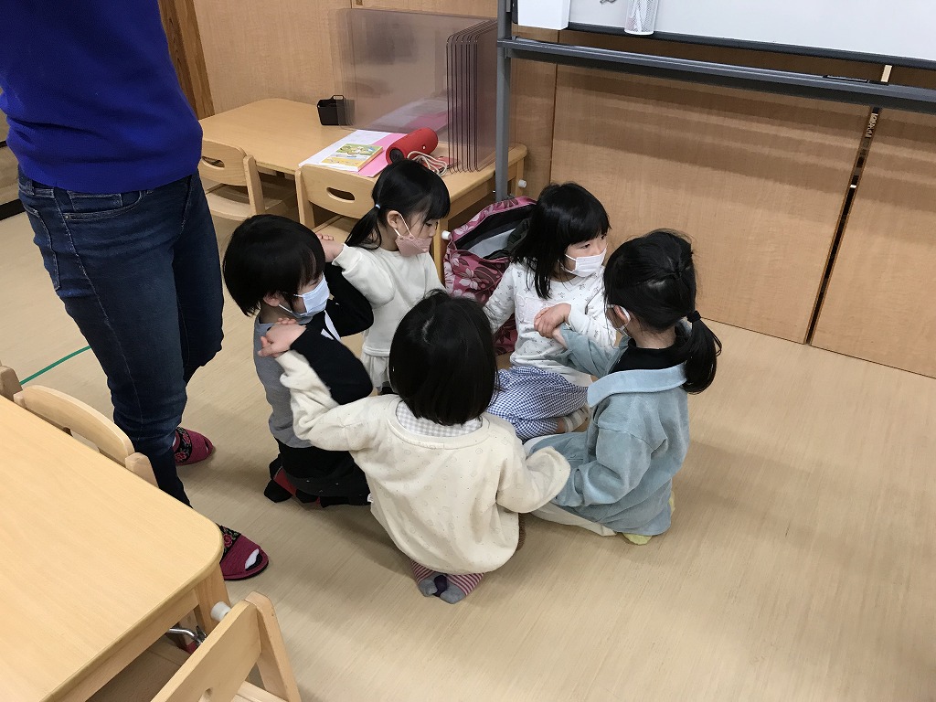 その後の楽しいゲーㇺの時間はお友達集めゲーㇺをしました。数字を聞いてその人数で集まります。2人や5人は簡単でしたが、10人になると少し難しい様子・・・。1,2、3…と数を数えていきながら、しっかり10人集まることができました!ゲームや体を動かしながら楽しく英語を学んでいます!